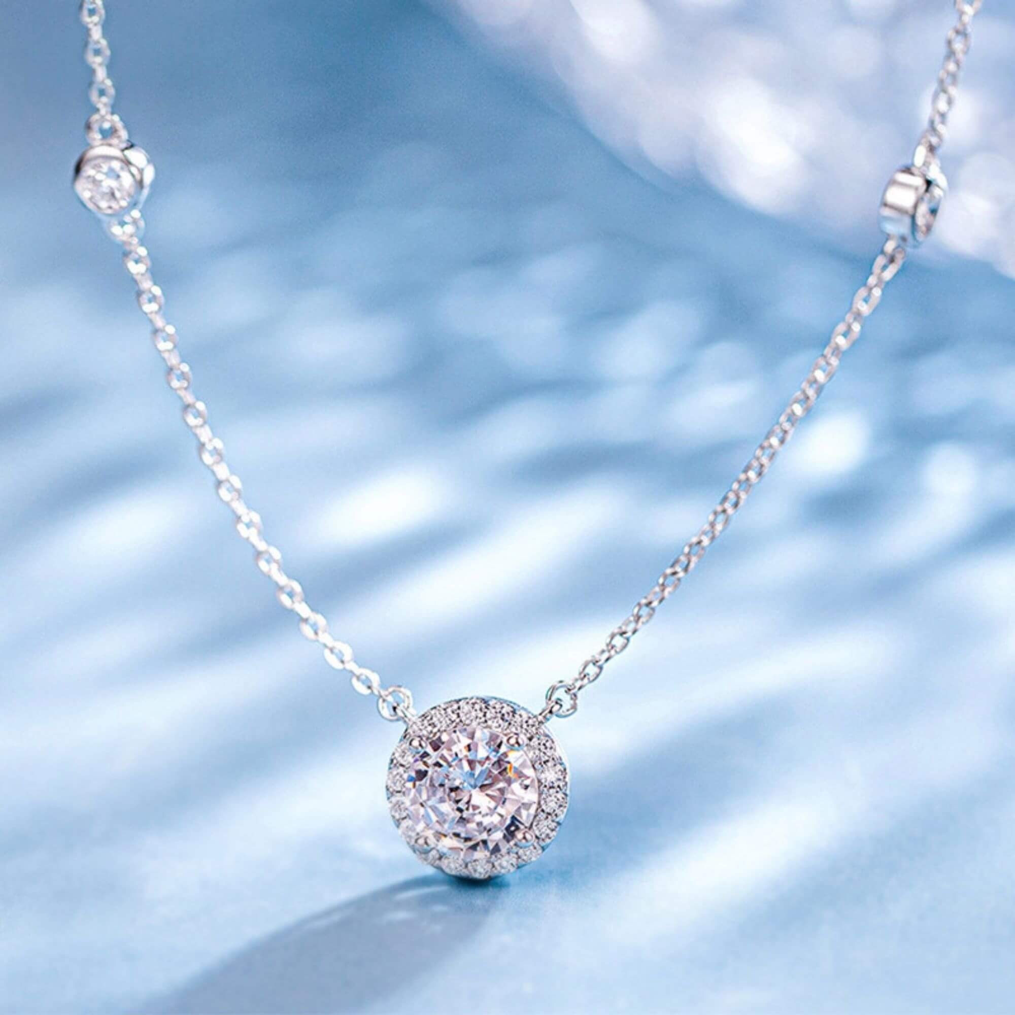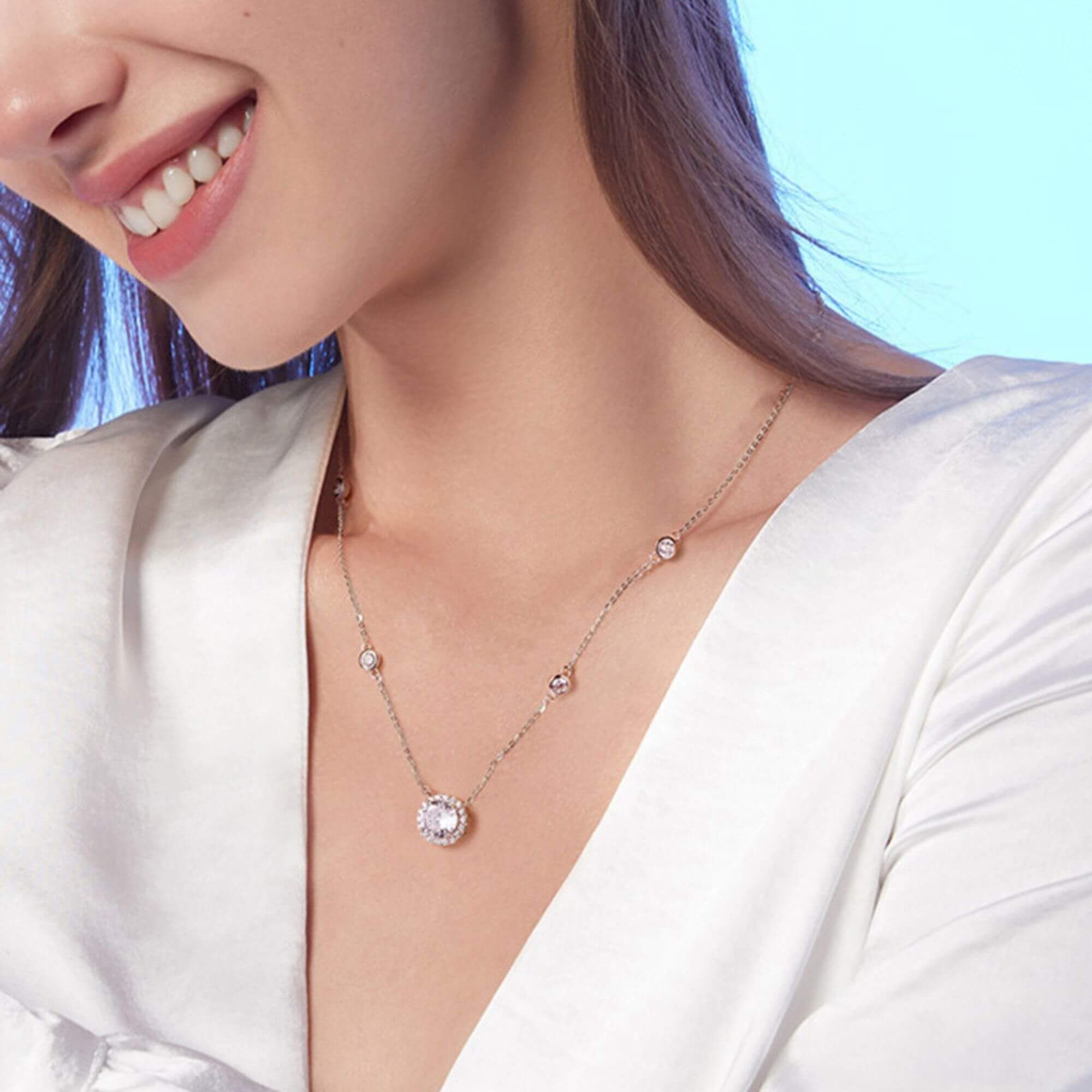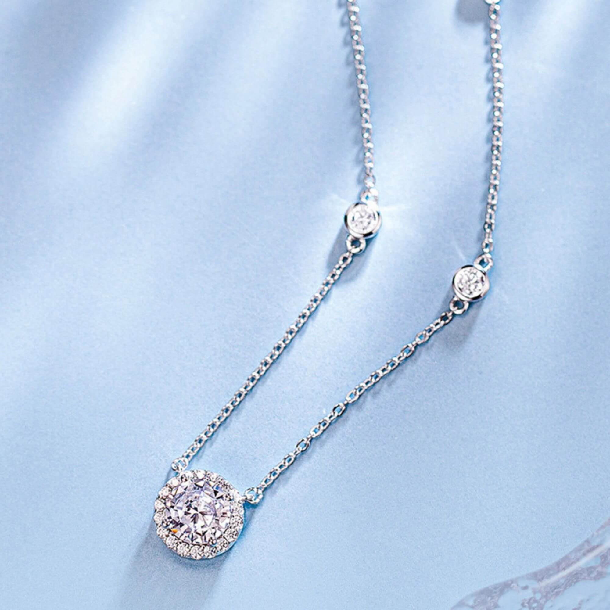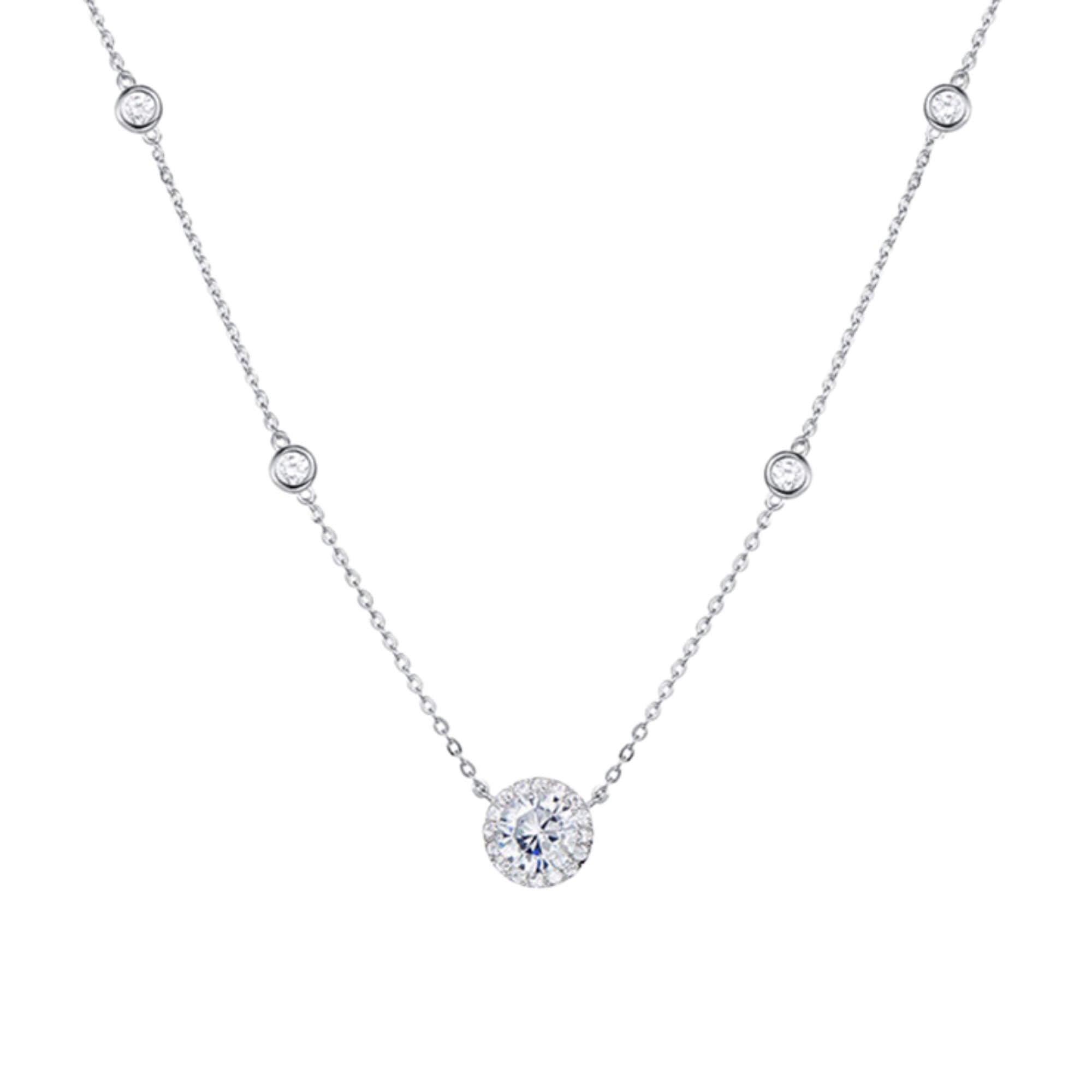 Deze sterlingzilveren ketting, versierd met glinsterende zirkoniasteen, straalt delicate charme uit. De lengte is gerangschikt met vier kleinere edelstenen, waardoor een boeiende en symmetrische schittering ontstaat. De stralende elegantie van dit kledingstuk maakt het de perfecte finishing touch voor zowel alledaagse outfits als speciale gelegenheden.