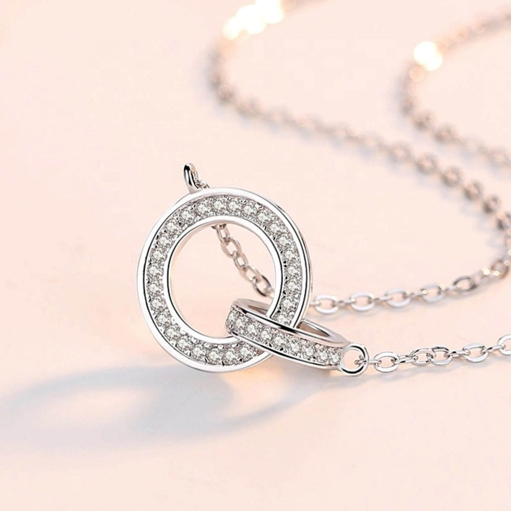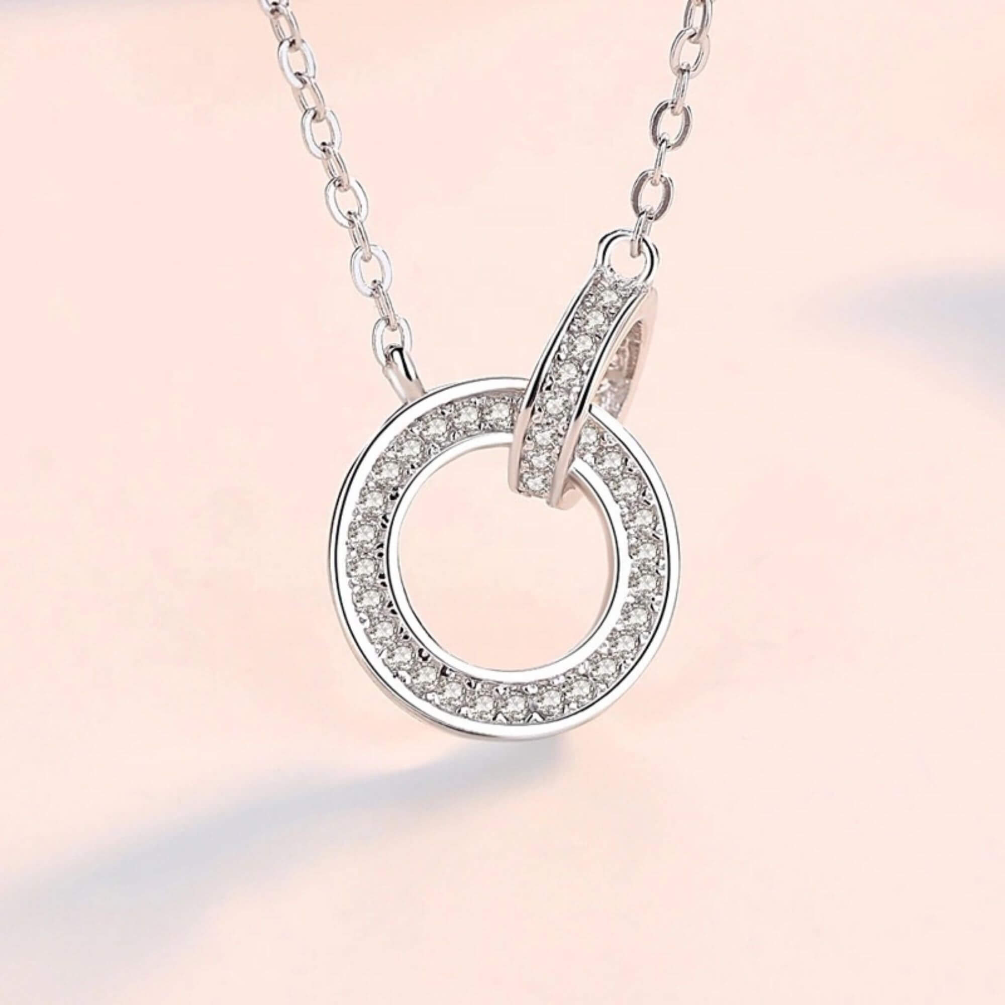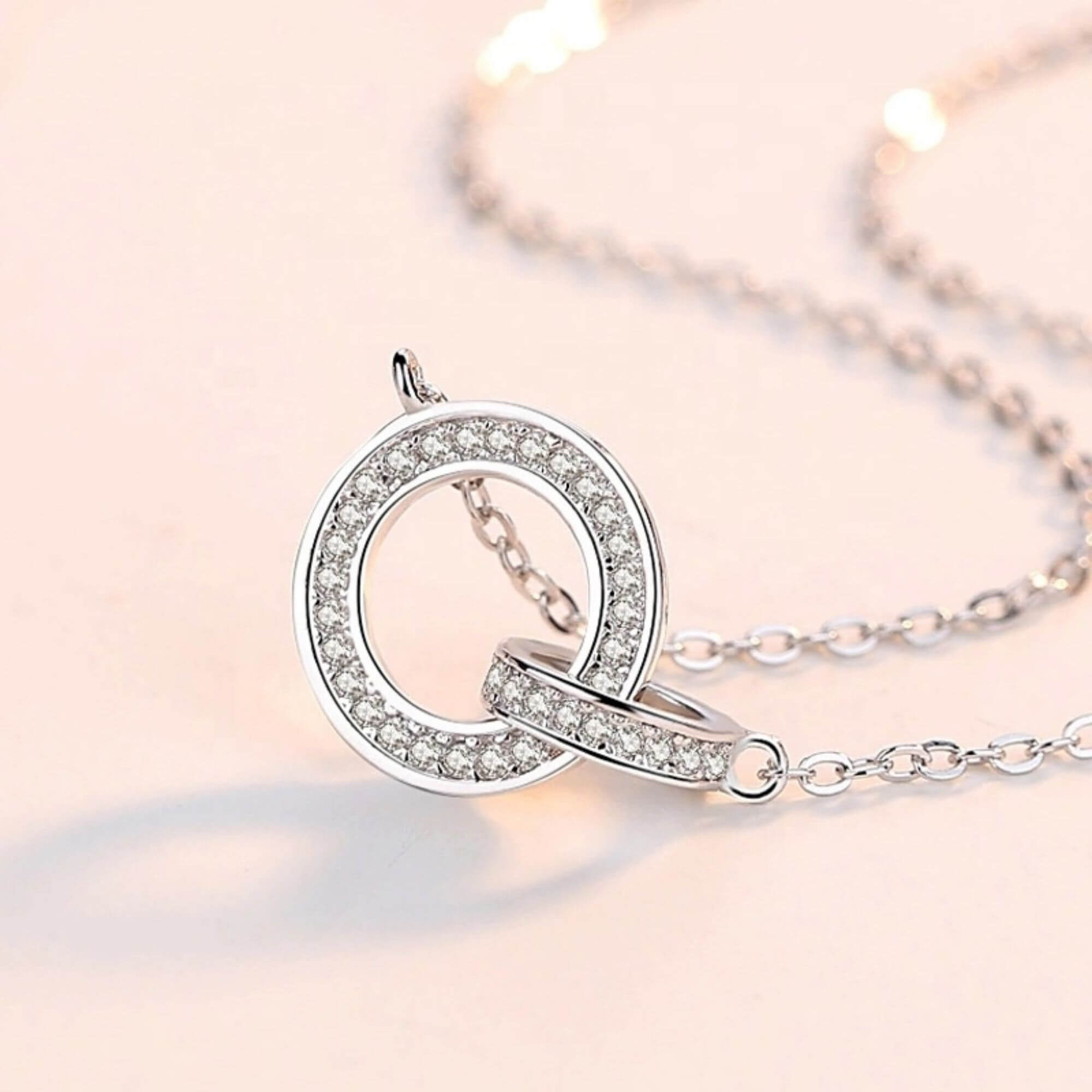 Deze stijlvolle zilveren ketting, versierd met kleine zirkonia steentjes, heeft twee verenigde sferen die de harmonie van verbonden zielen symboliseren. Het is een stuk dat elegantie belichaamt en liefde uitdrukt door zijn betekenisvolle ontwerp. Perfect voor degenen die sieraden waarderen met een diepere betekenis; deze ketting is niet alleen een modeverklaring maar ook een symbool van eenheid en genegenheid.