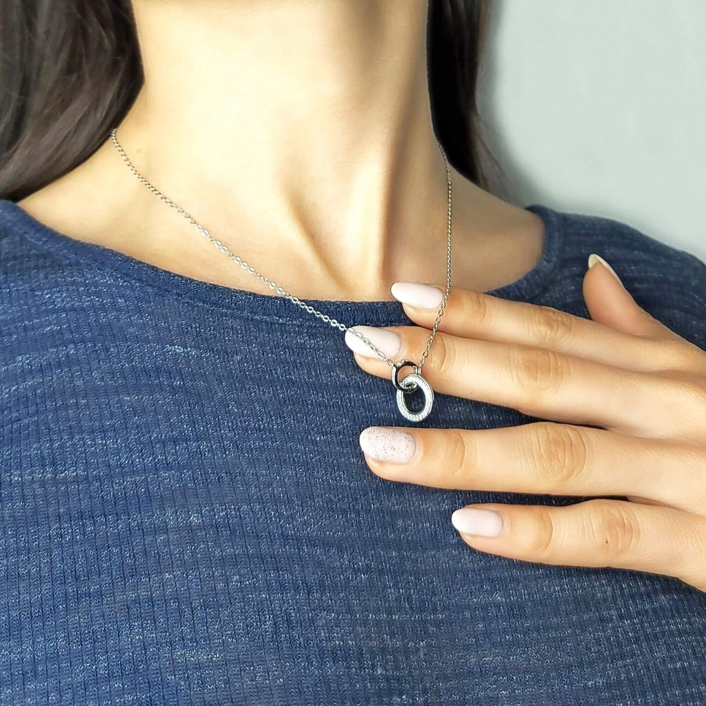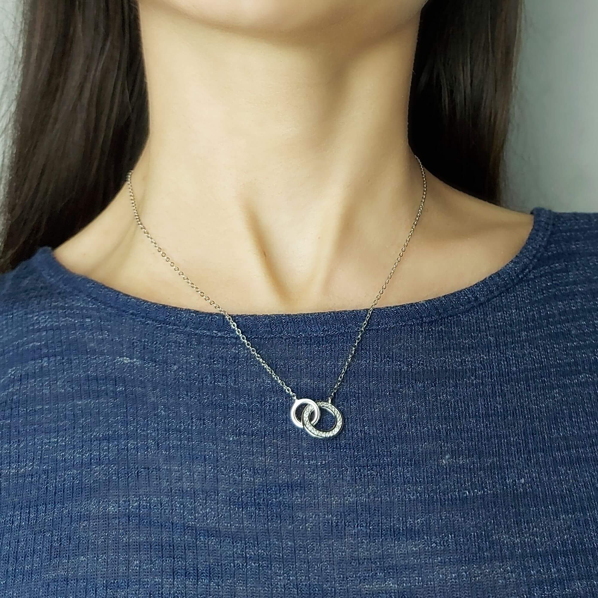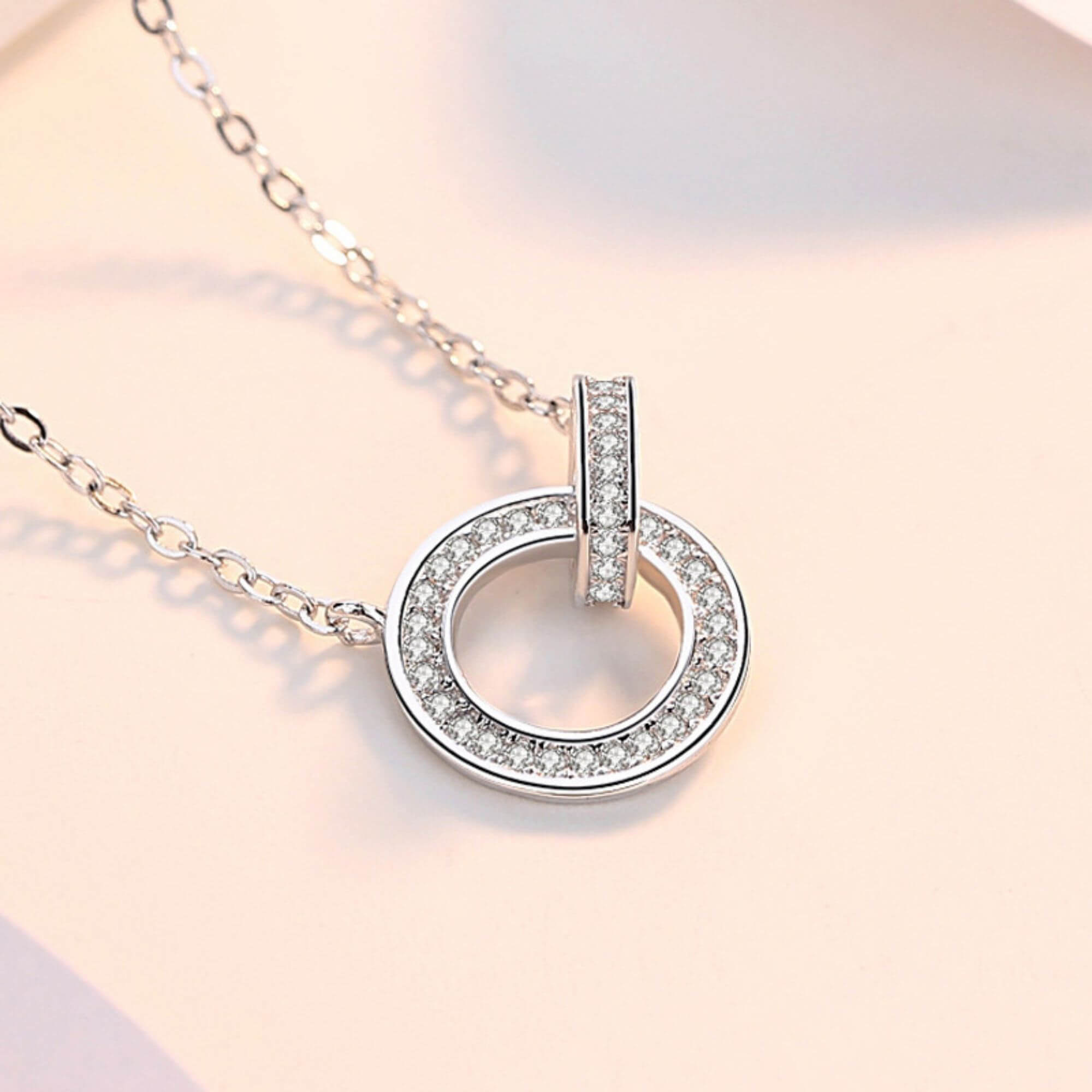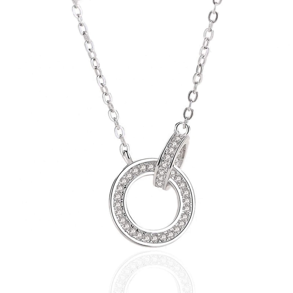 Deze stijlvolle zilveren ketting, versierd met kleine zirkonia steentjes, heeft twee verenigde sferen die de harmonie van verbonden zielen symboliseren. Het is een stuk dat elegantie belichaamt en liefde uitdrukt door zijn betekenisvolle ontwerp. Perfect voor degenen die sieraden waarderen met een diepere betekenis; deze ketting is niet alleen een modeverklaring maar ook een symbool van eenheid en genegenheid.