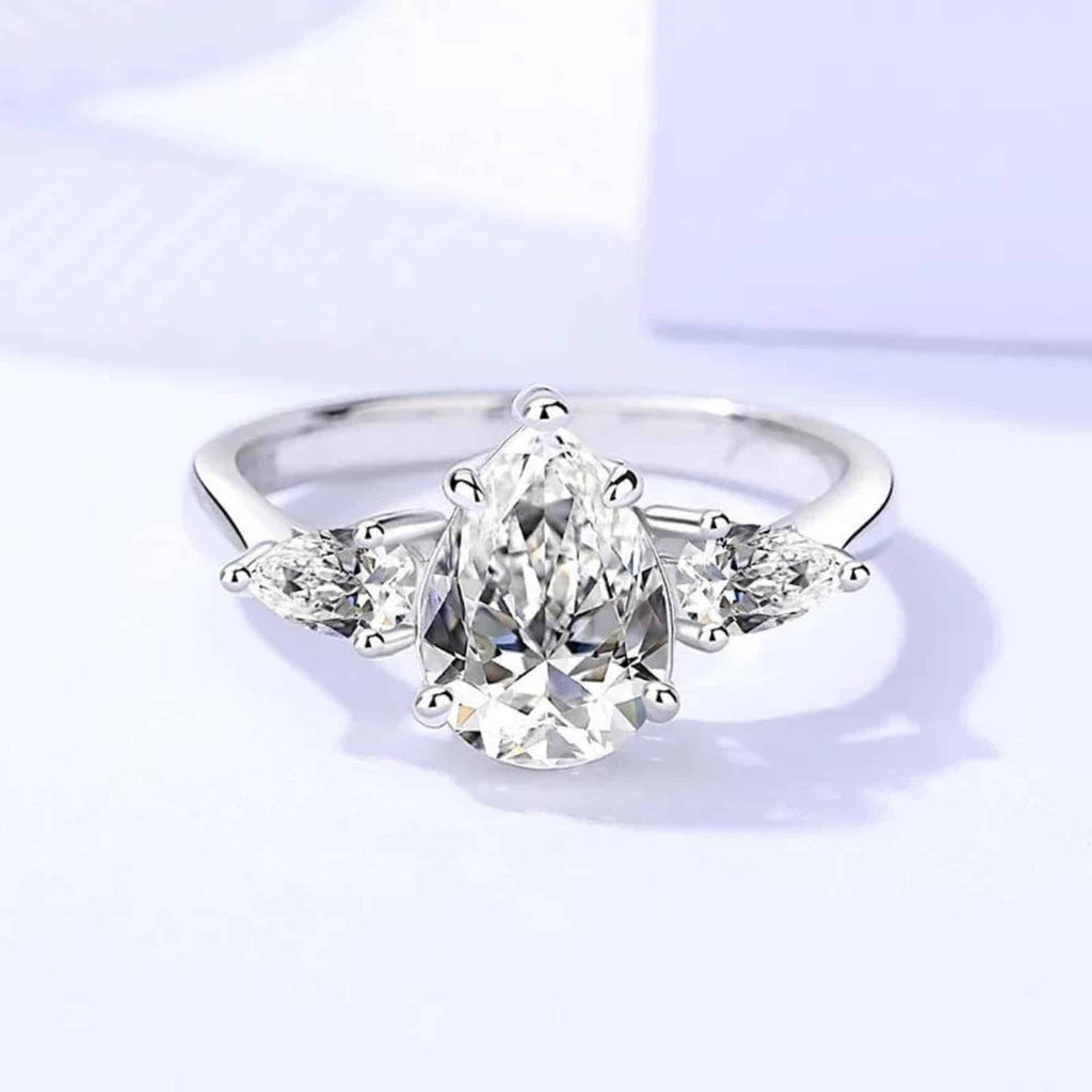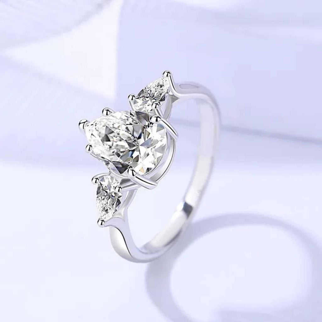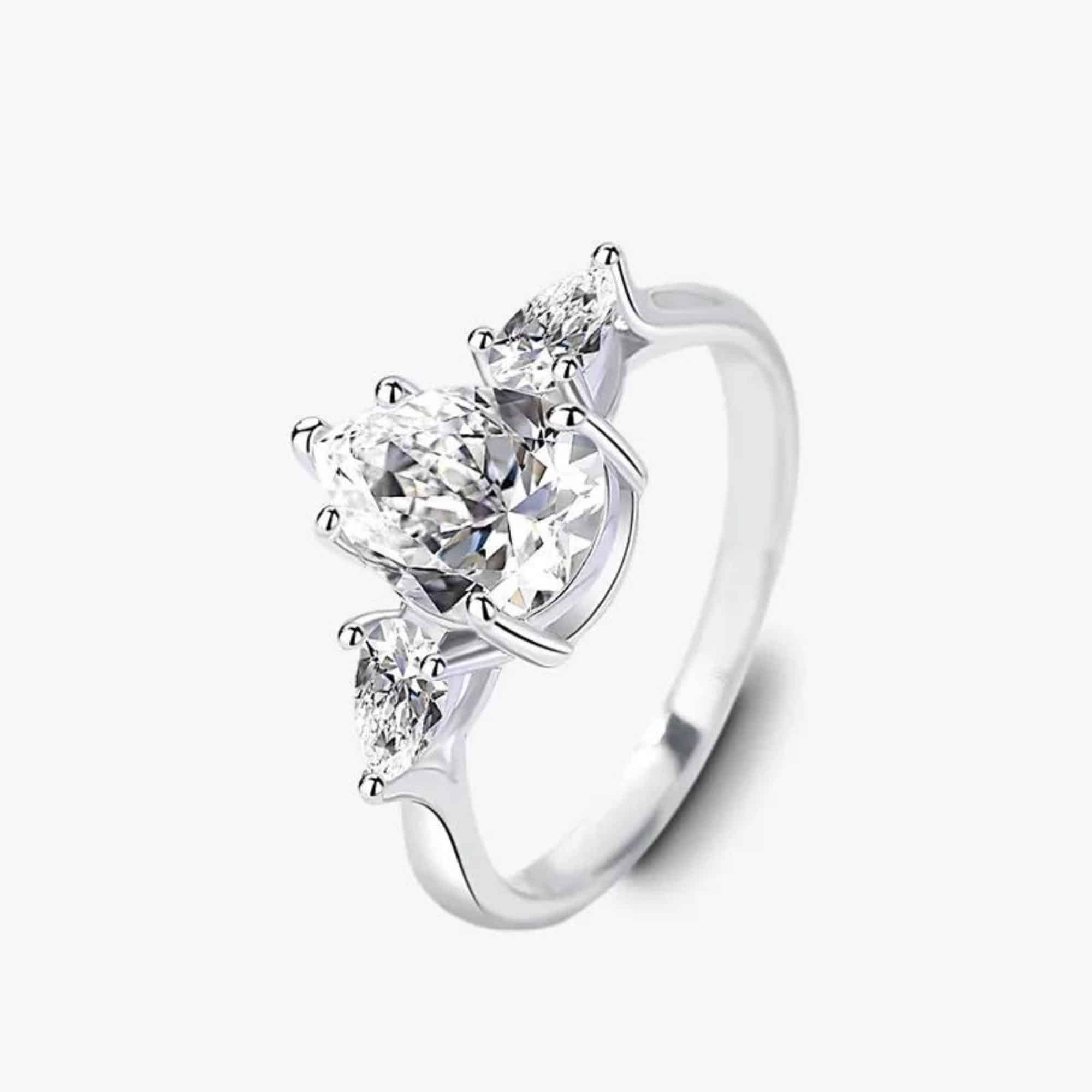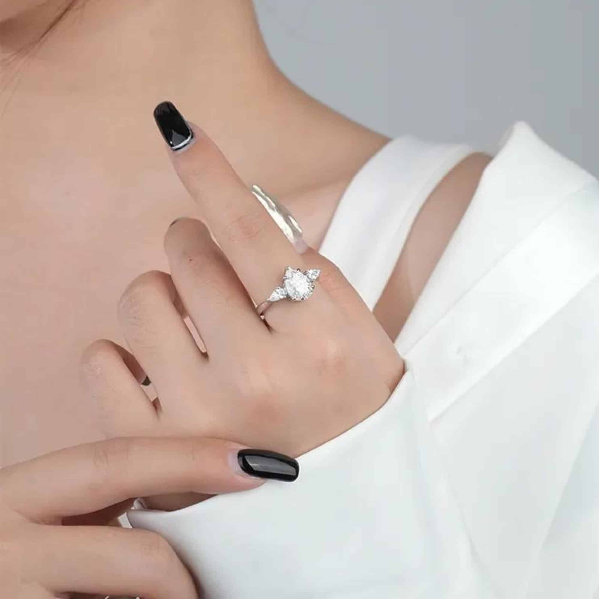 Deze zilveren ring straalt schittering uit en beschikt over een drietal edelstenen, met een oogverblindende moissaniet van één karaat in het midden, sierlijk begeleid door twee briljante zirkonia's. Het prachtige ontwerp transformeert dit stuk in een tijdloze schat voor kenners van klassieke sieraden. De opmerkelijke duurzaamheid en boeiende schittering van moissaniet wedijveren met die van diamanten, waardoor het met het blote oog bijna niet van elkaar te onderscheiden is.