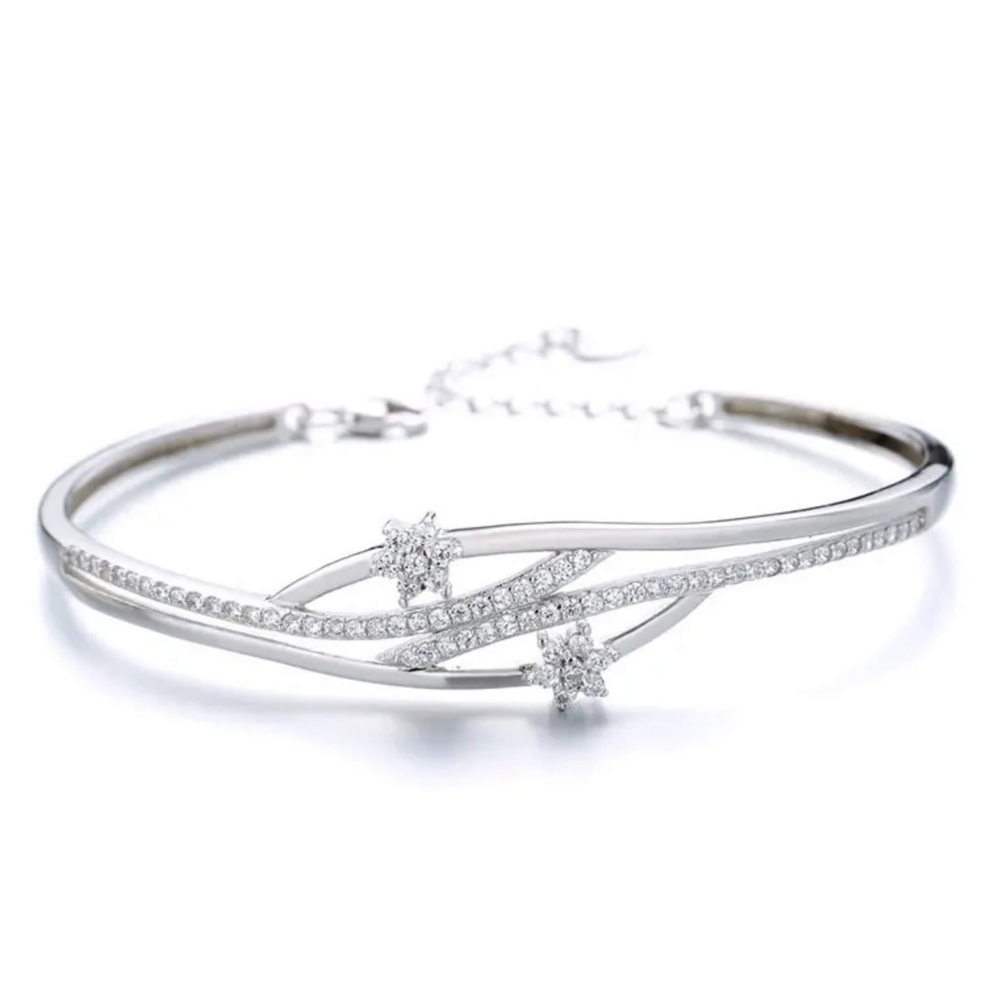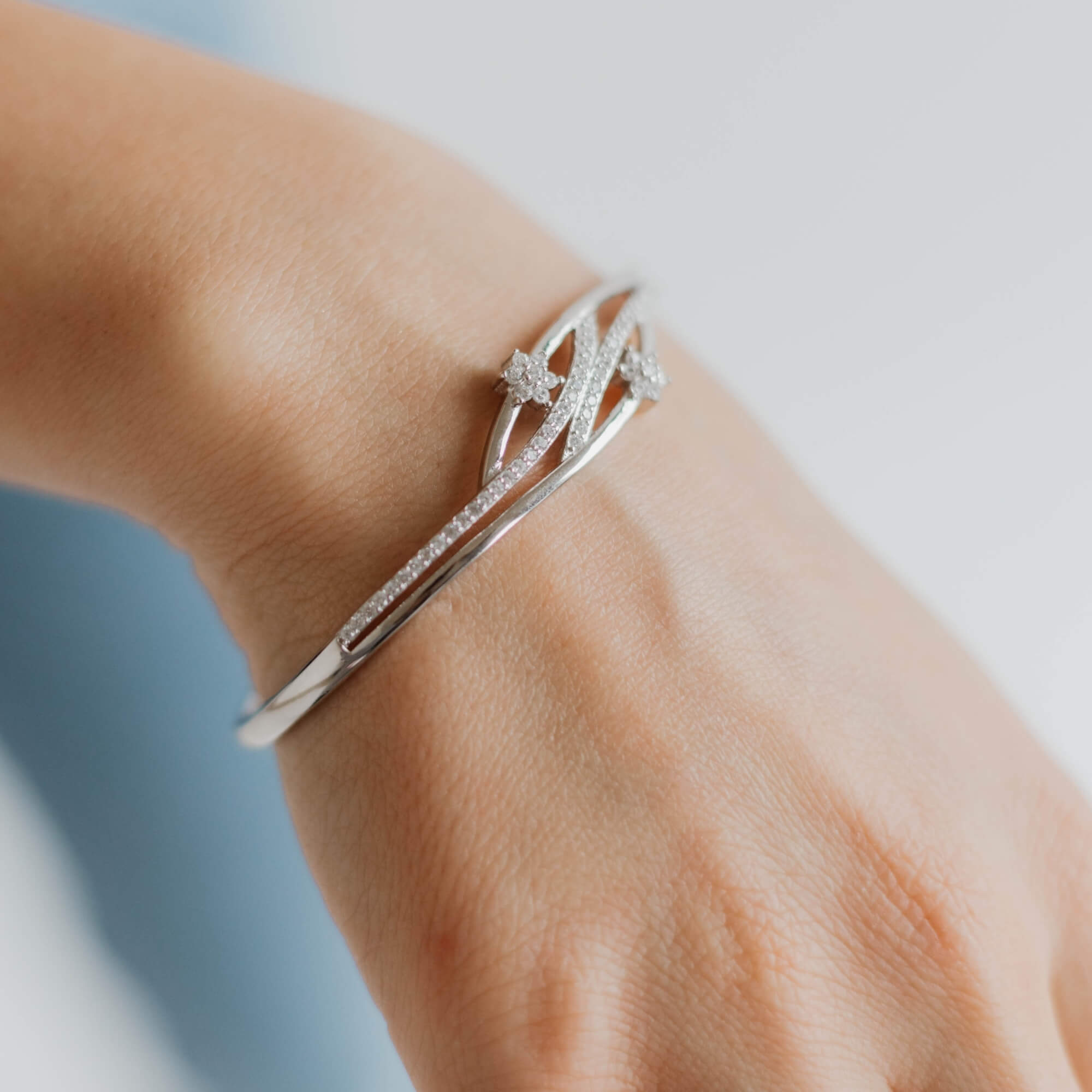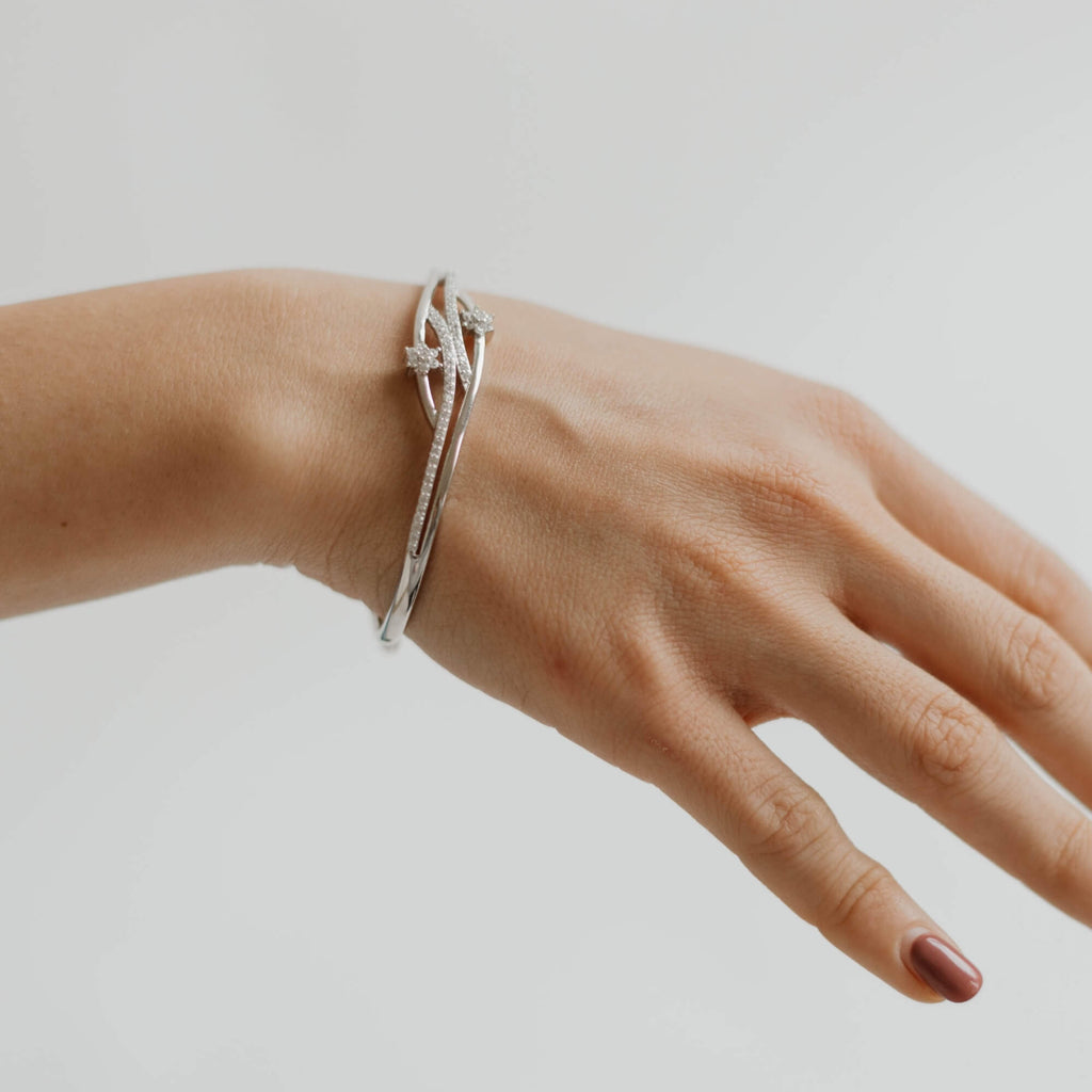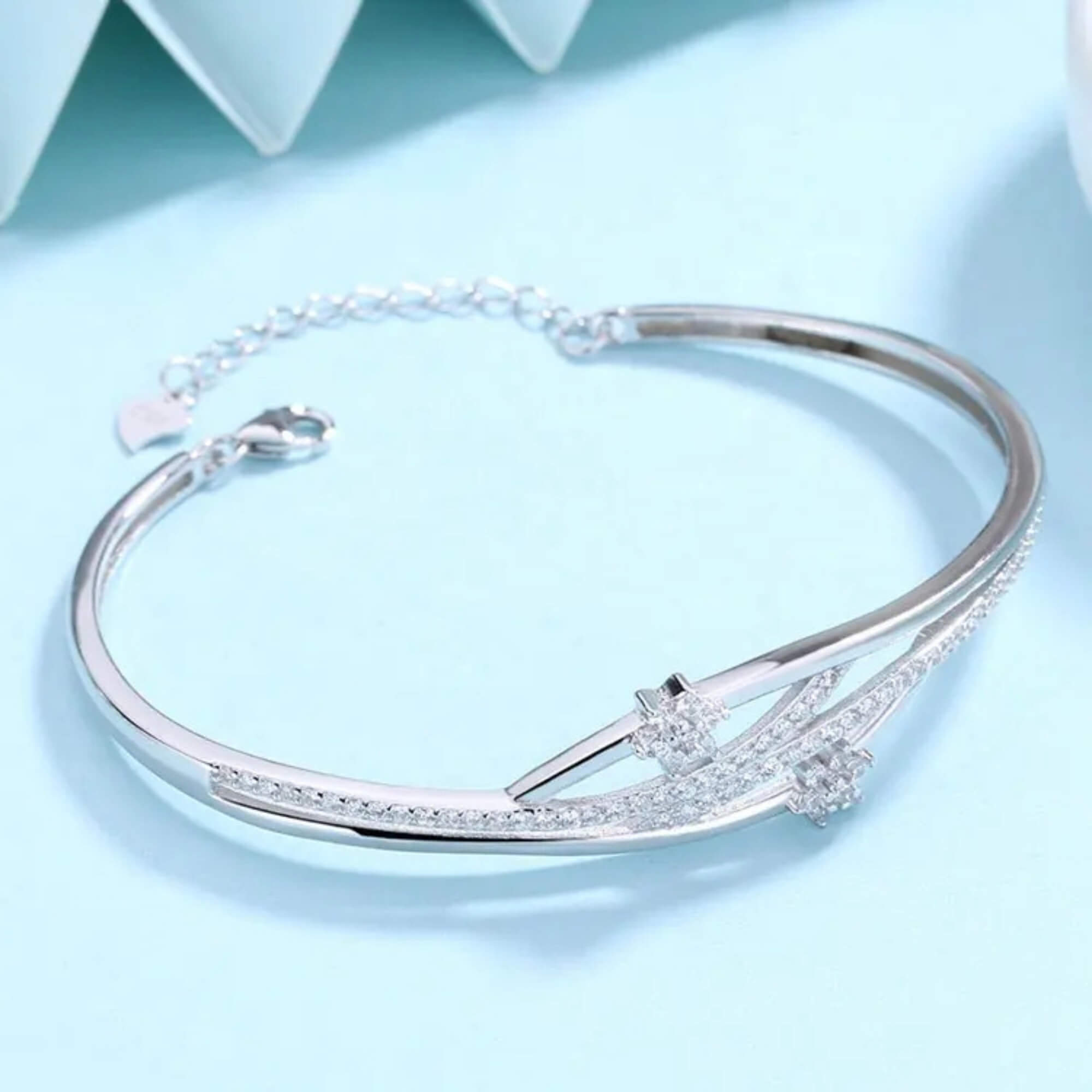 Zilveren armband, een perfecte harmonie van oogverblindende schoonheid en verfijnde symmetrie. Versierd met een glinsterende compositie van zirkonia's aan de bovenkant, vangt het ontwerp moeiteloos licht en beweging, wat zorgt voor een opvallende en elegante look.