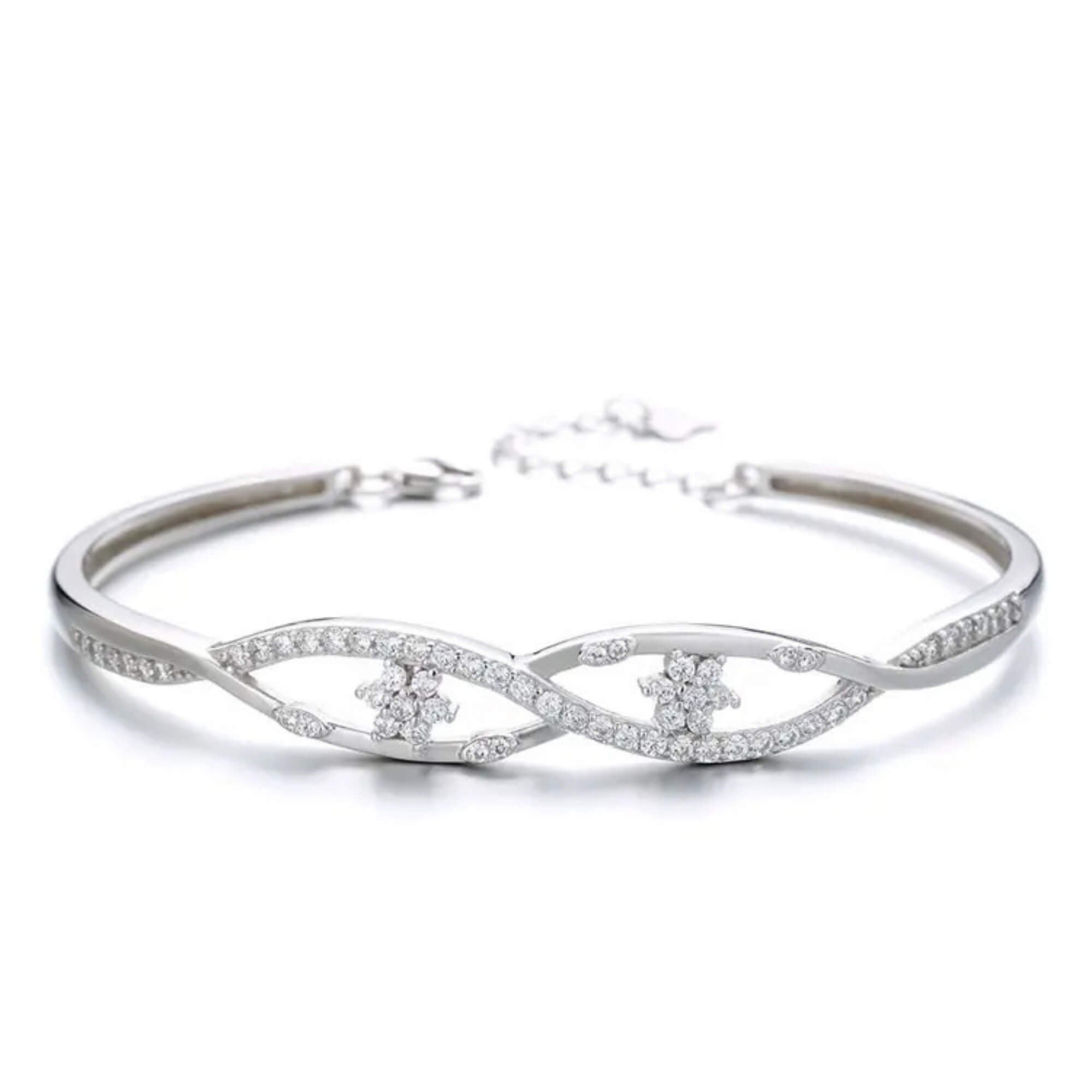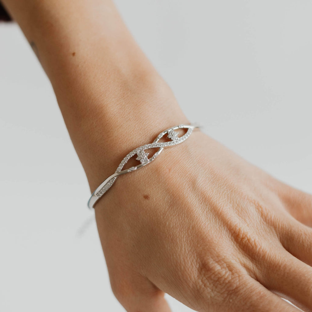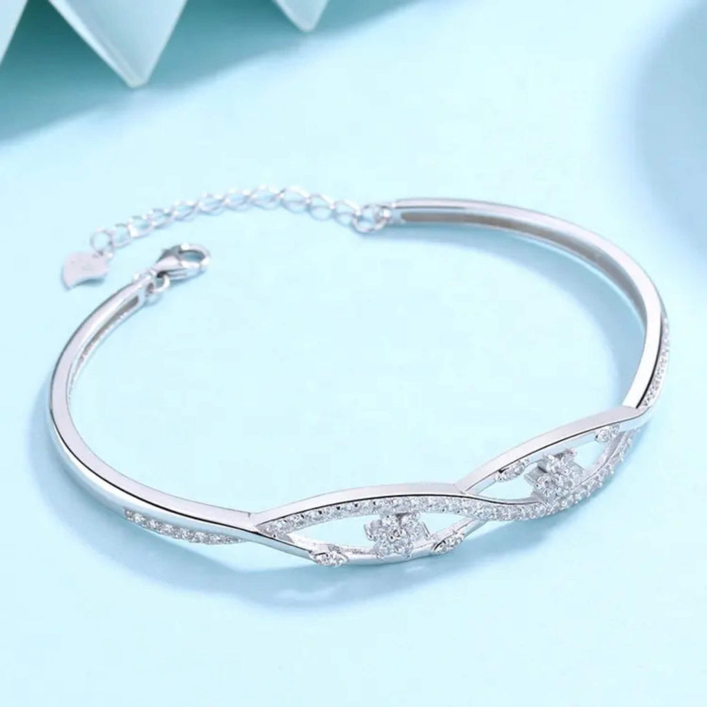 Deze zilveren bangle combineert elegantie en artisticiteit in één ontwerp. Sierlijke rondingen verweven zich met delicate bloemelementen, elk geaccentueerd door glinsterende zirkonia's die het licht vangen bij elke beweging. De verstelbare sluiting zorgt voor een comfortabele pasvorm, waardoor hij zowel praktisch als prachtig is.