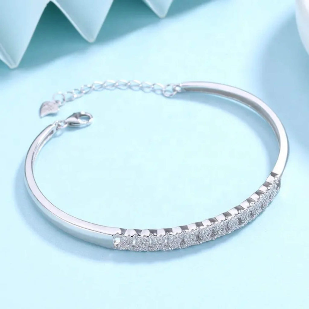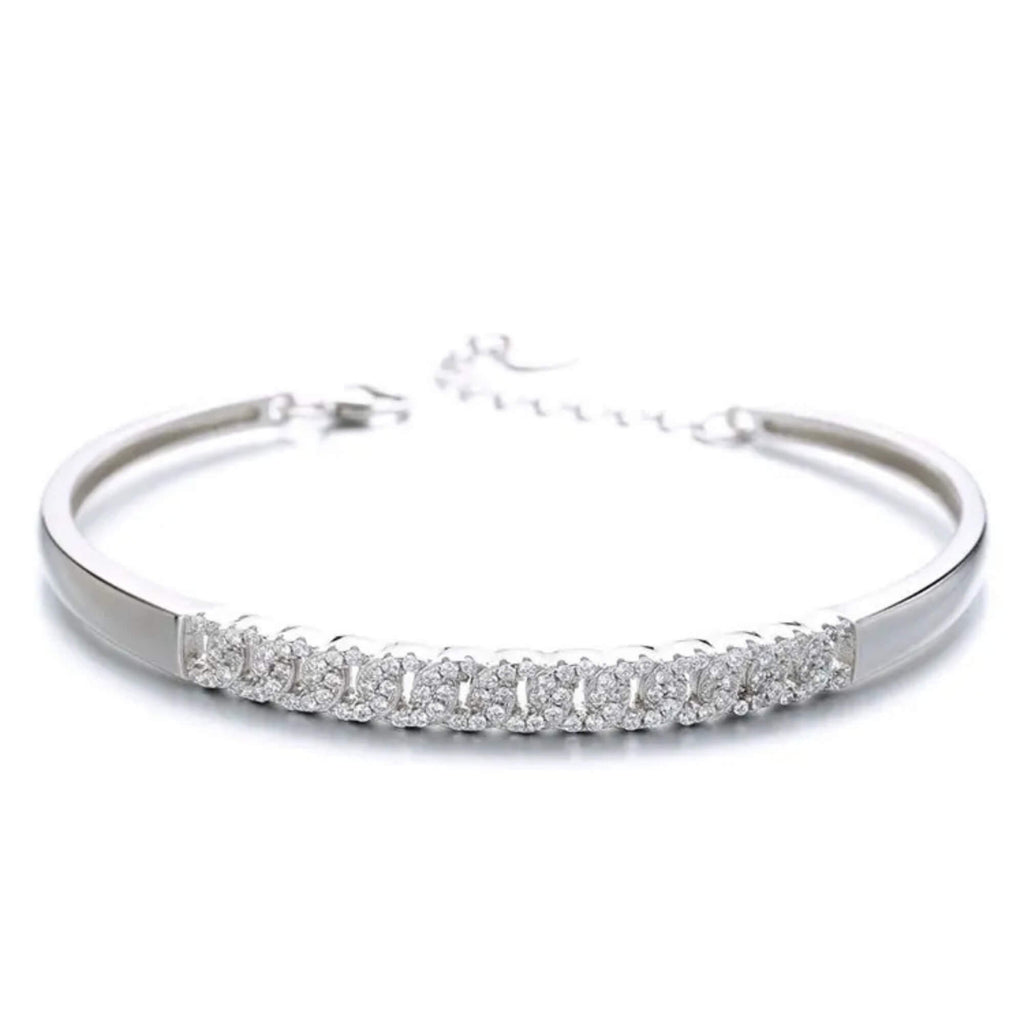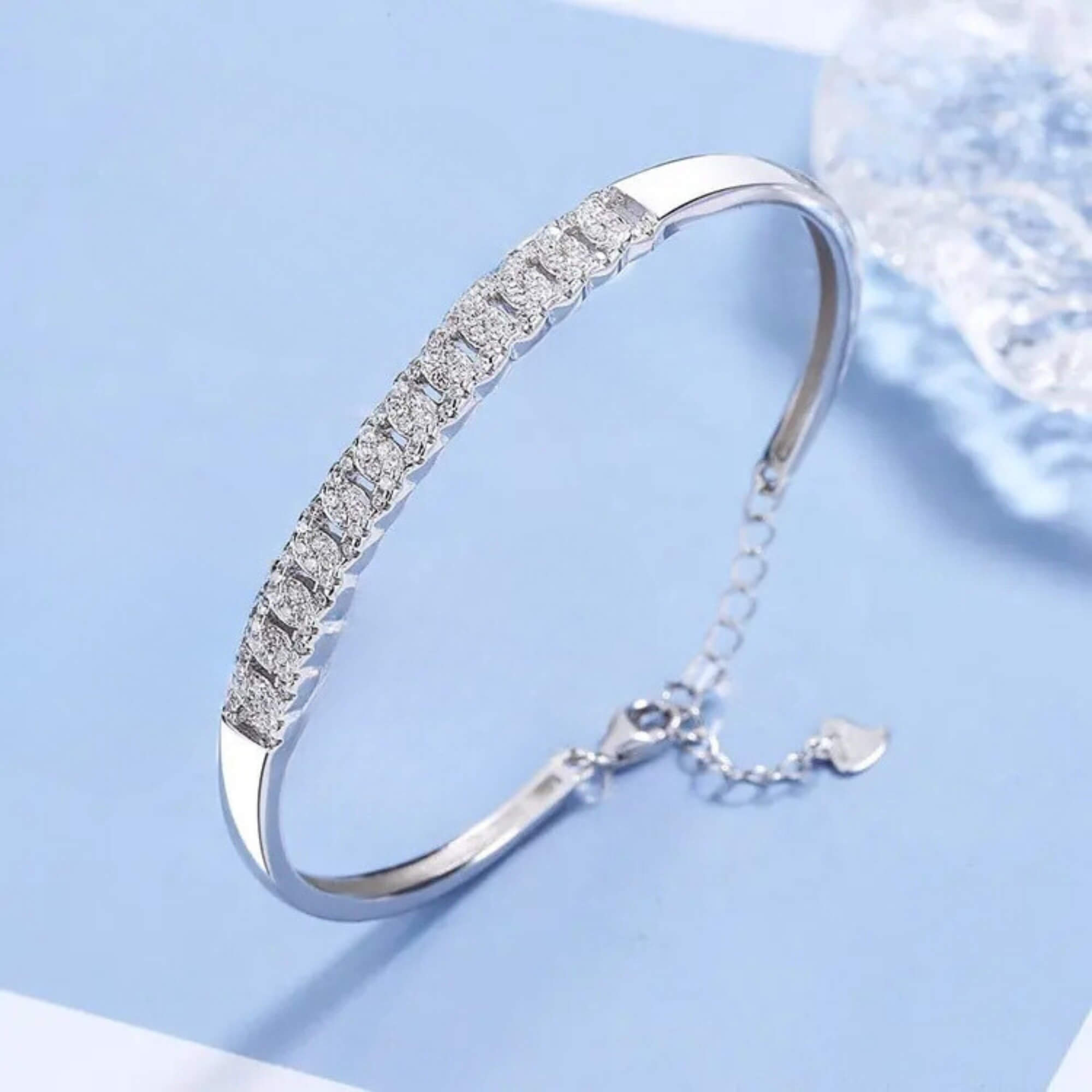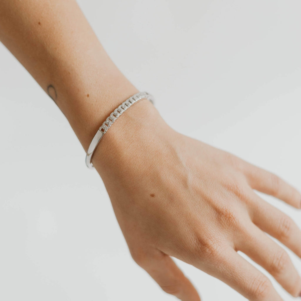 Deze opvallende zilveren bangle herdefinieert elegantie met zijn gedurfde maar verfijnde ontwerp. Een lichtgevende rij zirkonia's siert het midden en creëert een betoverend lichtspel, terwijl de strakke, gepolijste zijkanten een eigentijds tintje toevoegen. Het perfecte sieraad voor iedereen die van een statement piece houdt.