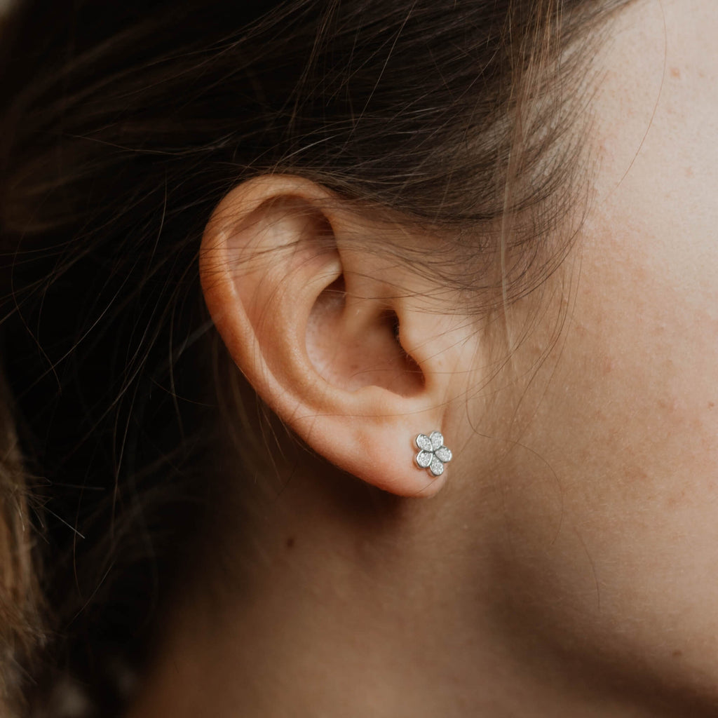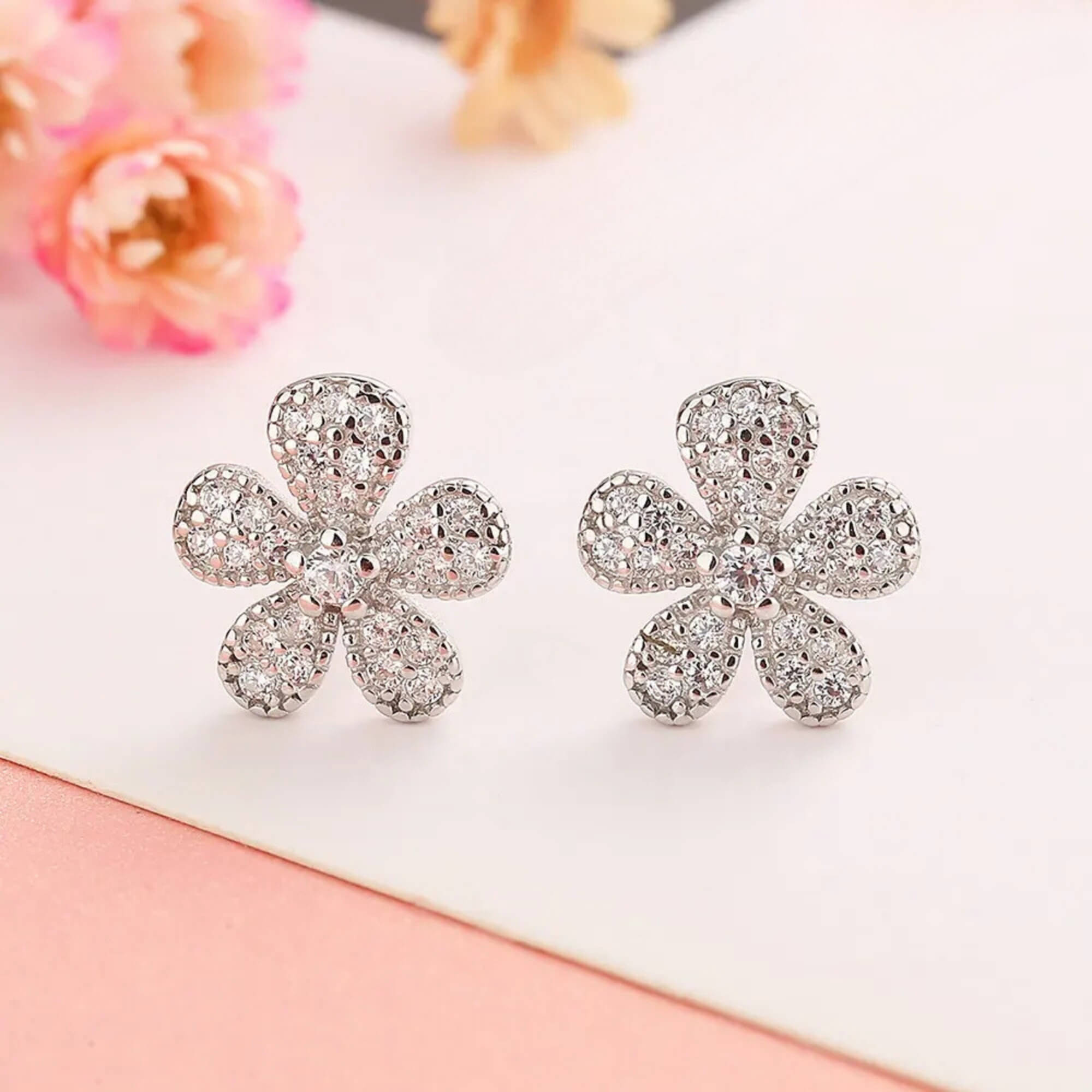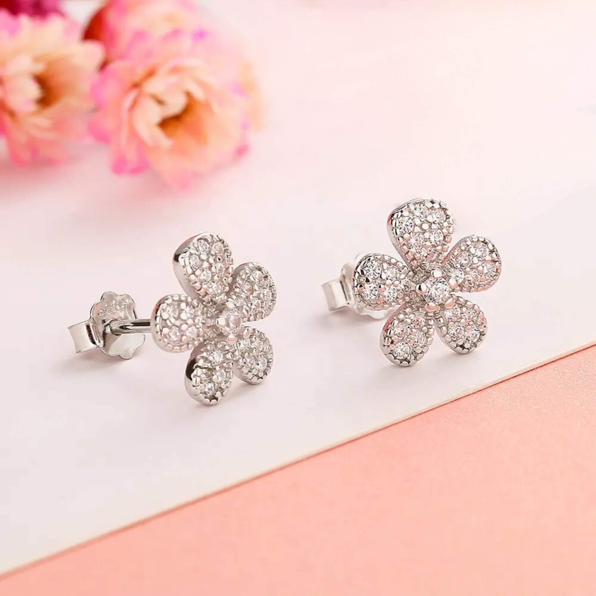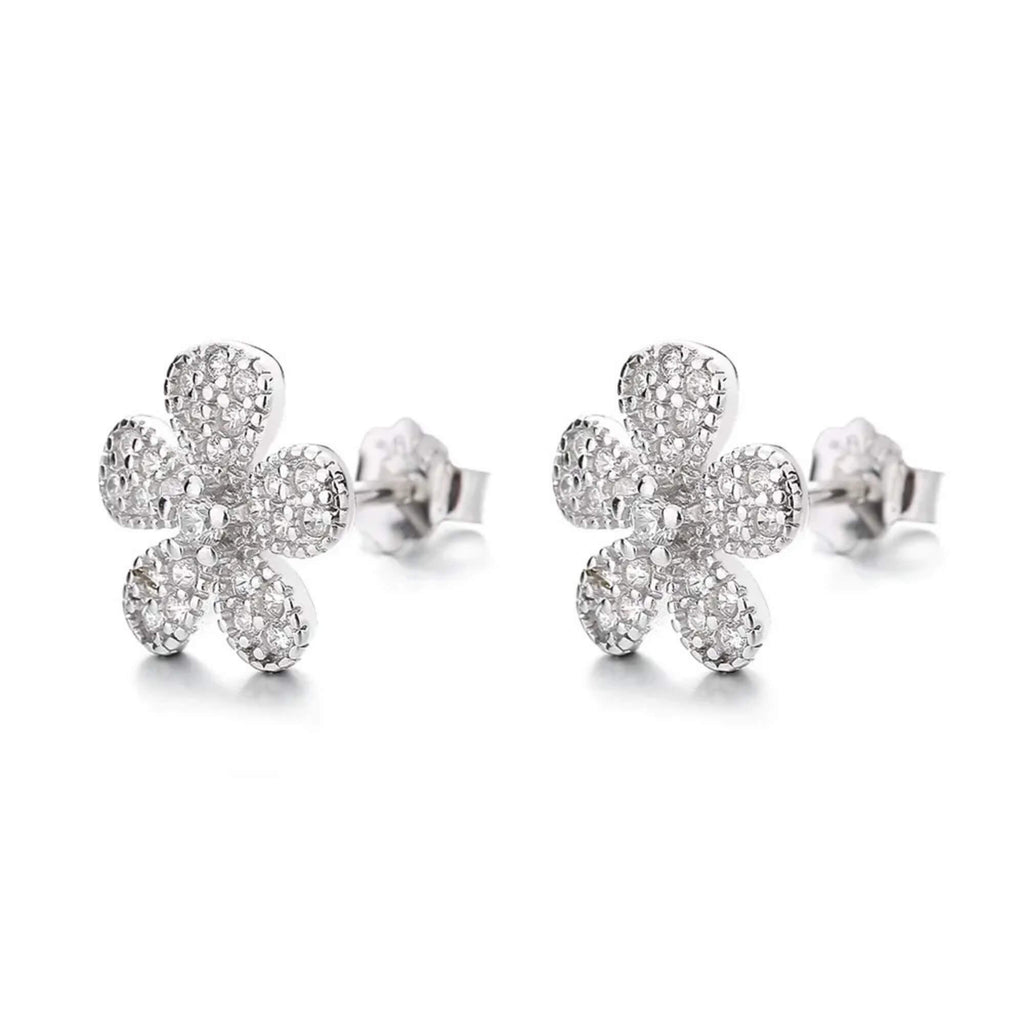 Een paar elegante zilveren oorknopjes die de delicate schoonheid van bloeiende bloemen vastleggen, met een stralend bloemmotief versierd met schitterende zirkonia's. Met de perfecte balans tussen charme en verfijning zijn ze een symbool van vrouwelijkheid en gratie, ontworpen om je moeiteloos te laten stralen.