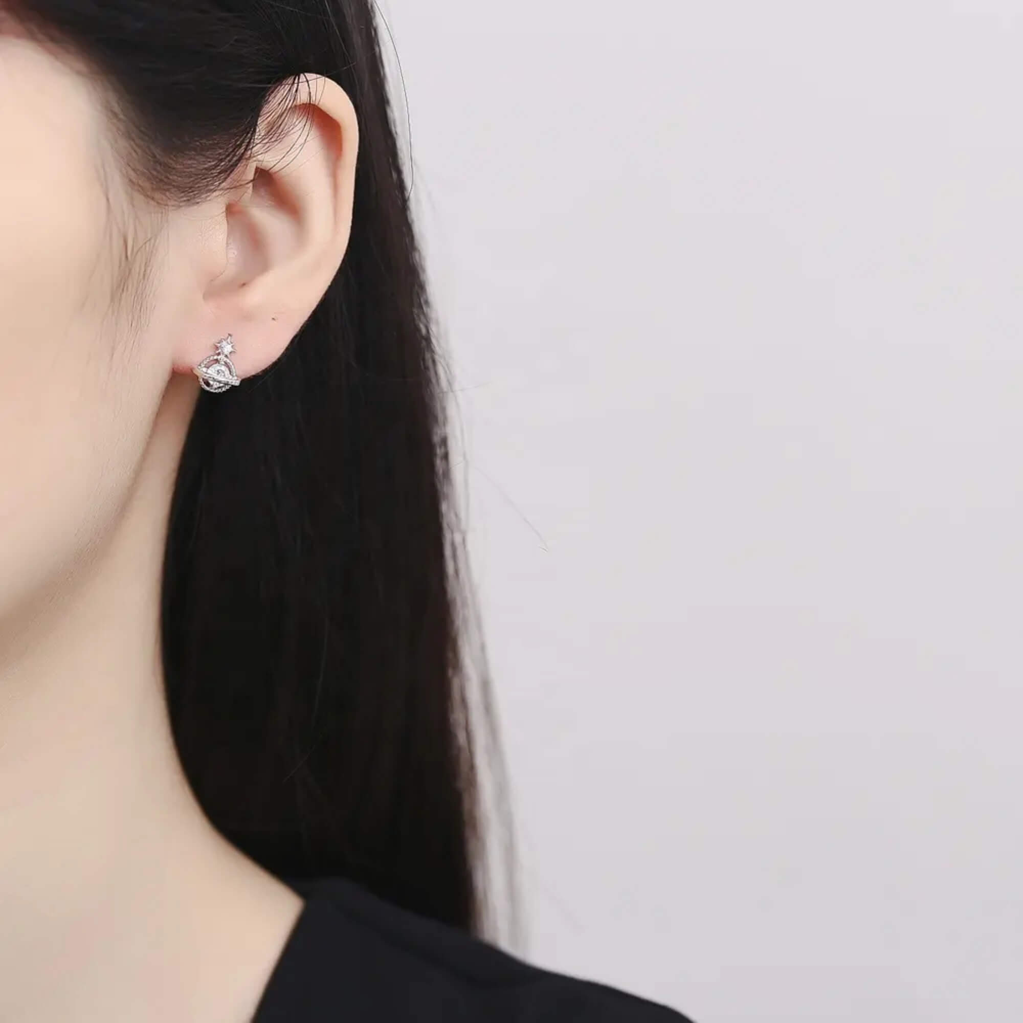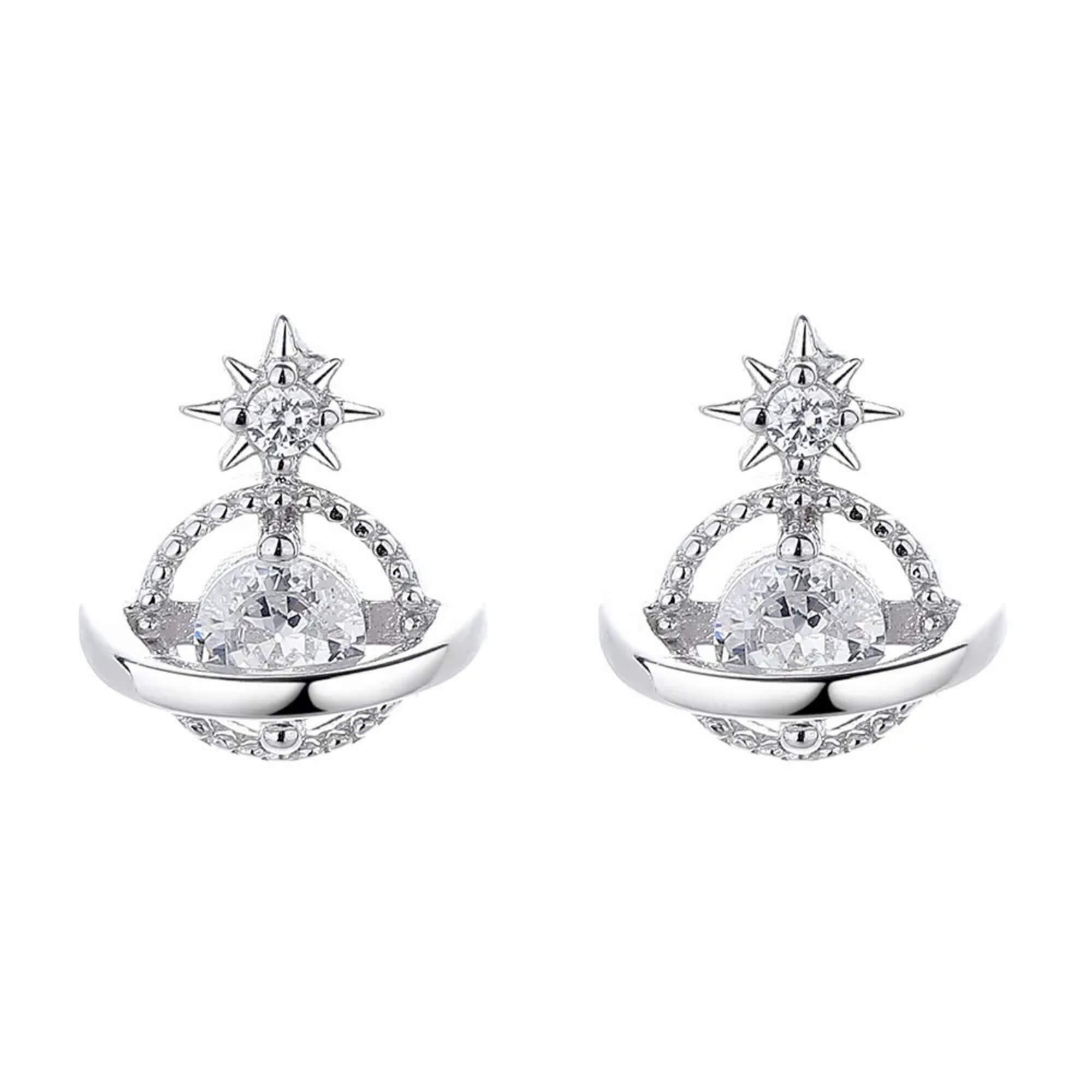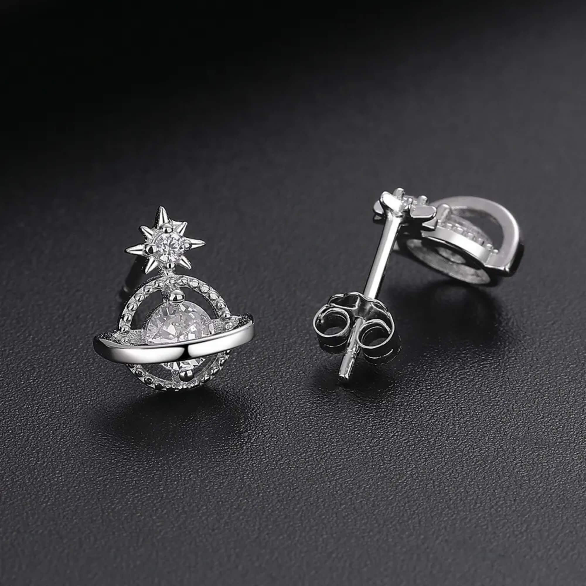 Zilveren oorbellen met een hemels design, met een ster bovenaan en een baan rond een centrale zirkonia edelsteen. De gestructureerde samenstelling geeft ze een gedurfde maar elegante uitstraling, waardoor ze een onderscheidende keuze zijn voor liefhebbers van kosmisch geïnspireerde sieraden.