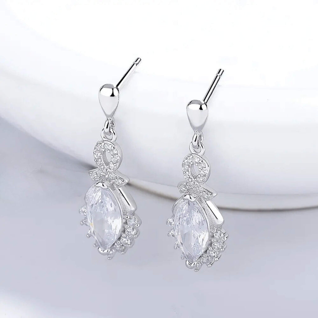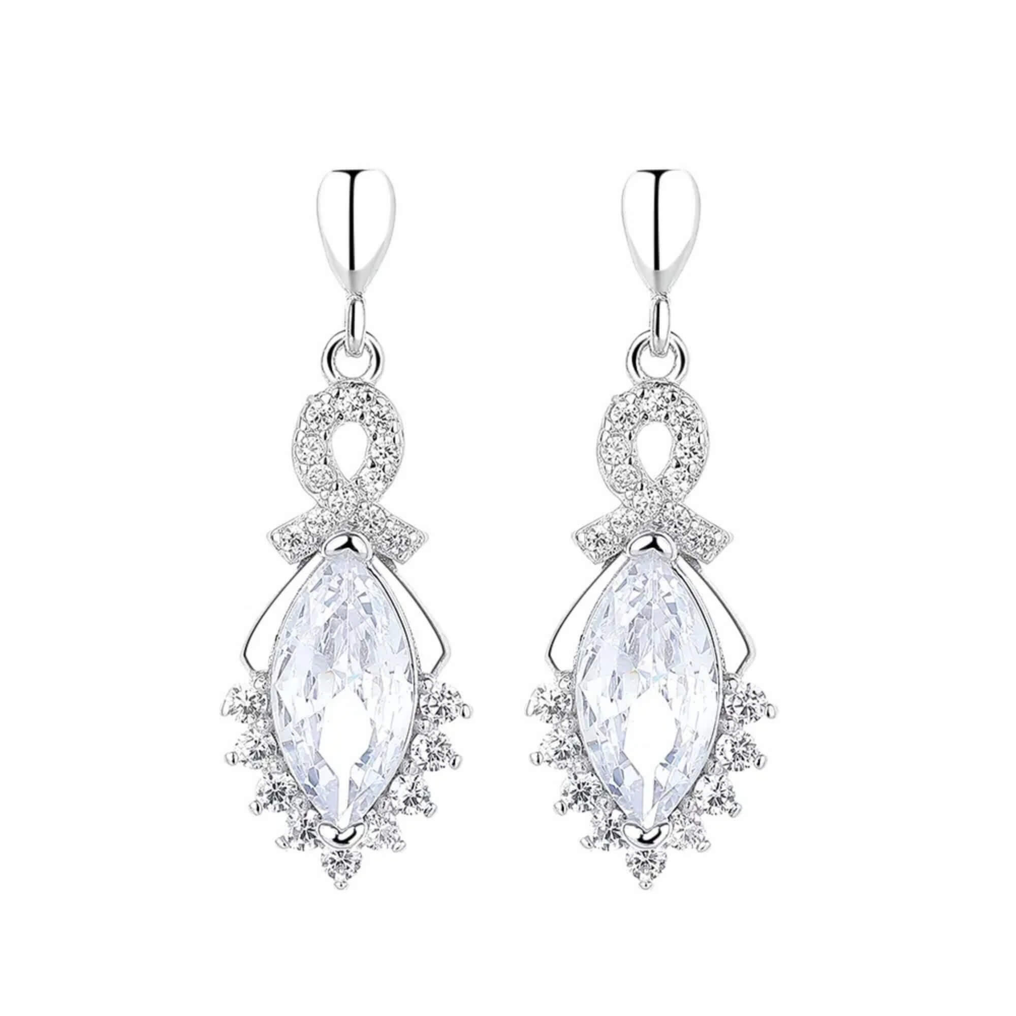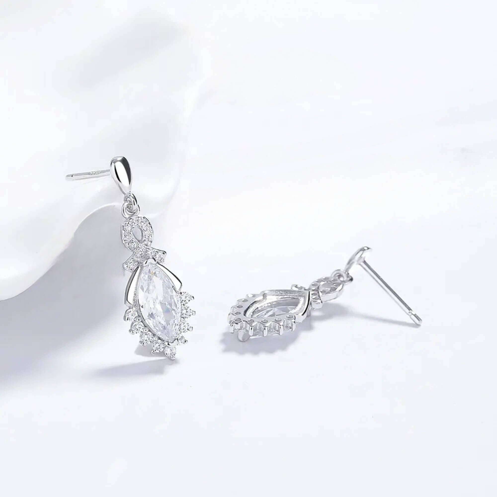 Elegante oorhangers met een marquise-geslepen zirkonia in het midden, omlijst met sprankelende kleine edelstenen voor extra glans. De stevige sluiting met push-back sluiting zorgt voor comfort en stabiliteit tijdens het dragen.