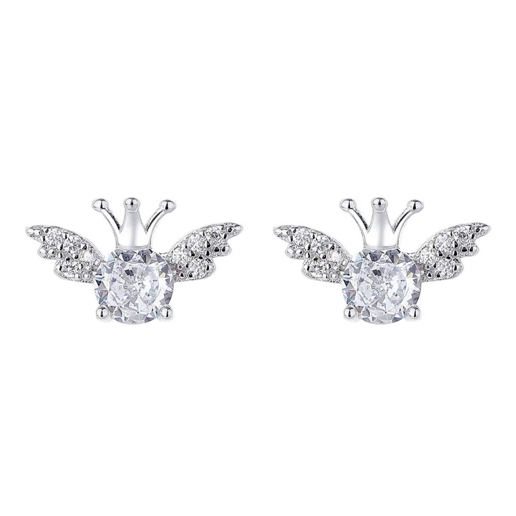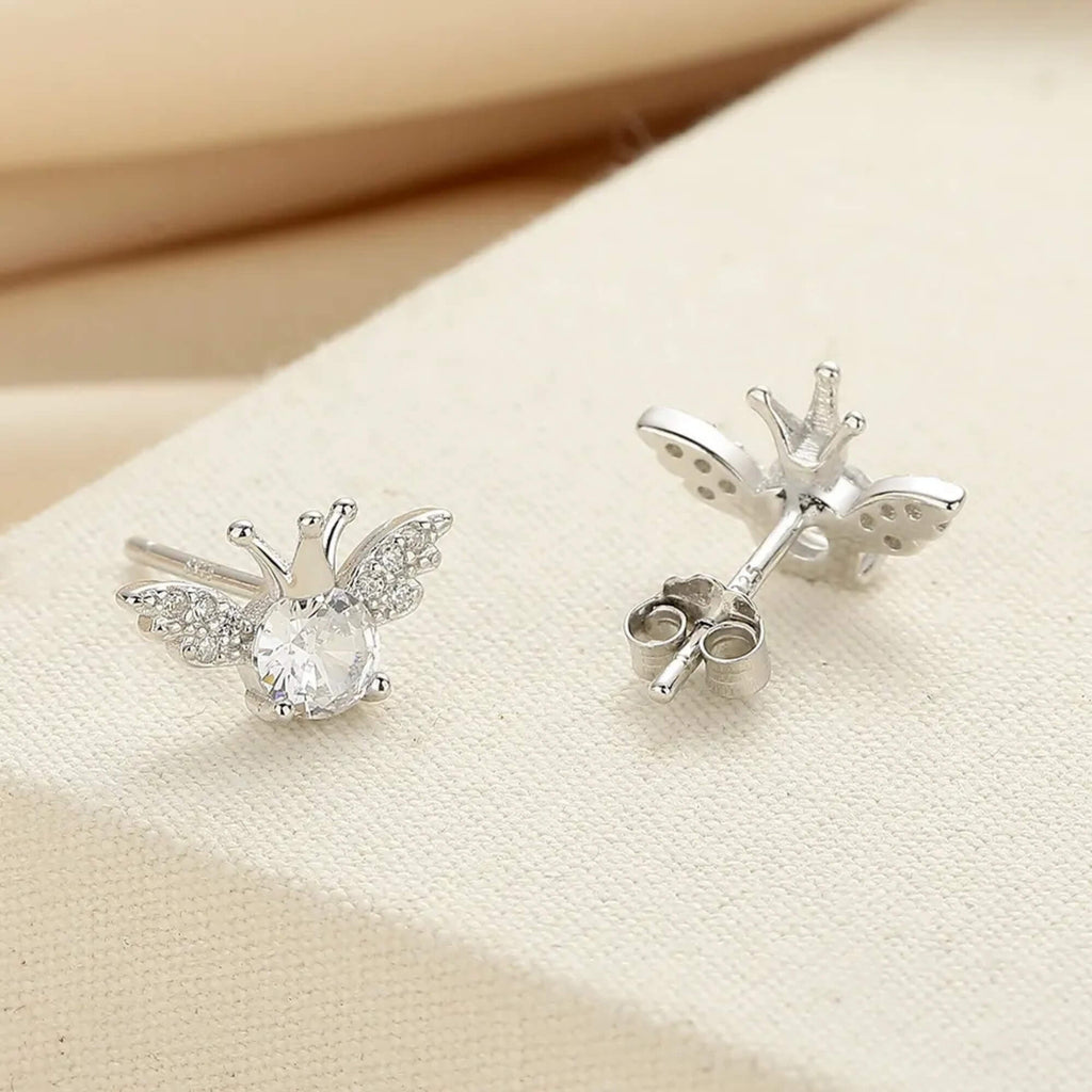 Zilveren oorbellen met een zirkonia, omringd door delicate vleugels die versierd zijn met kleinere edelstenen, en een kroontje erbovenop voor een speelse maar toch elegante look.