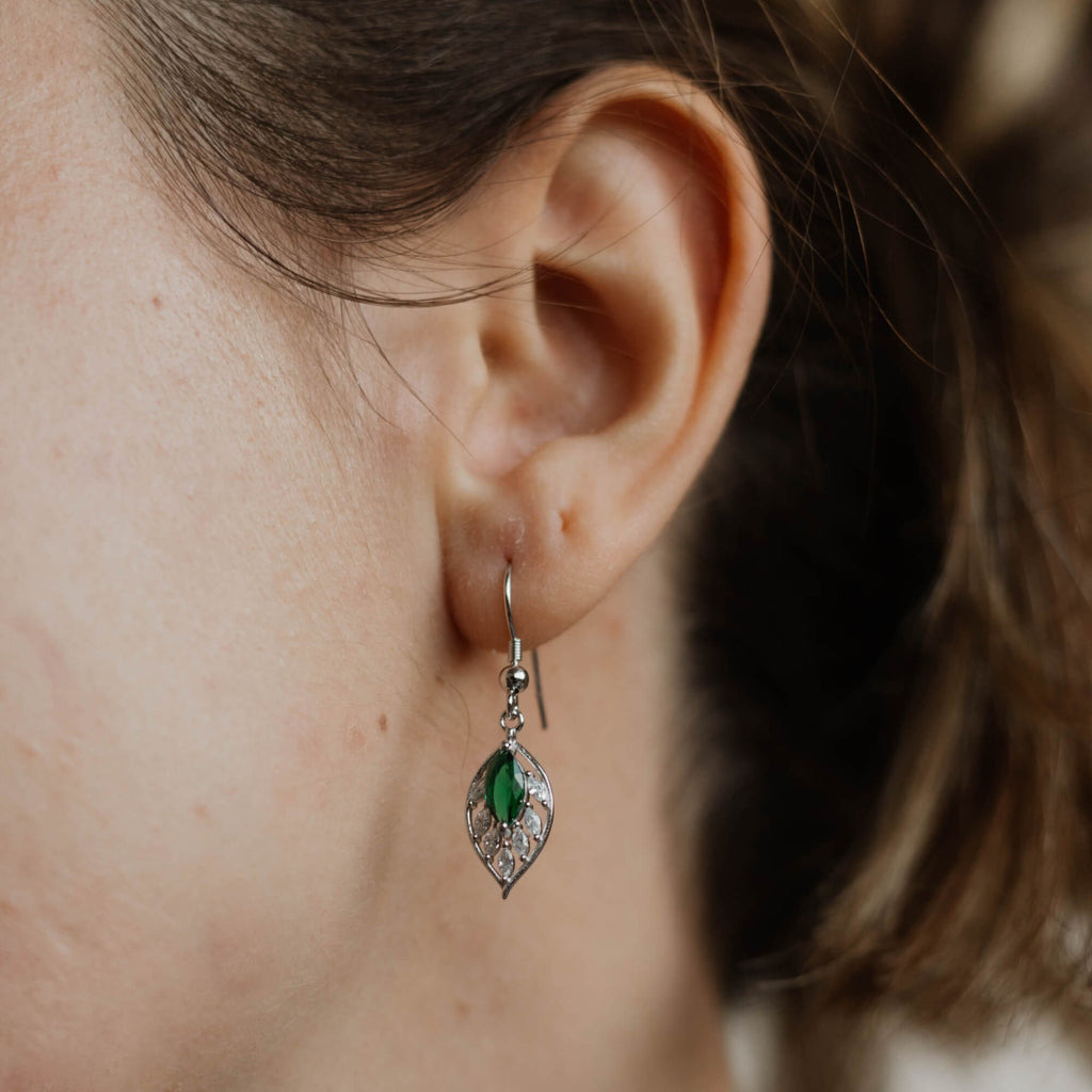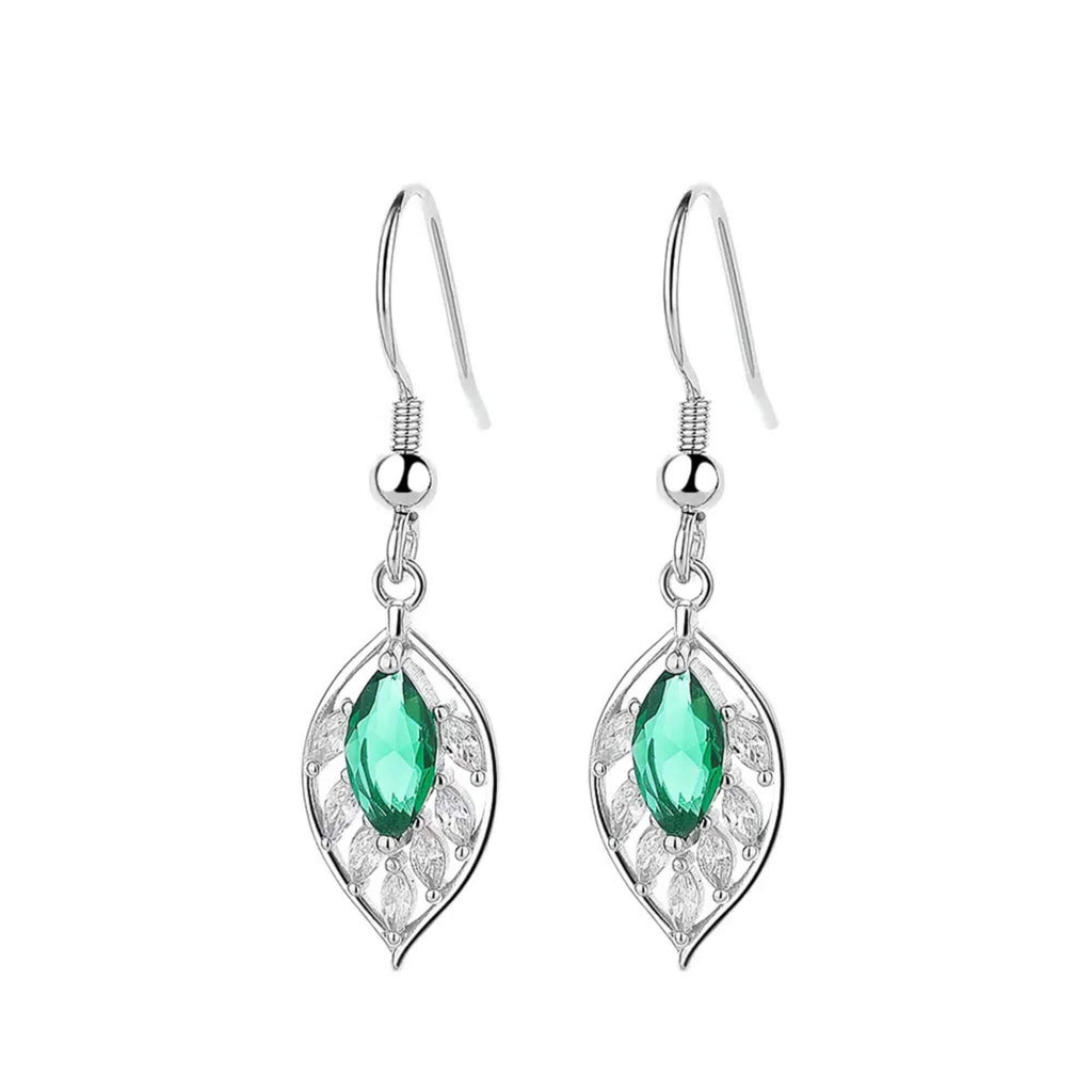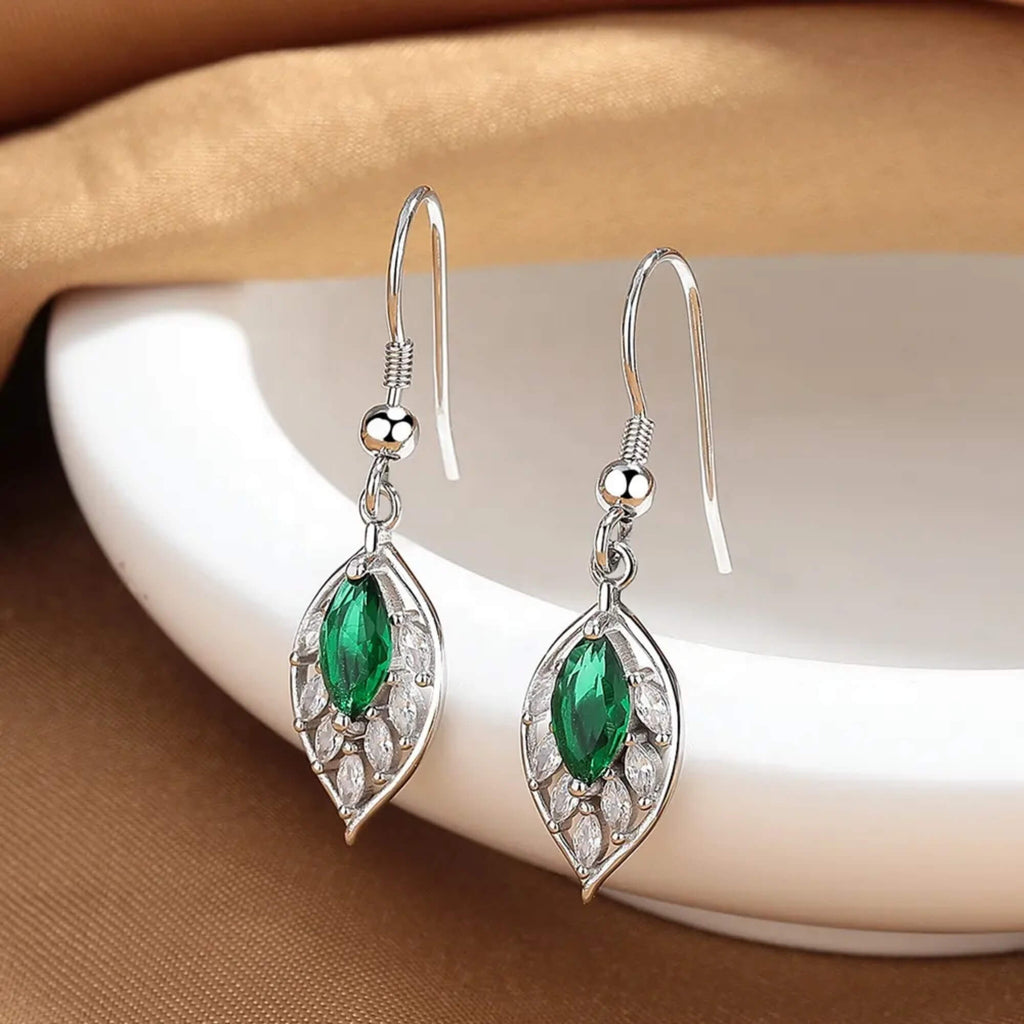 Een paar zilveren oorbellen die de essentie van de natuur prachtig vangen met een delicaat, op bladeren geïnspireerd ontwerp. In het midden van elke oorbel schittert een ovale, smaragdgroene zirkonia, die harmonie en vernieuwing symboliseert. Rondom het levendige middenstuk zitten subtiele zilveren accenten die een zachte, elegante sprankeling toevoegen. Perfect voor natuurliefhebbers of voor wie op zoek is naar een fris, elegant accessoire.