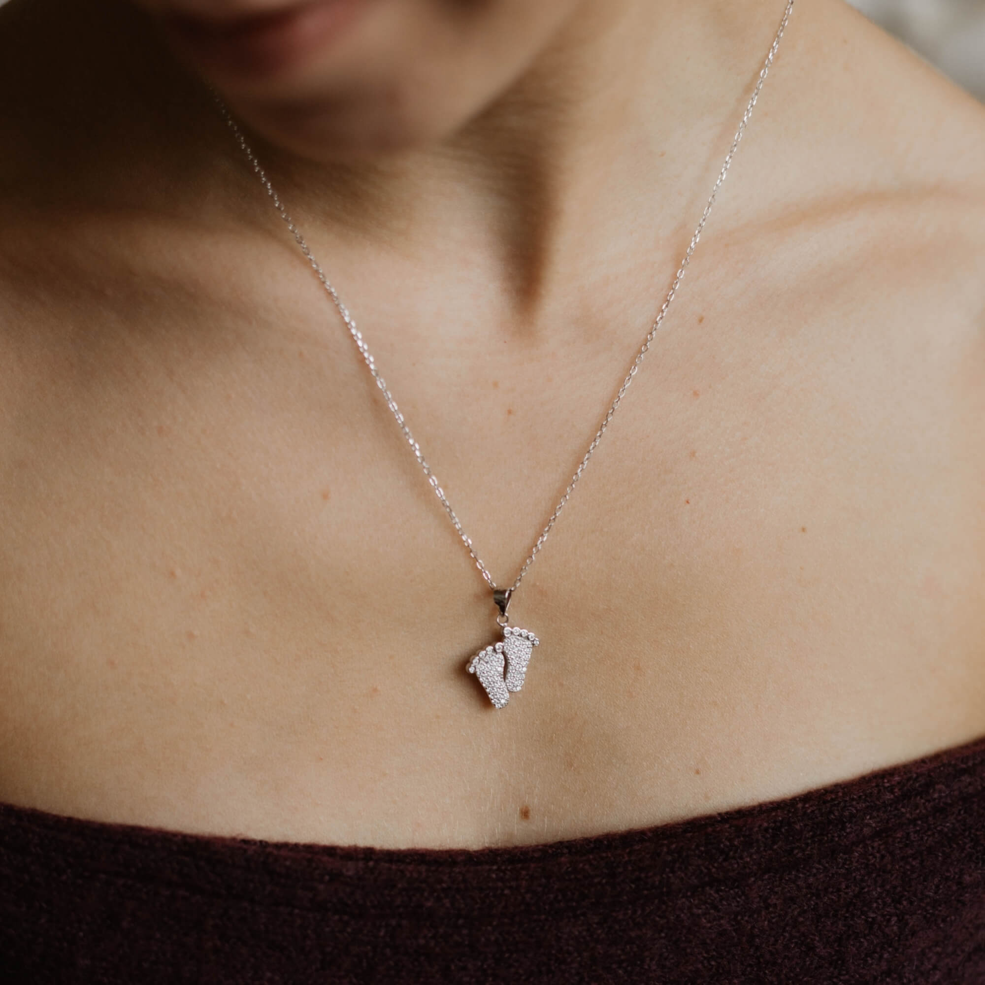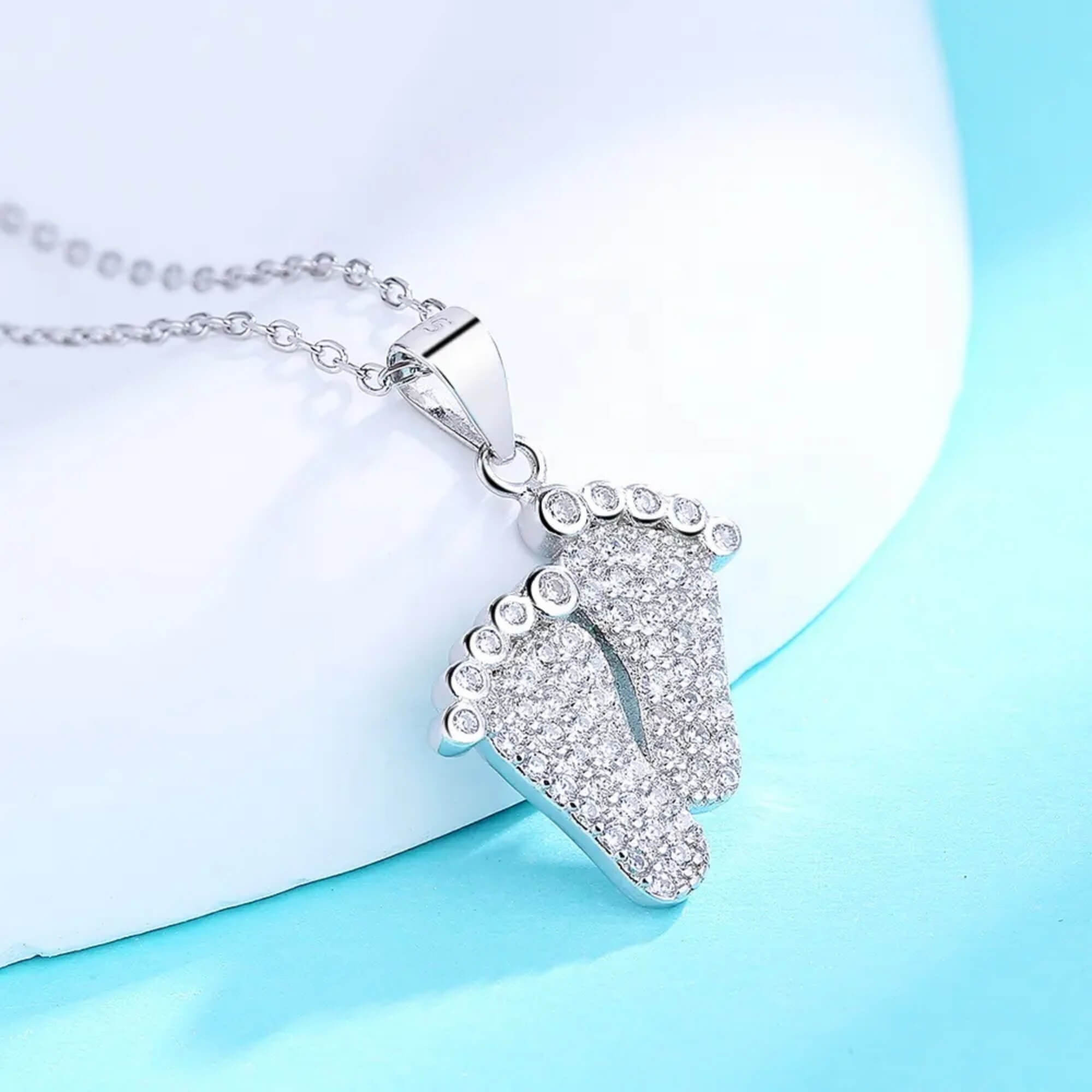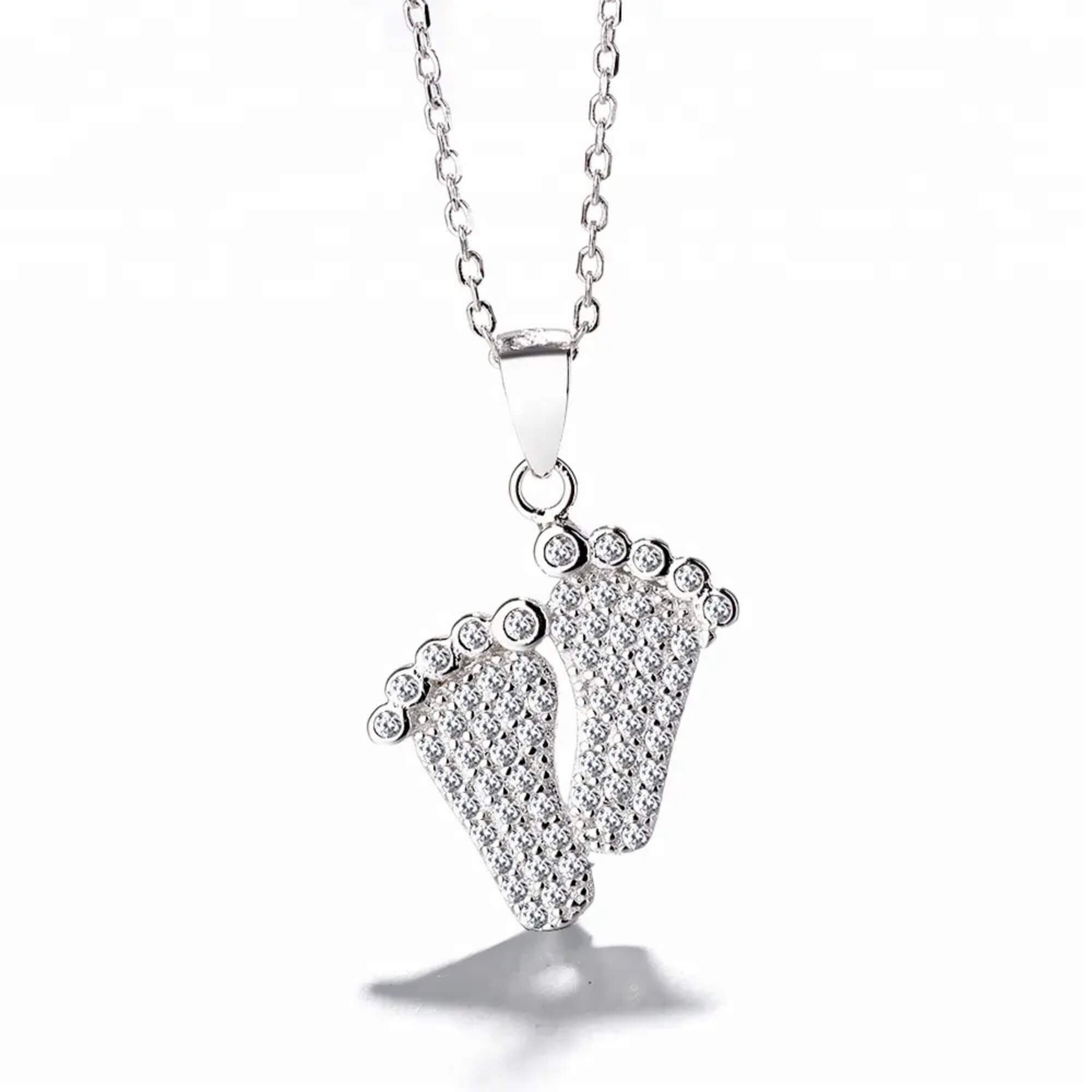 Zilveren ketting met een schattige hanger in de vorm van babyvoetjes - een oprecht symbool van nieuw leven en grenzeloze ouderliefde. De kleine voetjes zijn versierd met glinsterende zirkonia's, die een subtiele sprankeling toevoegen aan het betekenisvolle ontwerp. Dit sieraad is een attent cadeau voor aanstaande of kersverse ouders. Het legt een van de kostbaarste momenten in het leven op elegante en stijlvolle wijze vast.