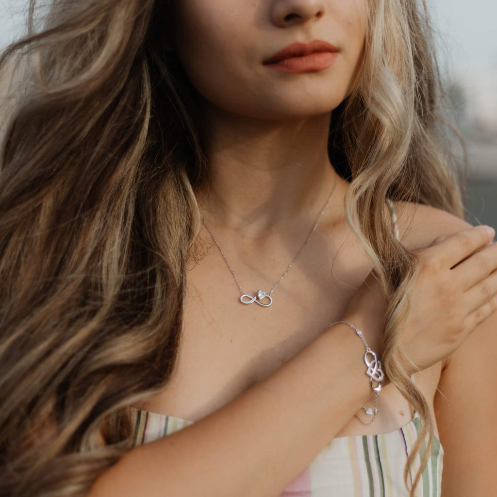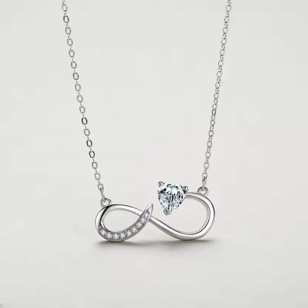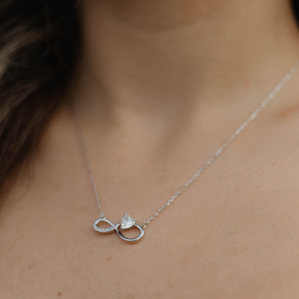 Een elegante zilveren ketting die het tijdloze oneindigheidssymbool een nieuwe interpretatie geeft met een gedurfde, asymmetrische twist. Versierd met een sprankelende zirkonia en verfijnde details, combineert dit ontwerp naadloos diepe symboliek met eigentijds design. De delicate rondingen en glinsterende accenten maken het een betoverend sieraad, perfect om blijvende liefde en verbondenheid uit te drukken.