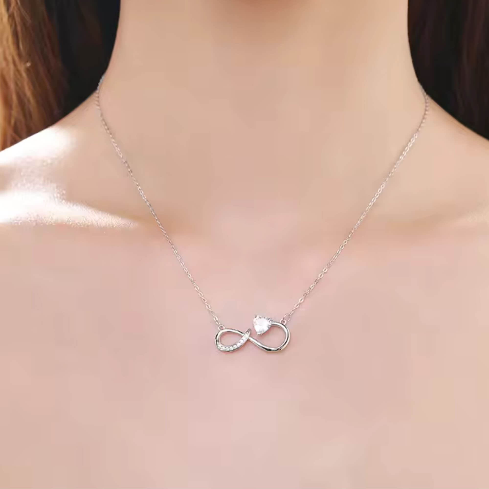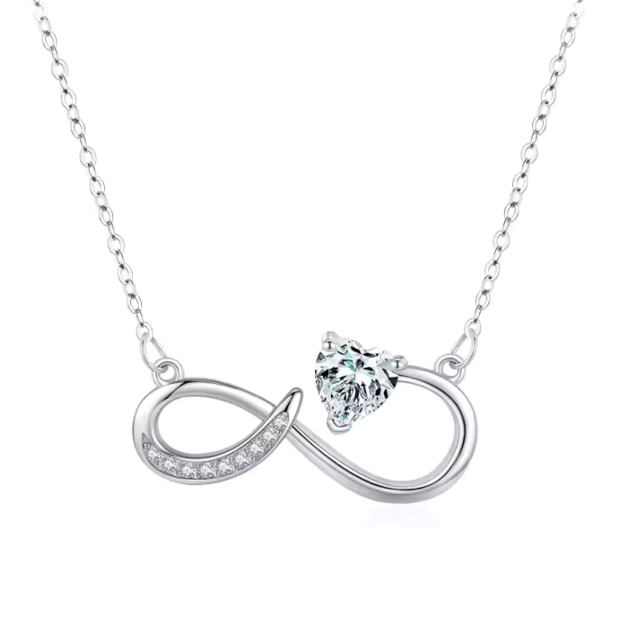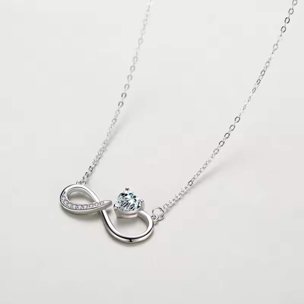 Een elegante zilveren ketting die het tijdloze oneindigheidssymbool een nieuwe interpretatie geeft met een gedurfde, asymmetrische twist. Versierd met een sprankelende zirkonia en verfijnde details, combineert dit ontwerp naadloos diepe symboliek met eigentijds design. De delicate rondingen en glinsterende accenten maken het een betoverend sieraad, perfect om blijvende liefde en verbondenheid uit te drukken.