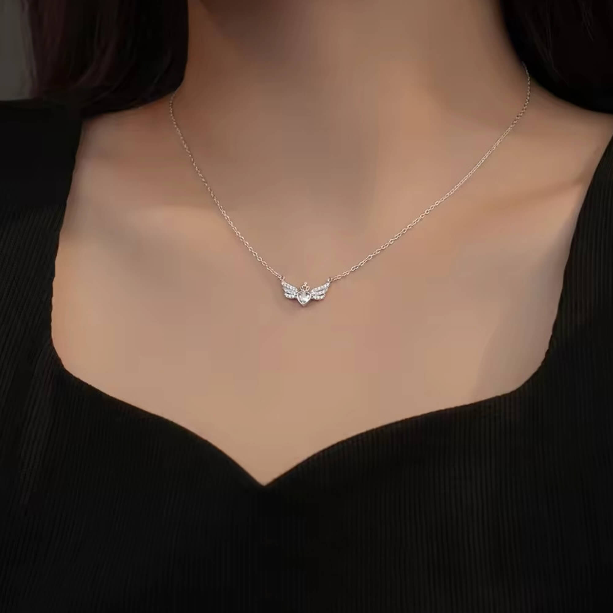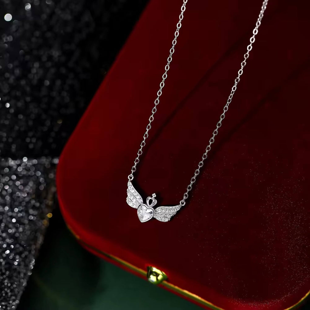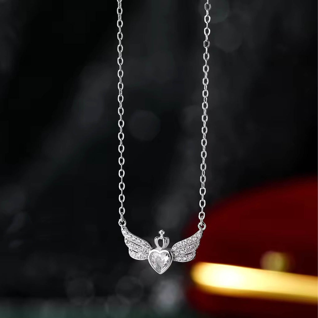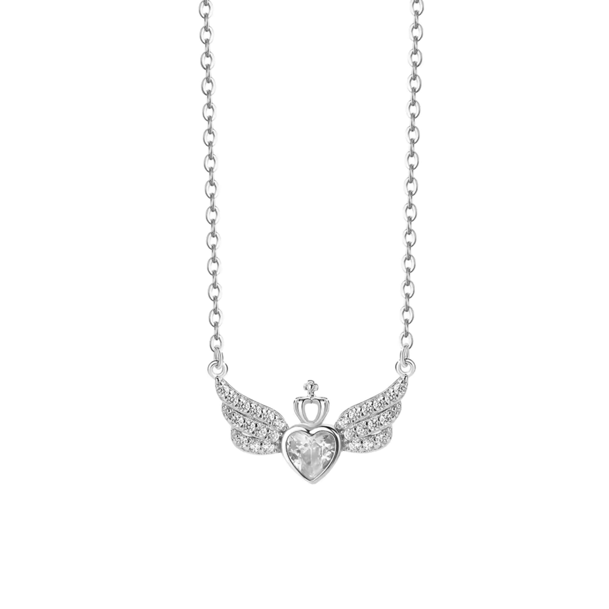 Een zilveren ketting met een charmante hanger met een hart bekroond door een delicate kroon, omlijst met engelenvleugels. Geaccentueerd met sprankelende zirkonia's straalt de ketting een romantische en elegante uitstraling uit.