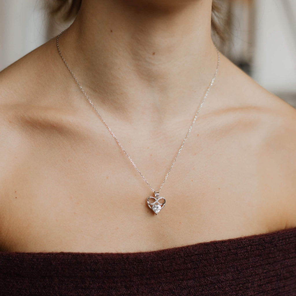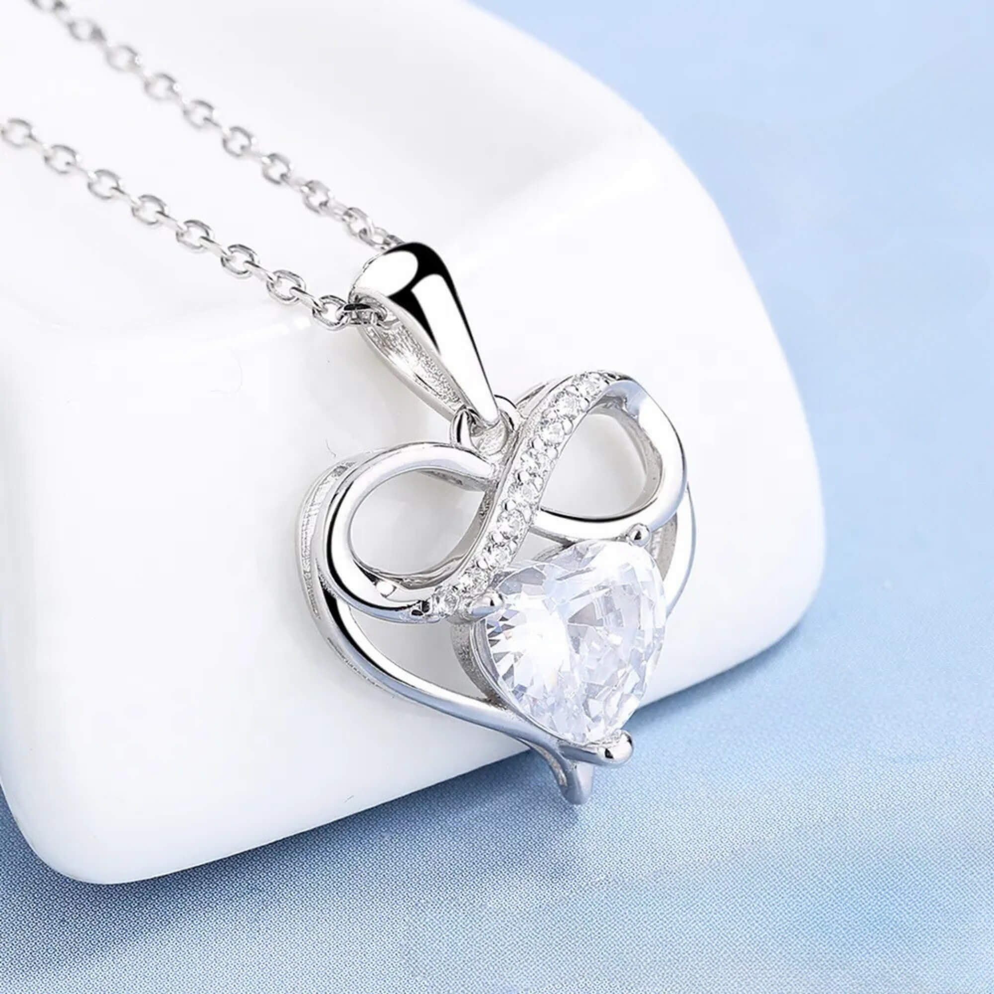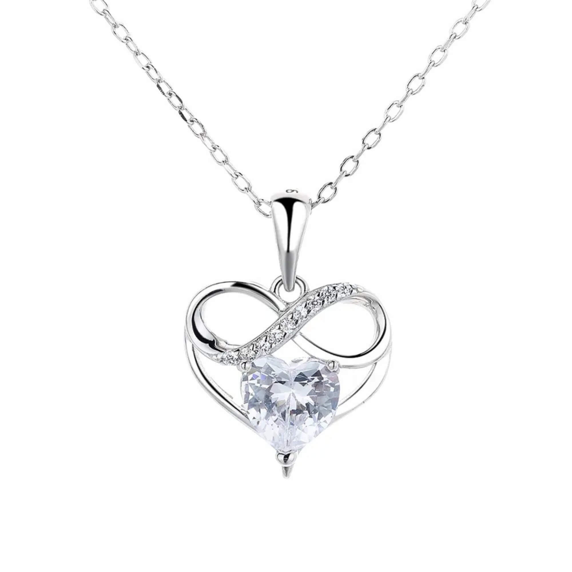 Zilveren ketting met een hanger die de symbolen van eeuwigheid en liefde naadloos combineert. De infinity-lus is subtiel verweven met een hartvormig ontwerp en draagt een boodschap van eeuwige liefde en een onbreekbare band uit. In het midden zorgt een hartvormige zirkonia voor een vleugje schittering, die de puurheid van ware emoties symboliseert.