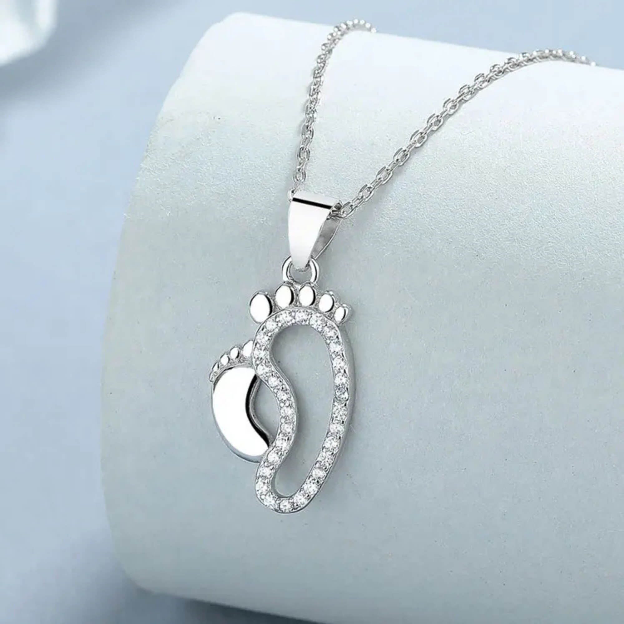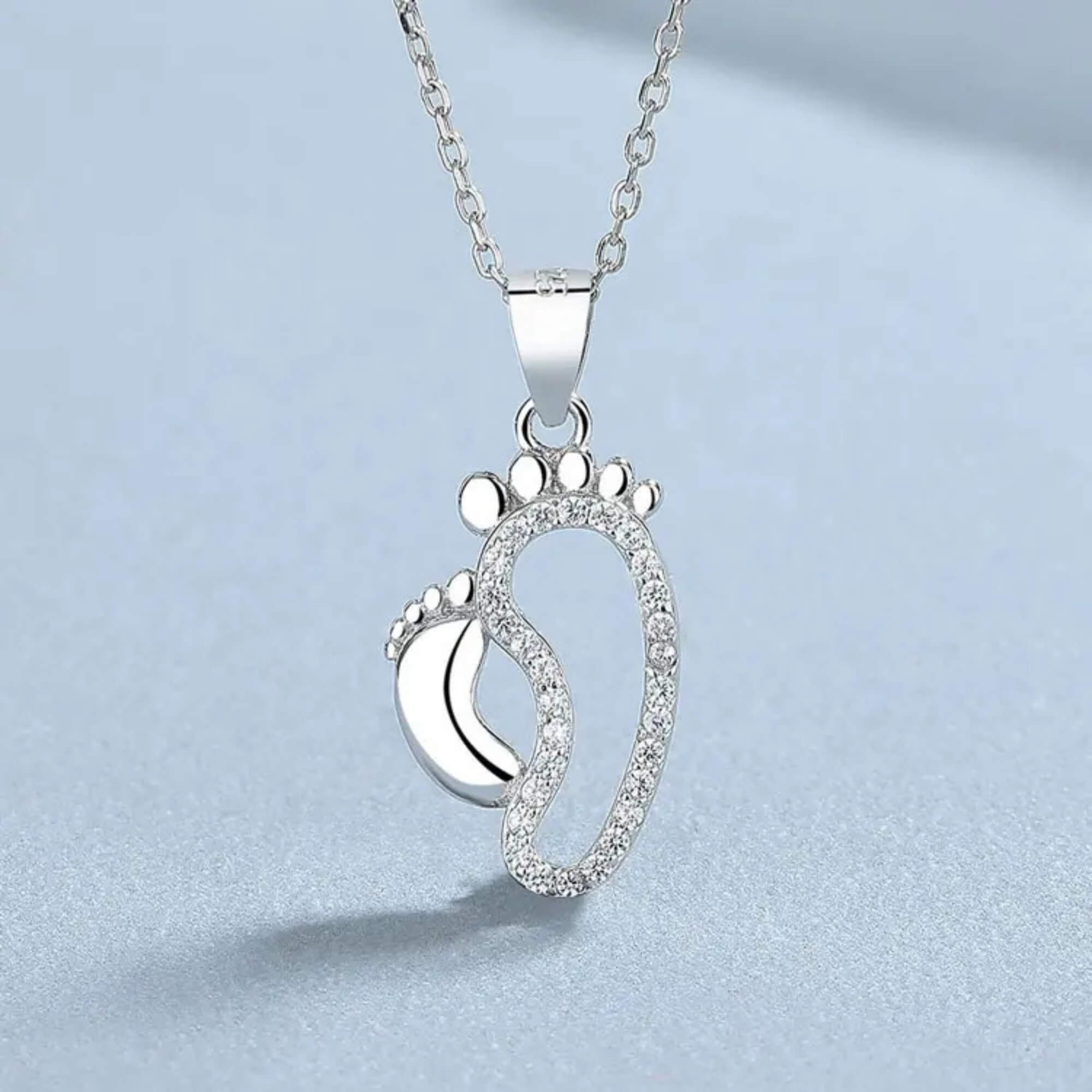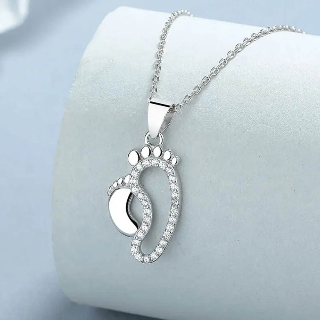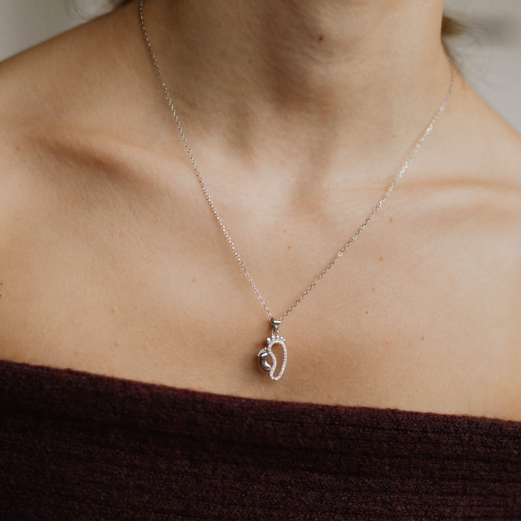 Deze delicate zilveren ketting benadrukt de onbreekbare band tussen een kind en zijn of haar verzorger door het doordachte ontwerp met twee voetafdrukken. De kleinere voetafdruk is strak en gepolijst, terwijl de grotere is versierd met sprankelende zirkonia's, wat een elegante toets toevoegt aan de betekenisvolle symboliek.