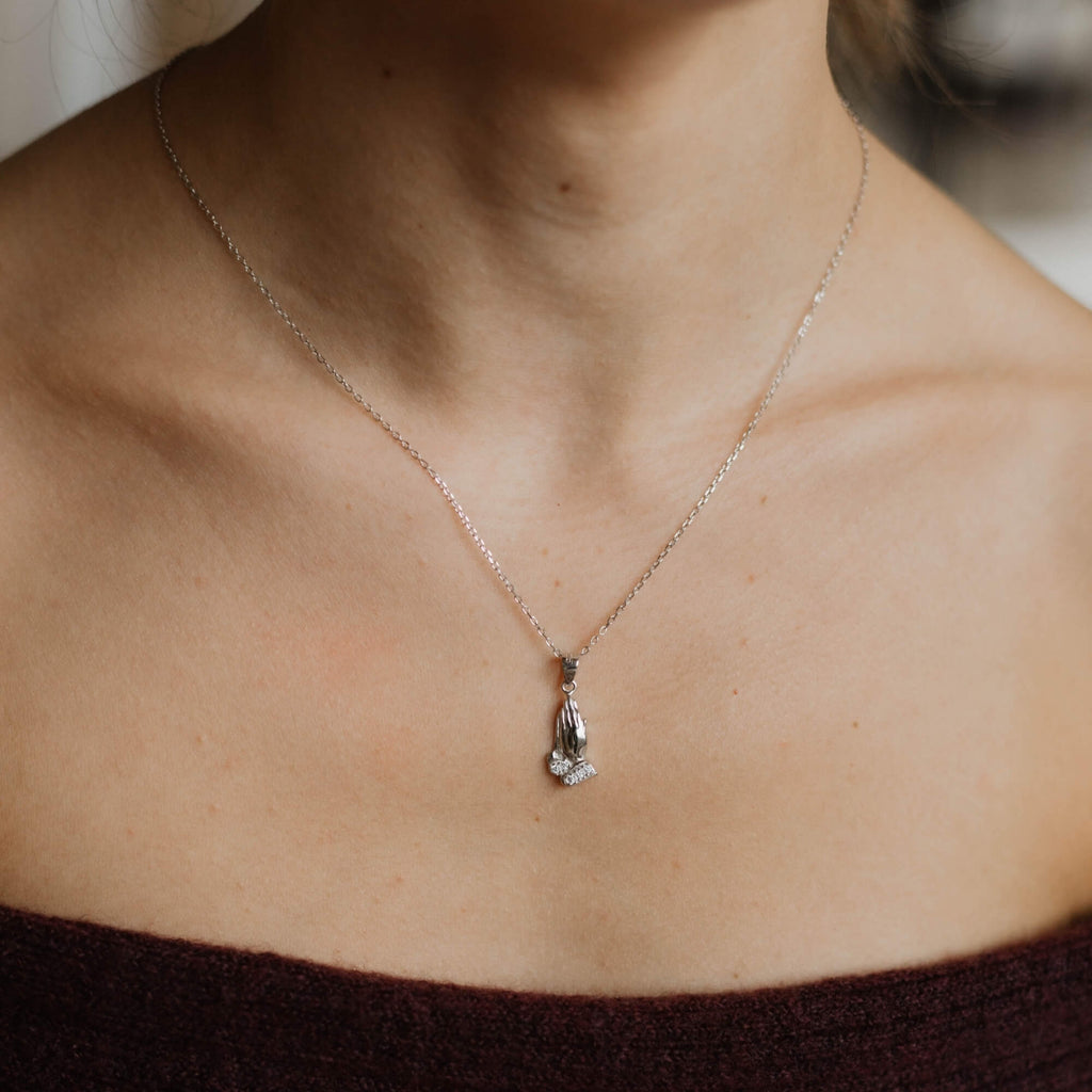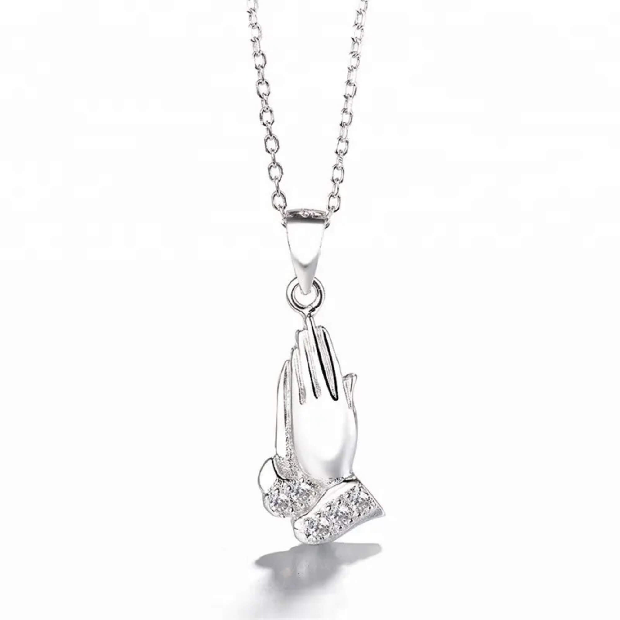 Zilveren ketting met een hanger in de vorm van biddende handen, een diepzinnig symbool van geloof, hoop en spirituele verbondenheid. Geaccentueerd met glinsterende zirkonia's combineert dit sieraad betekenisvolle symboliek met verfijnde elegantie, waardoor het een perfecte keuze is voor wie zijn overtuigingen een warm hart toedraagt.