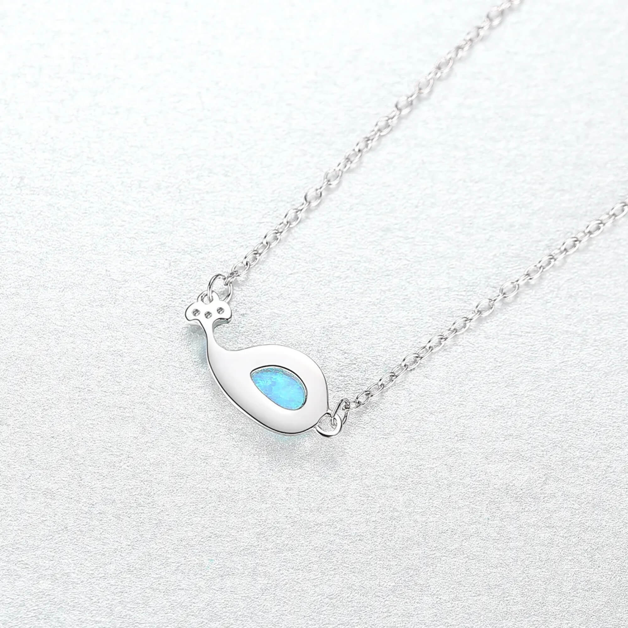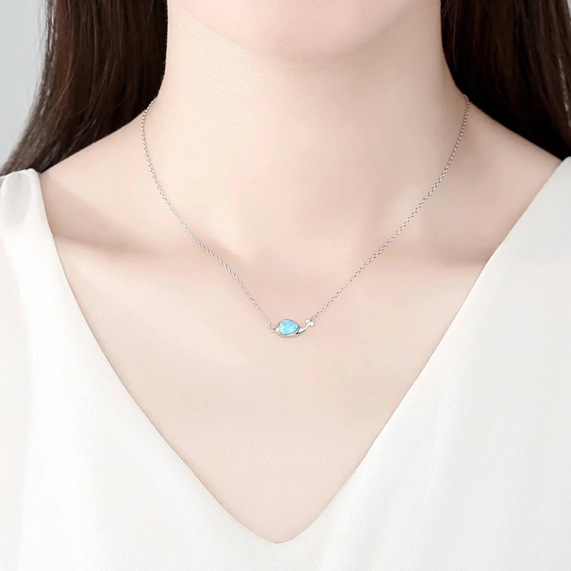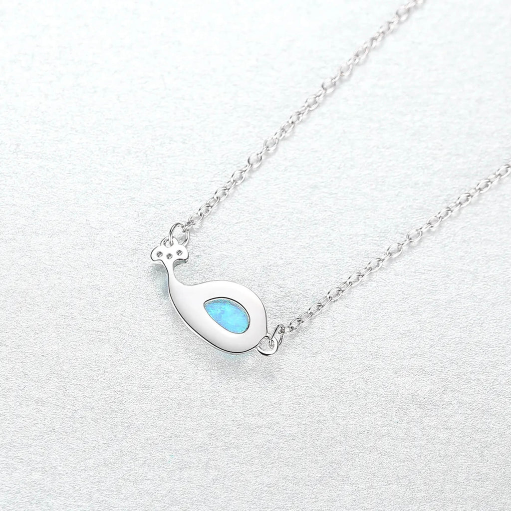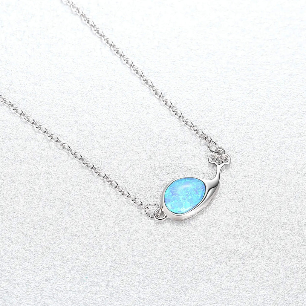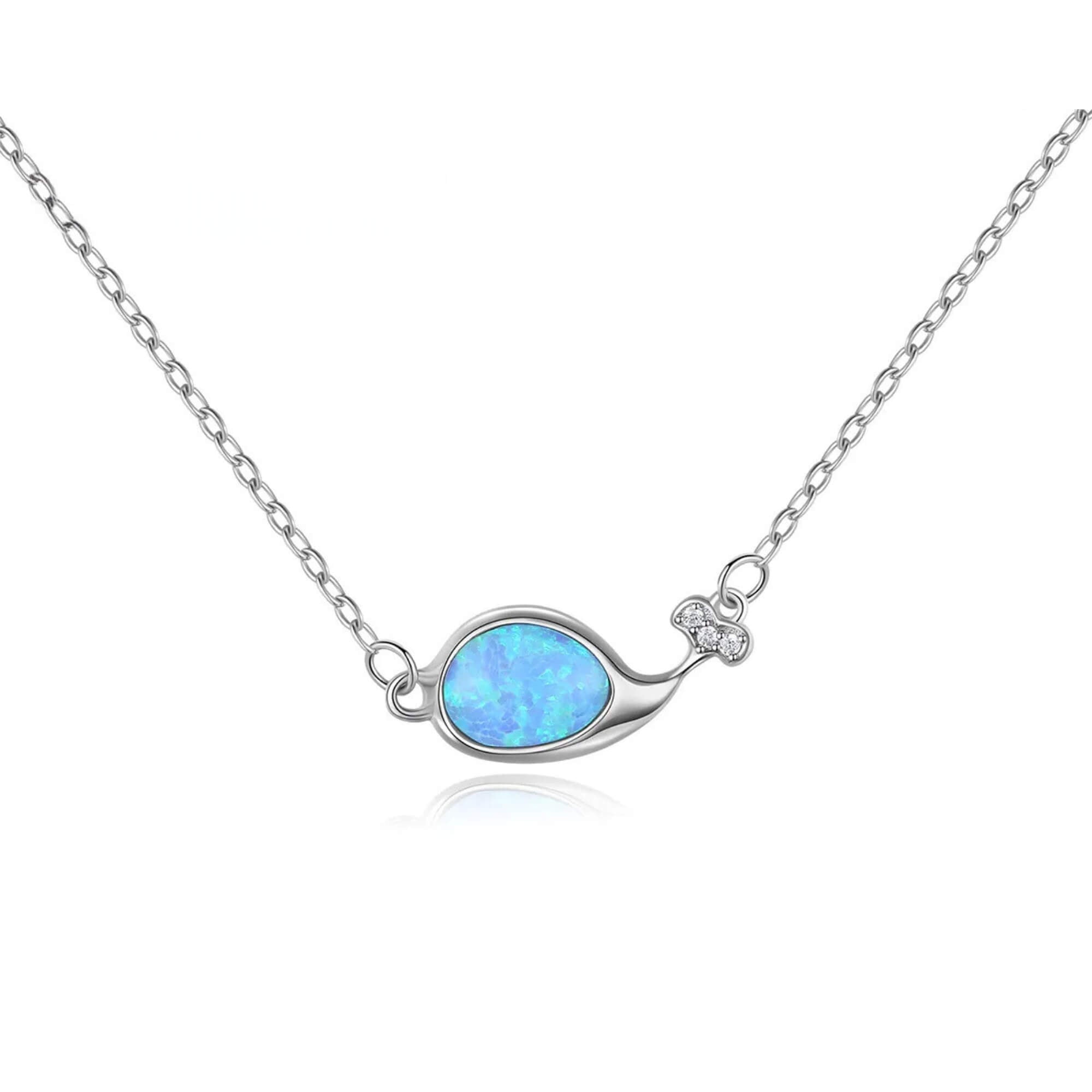 Een elegante zilveren ketting met een walvis, geaccentueerd met een betoverende blauwe opaal en sprankelende zirkonia's in zijn staart. Dit sieraad symboliseert vrijheid en rust en voegt een vleugje oceanische charme toe aan elke look. Perfect voor wie de schoonheid van de zee en de sereniteit die deze vertegenwoordigt, koestert.