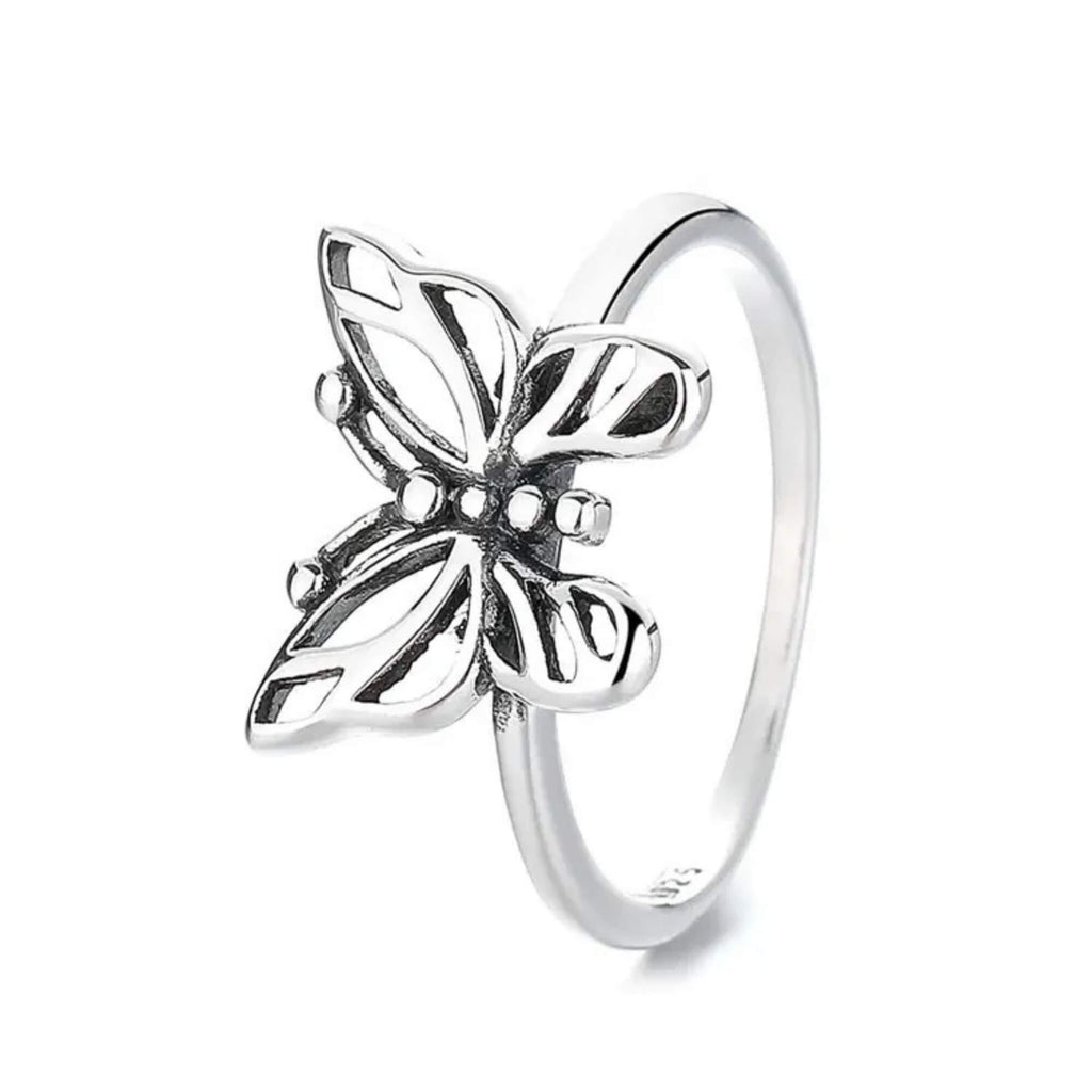 Een zilveren ring met een subtiel gebeeldhouwde vlinder, symbool voor transformatie en een nieuw begin. De fijne details op de vleugels geven het geheel karakter, wat resulteert in een betekenisvol en veelzijdig sieraad voor elke gelegenheid.