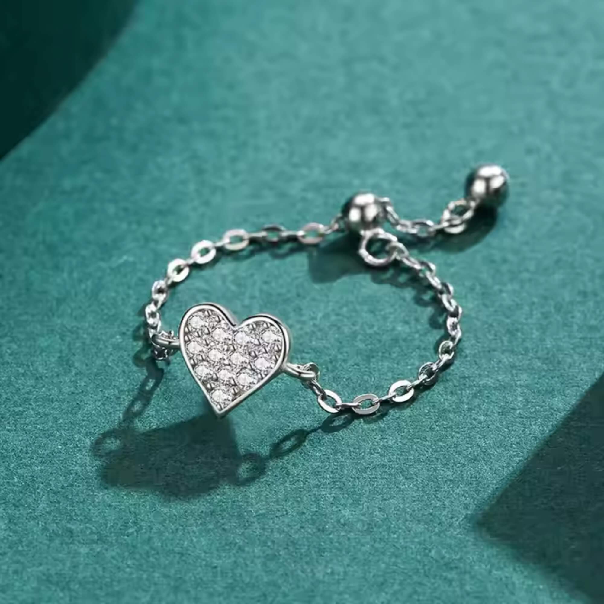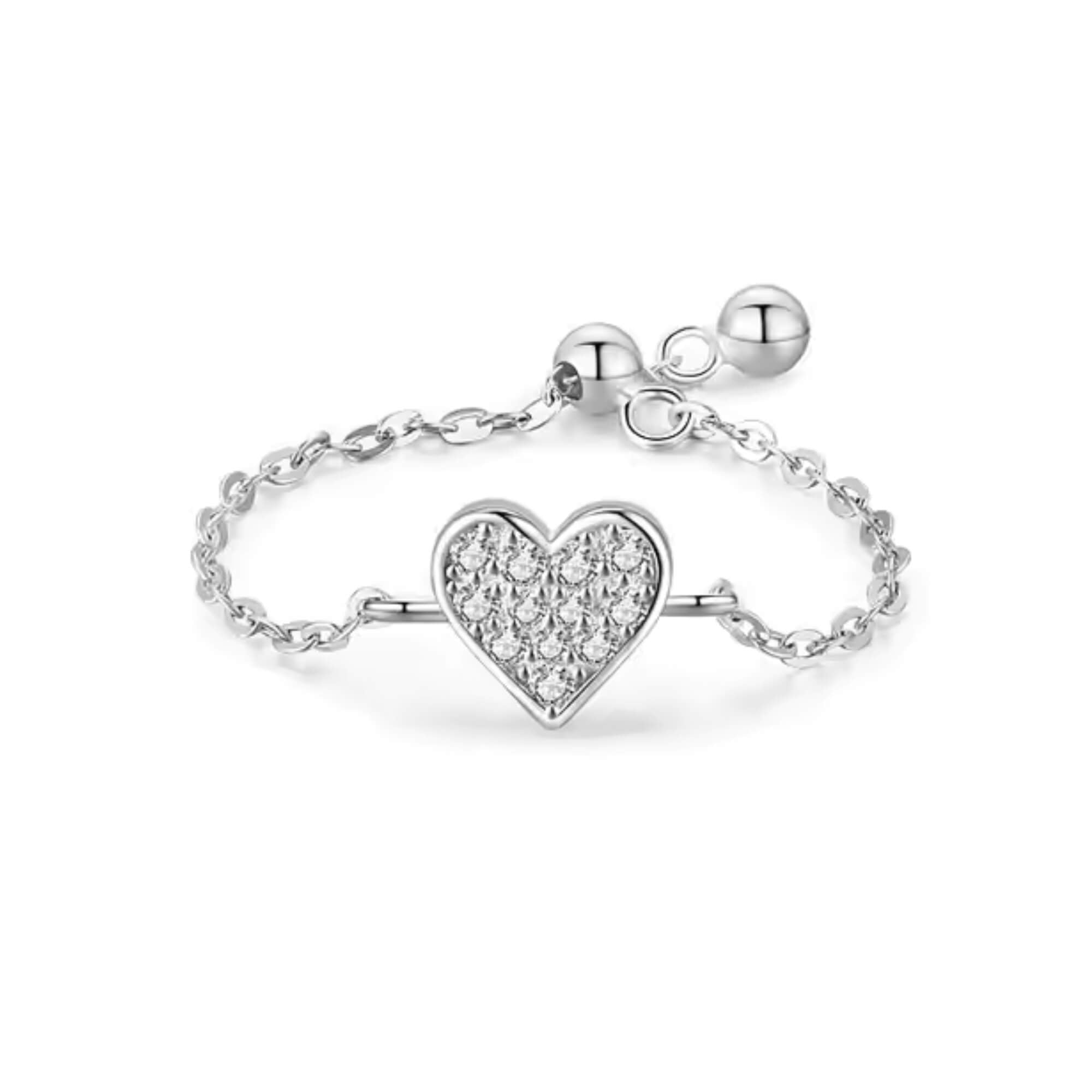 Deze ring van sterling zilver is ontworpen met zowel schoonheid als functionaliteit in gedachten. De verstelbare band zorgt ervoor dat hij comfortabel aan elke vinger te dragen is, terwijl het centrale sieraad - een hart versierd met sprankelende zirkonia - liefde, warmte en verbondenheid symboliseert.