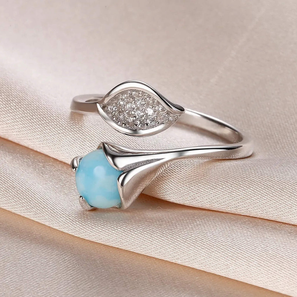 Zilveren ring met een larimarsteen in een delicate hemelsblauwe tint, die een gevoel van sereniteit en harmonie oproept. Het ontwerp doet denken aan een bloeiende bloem, met een gebogen band die overgaat in een glinsterend blad versierd met zirkonia. Een prachtig gebalanceerd sieraad dat de essentie van natuurlijke elegantie vastlegt.