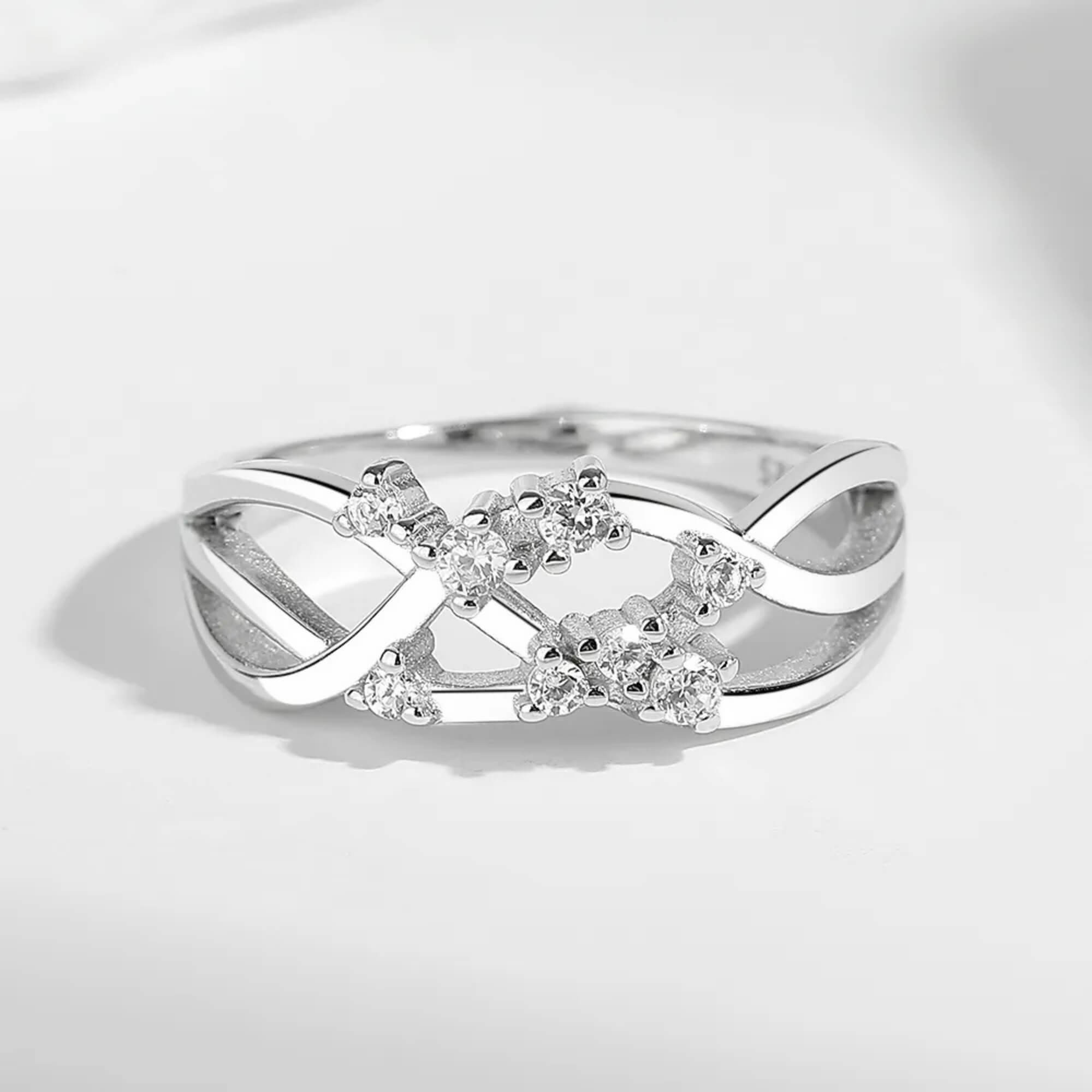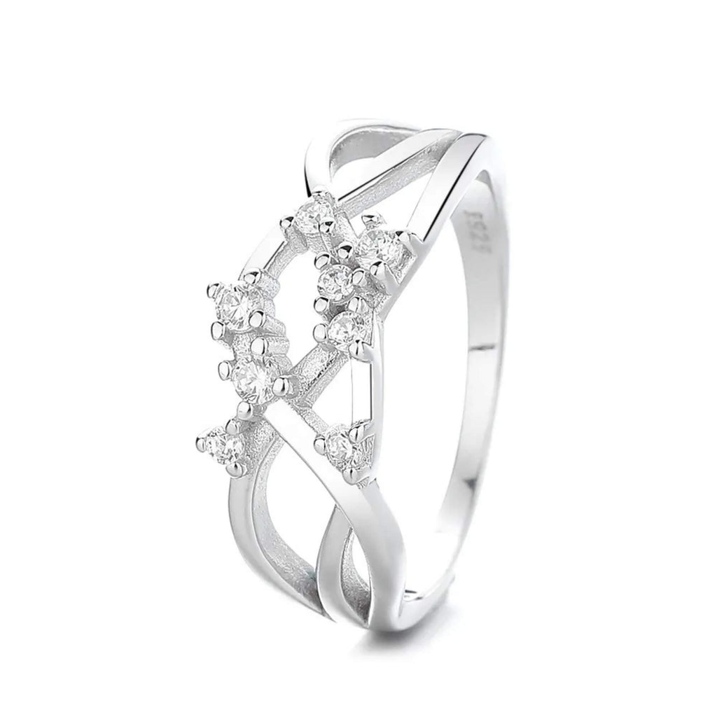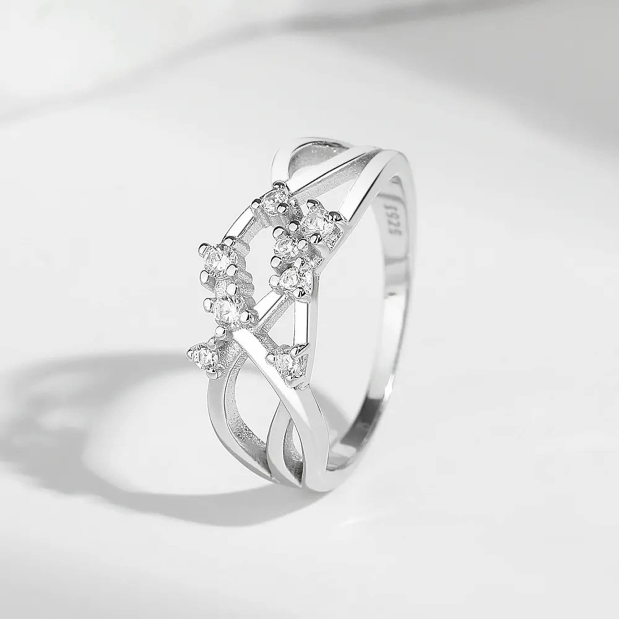 Zilveren ring met overlappende lijnen die een gevoel van beweging en vloeiendheid creëren. De combinatie van zirkonia's accentueert het ontwerp en zorgt voor een subtiele schittering zonder de strakke esthetiek te overheersen. Een veelzijdig sieraad dat op zichzelf staat.