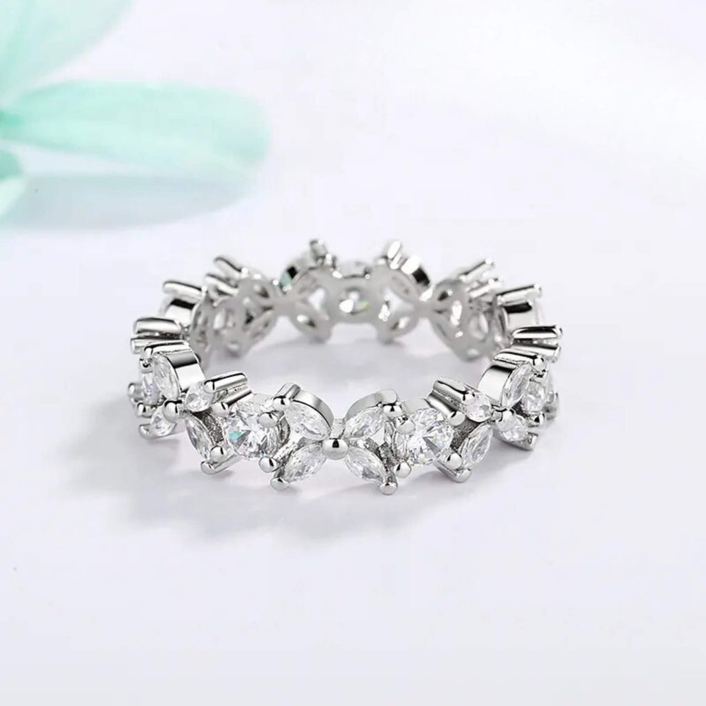 Zilveren ring geïnspireerd op de delicate schoonheid van bloeiende bloemen. De zirkonia's zijn zorgvuldig gerangschikt zodat ze op kleine bloemblaadjes lijken, wat een betoverend en driedimensionaal effect creëert. De afwisselende zetting laat het licht over elke steen dansen, wat resulteert in een verfijnd sieraad dat de elegantie van de natuur belichaamt in een tijdloos design.