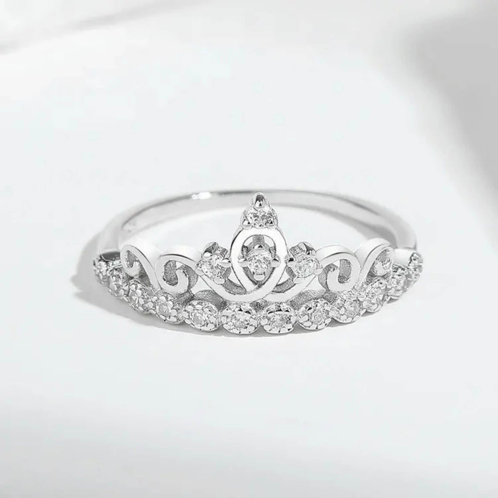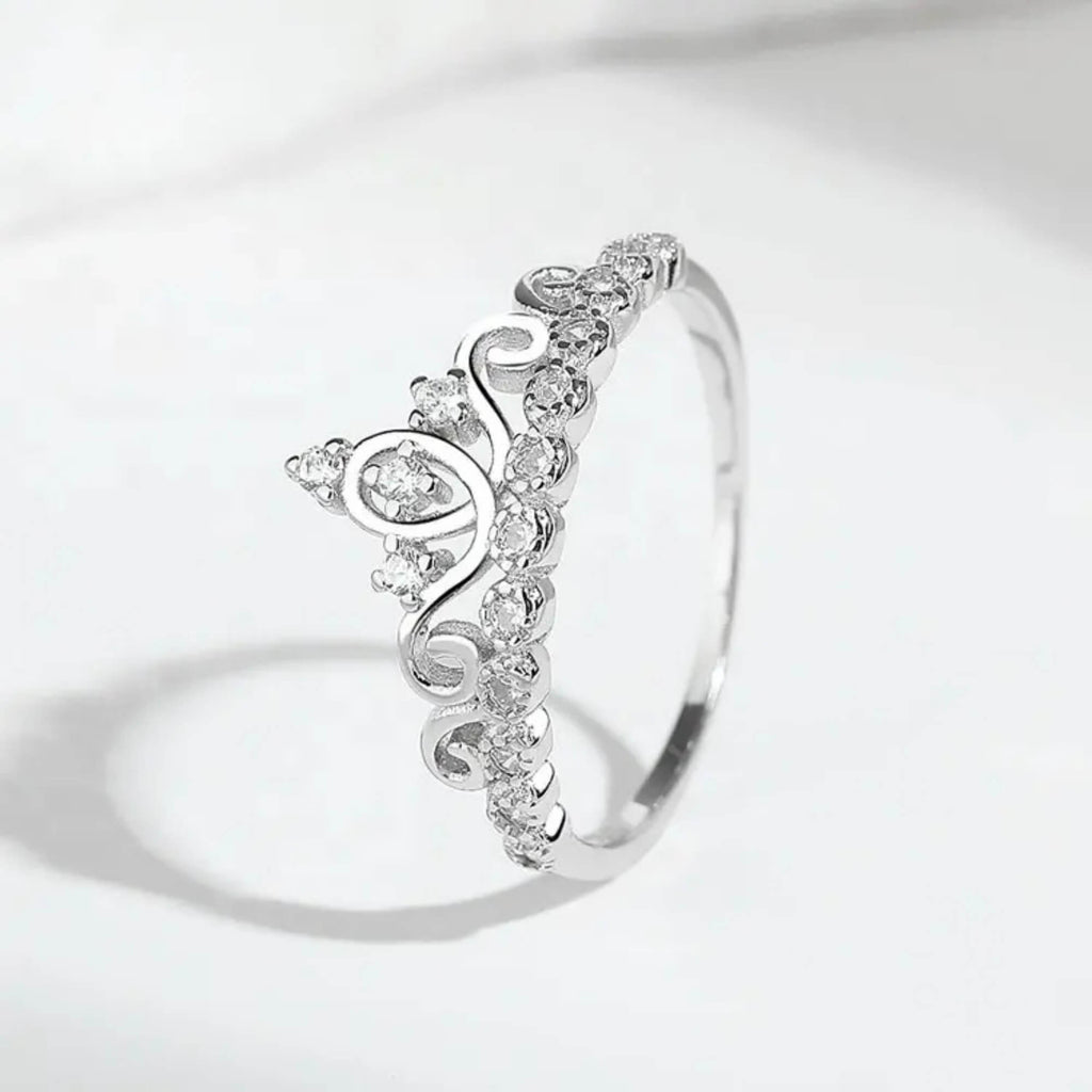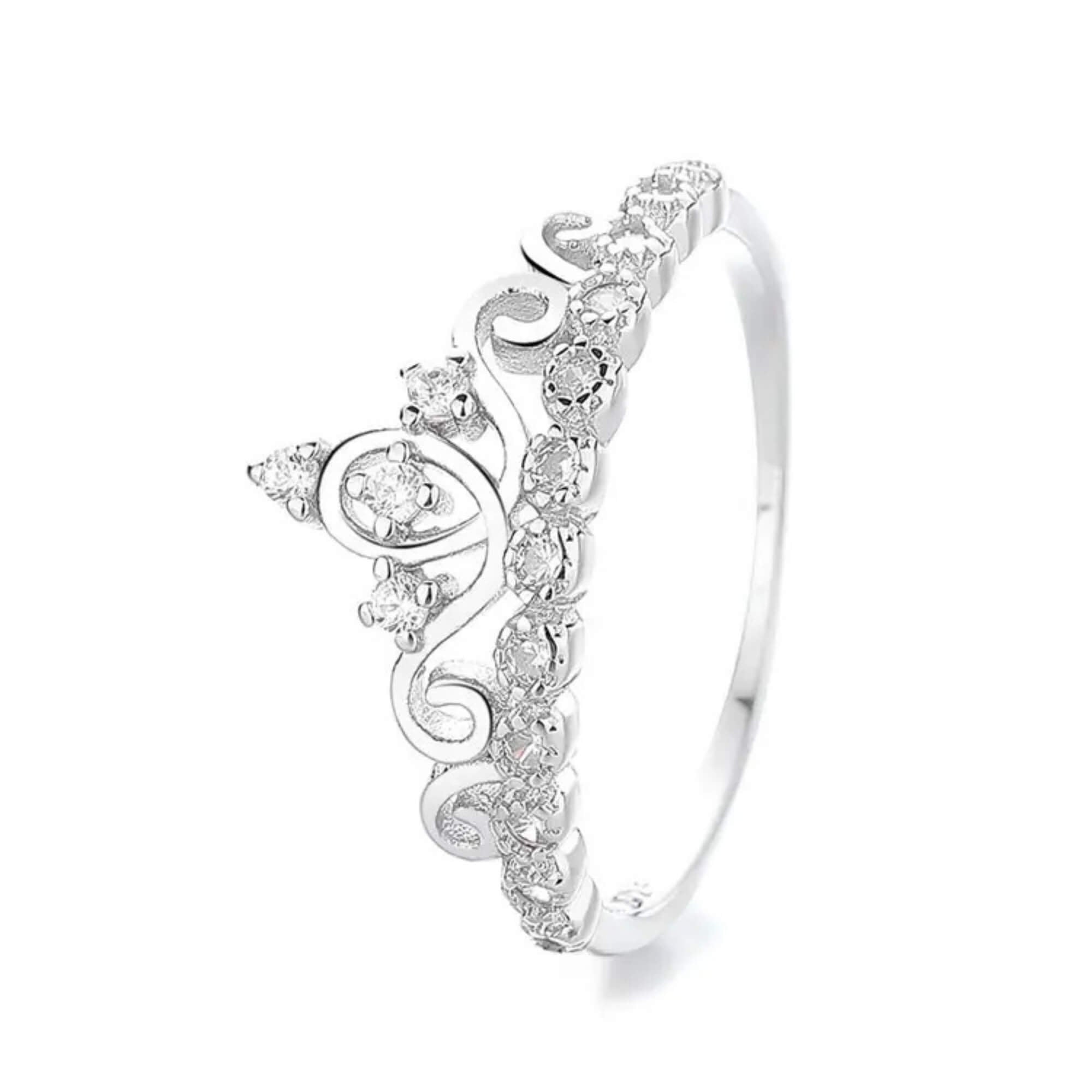 Een delicate zilveren ring in de vorm van een elegante kroon, versierd met glinsterende zirkonia's. De sierlijke rondingen en fijne details geven het sieraad een koninklijke charme, waardoor het de perfecte keuze is voor iedereen die houdt van accessoires met een sprookjesachtig tintje.