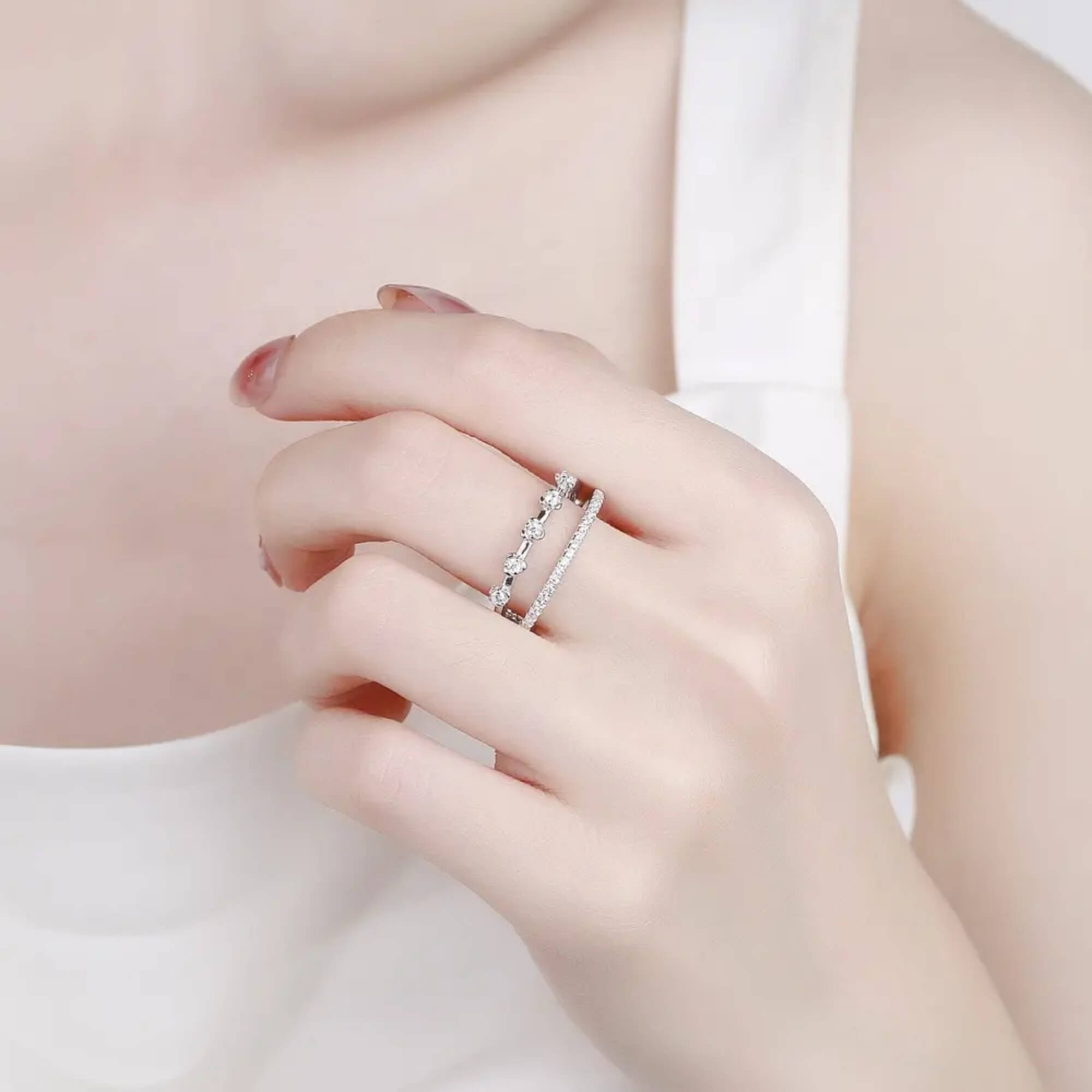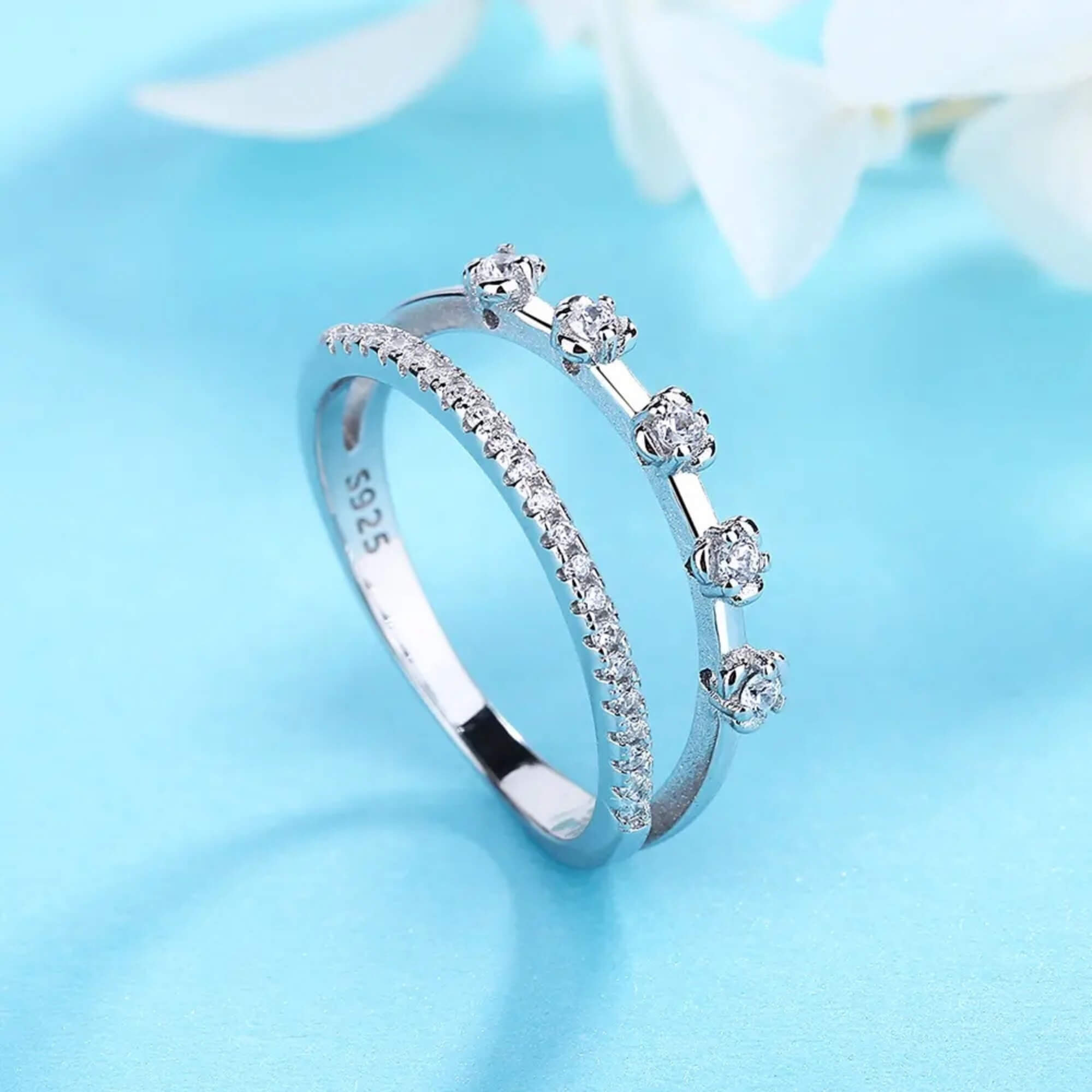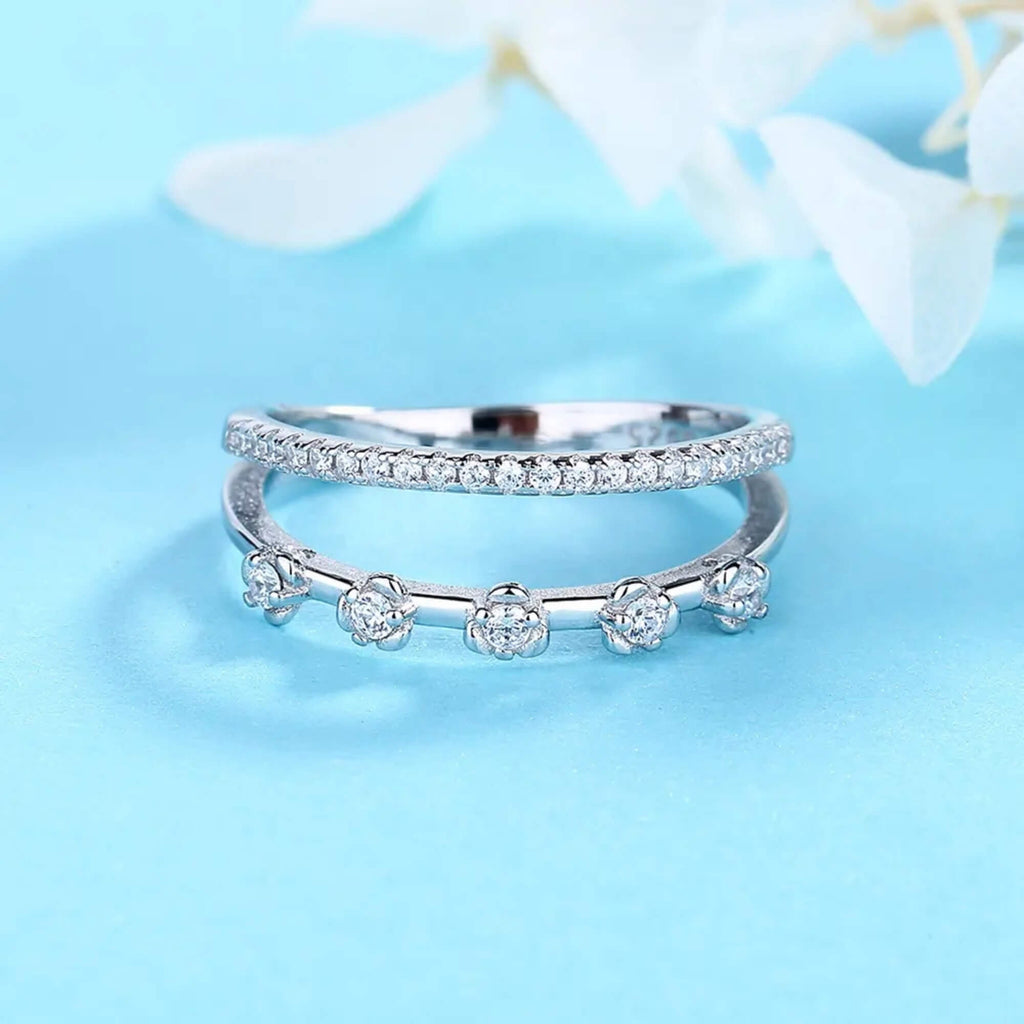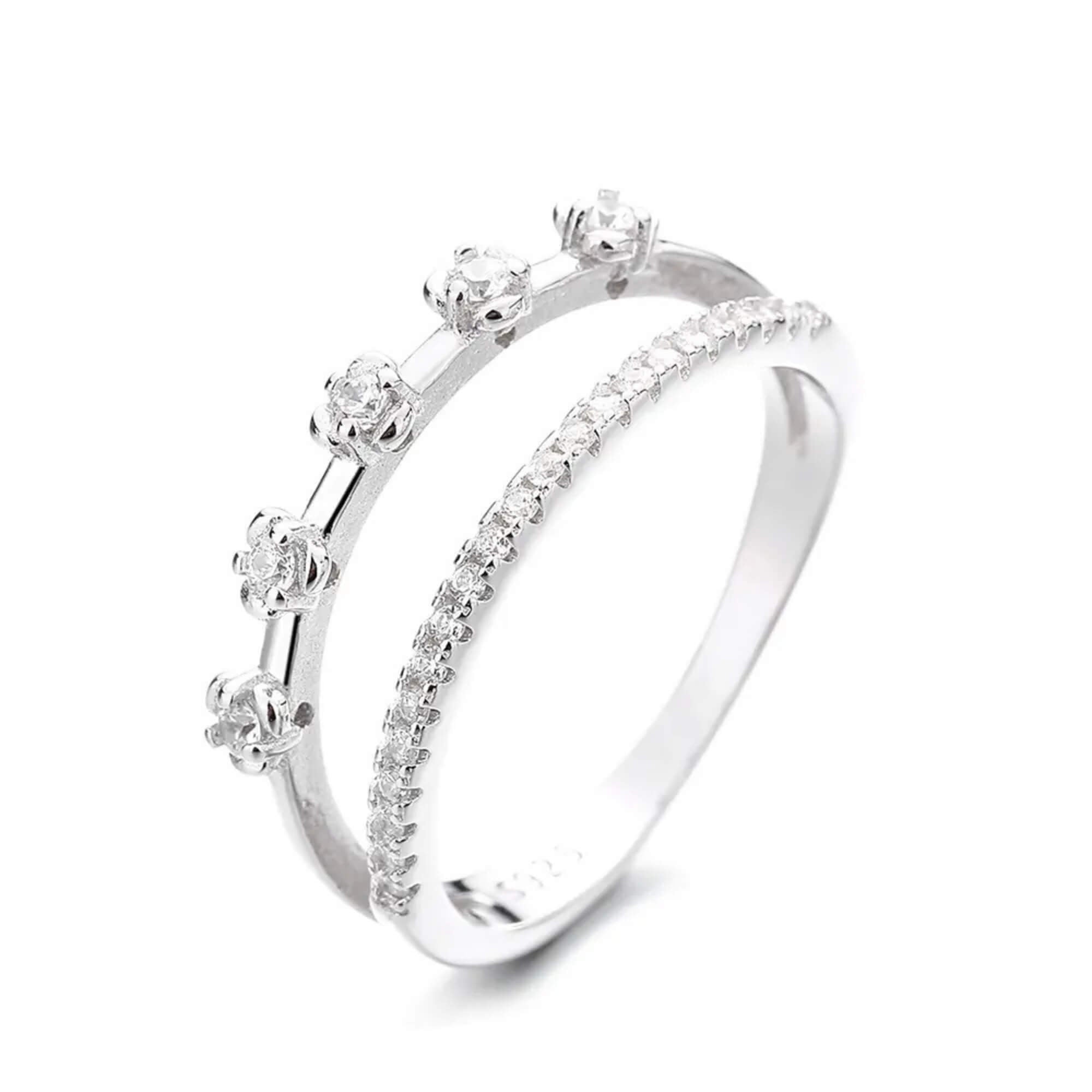 Een delicate zilveren ring die klassiek design prachtig combineert met delicate bloemdetails. Hij bestaat uit twee verschillende banden: één versierd met glinsterende zirkonia's en de andere met vijf delicate rozen. De combinatie van fijne glitter en zachte organische details creëert een harmonieuze balans tussen elegantie en romantiek die u niet mag missen.