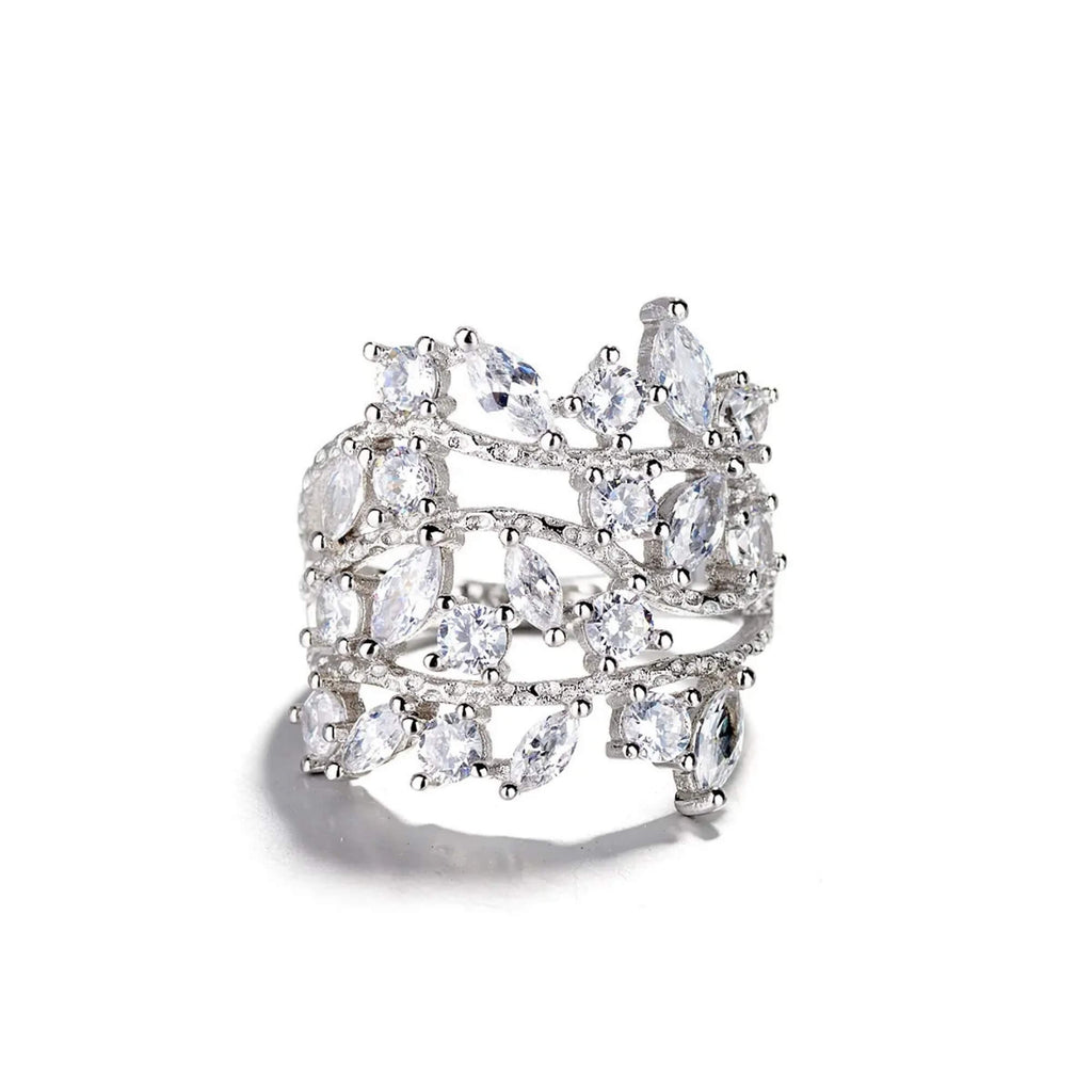 Prachtige zilveren ring met verweven lijnen die lijken op delicate takken, versierd met glinsterende zirkonia's. Het verfijnde vakmanschap en het organisch geïnspireerde ontwerp creëren een opvallende balans tussen elegantie en artisticiteit. Deze ring, die de schittering van de natuur vastlegt, is een statement piece voor wie verfijnde schoonheid en uitzonderlijke details waardeert.
