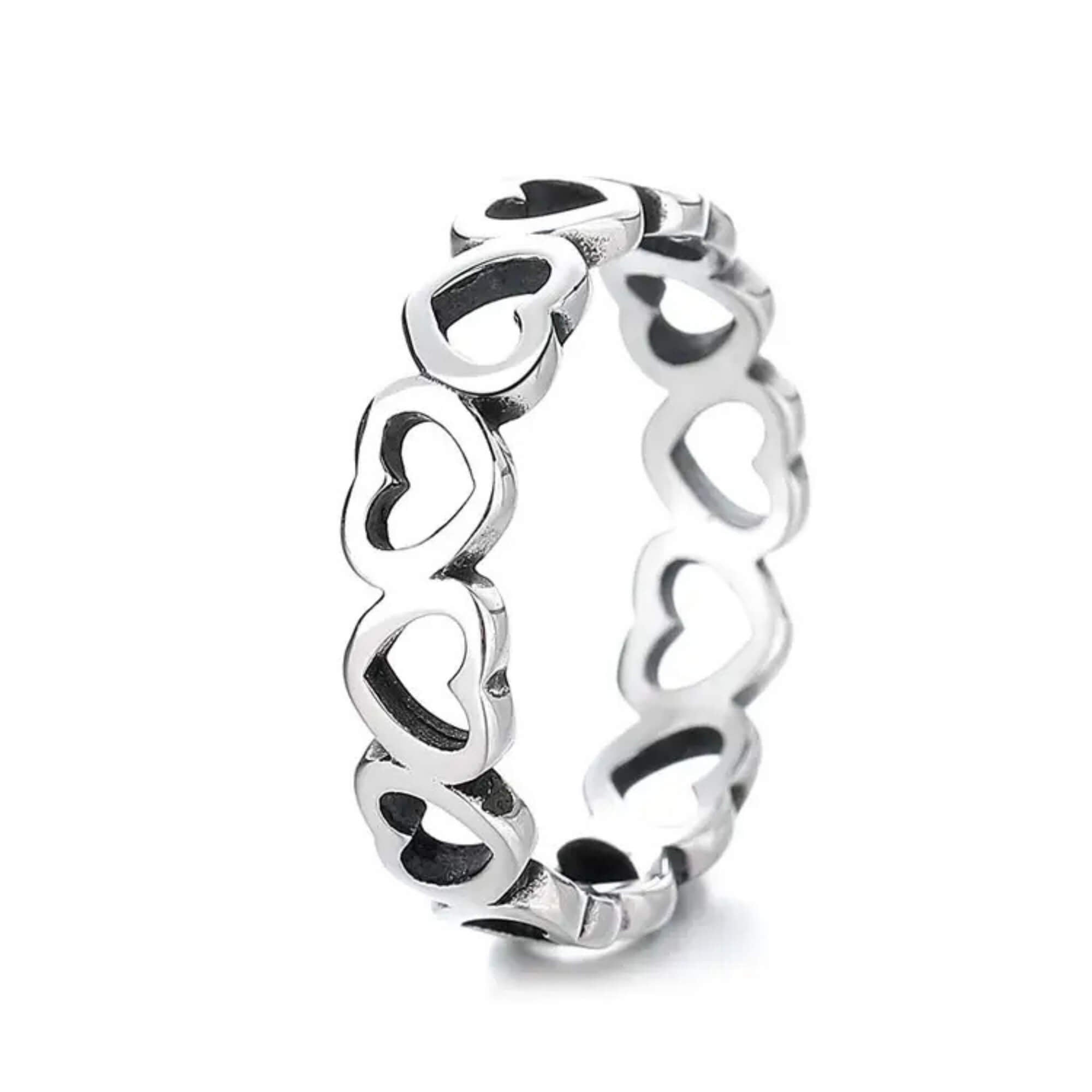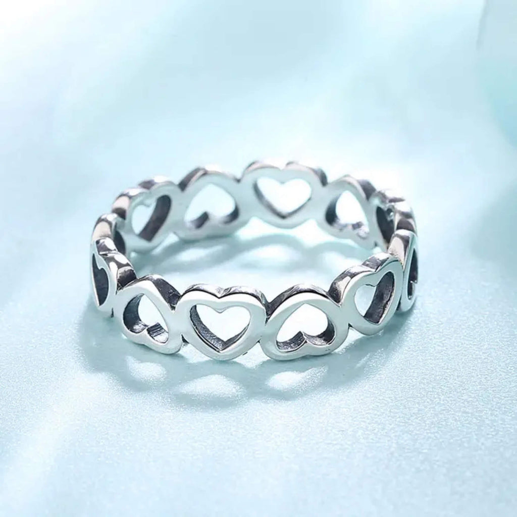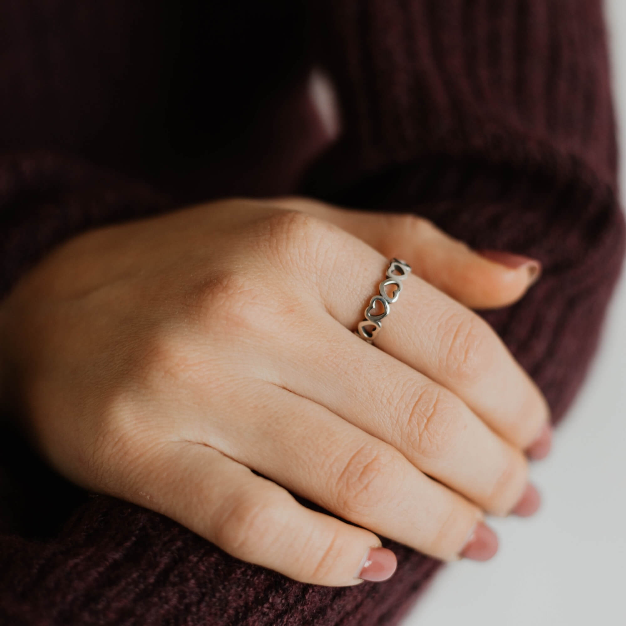 Zilveren ring met een naadloos ontwerp van verweven hartvormige elementen, die een harmonieus ritme creëren dat de liefde in haar puurste vorm viert. Minimalistisch maar boeiend, symboliseert het ontwerp warmte, verbondenheid en de schoonheid van gedeelde genegenheid. Een tijdloos stuk dat ons herinnert aan de elegantie die in eenvoud schuilt.