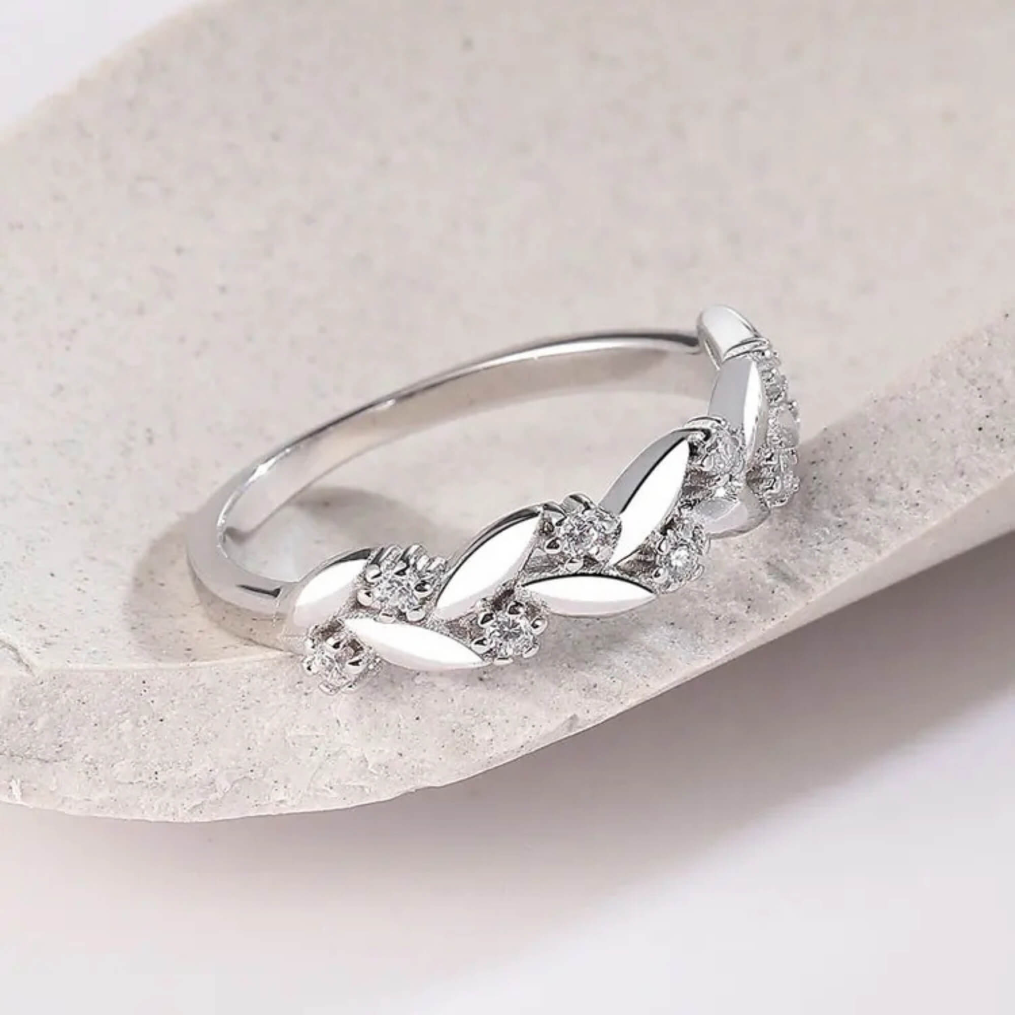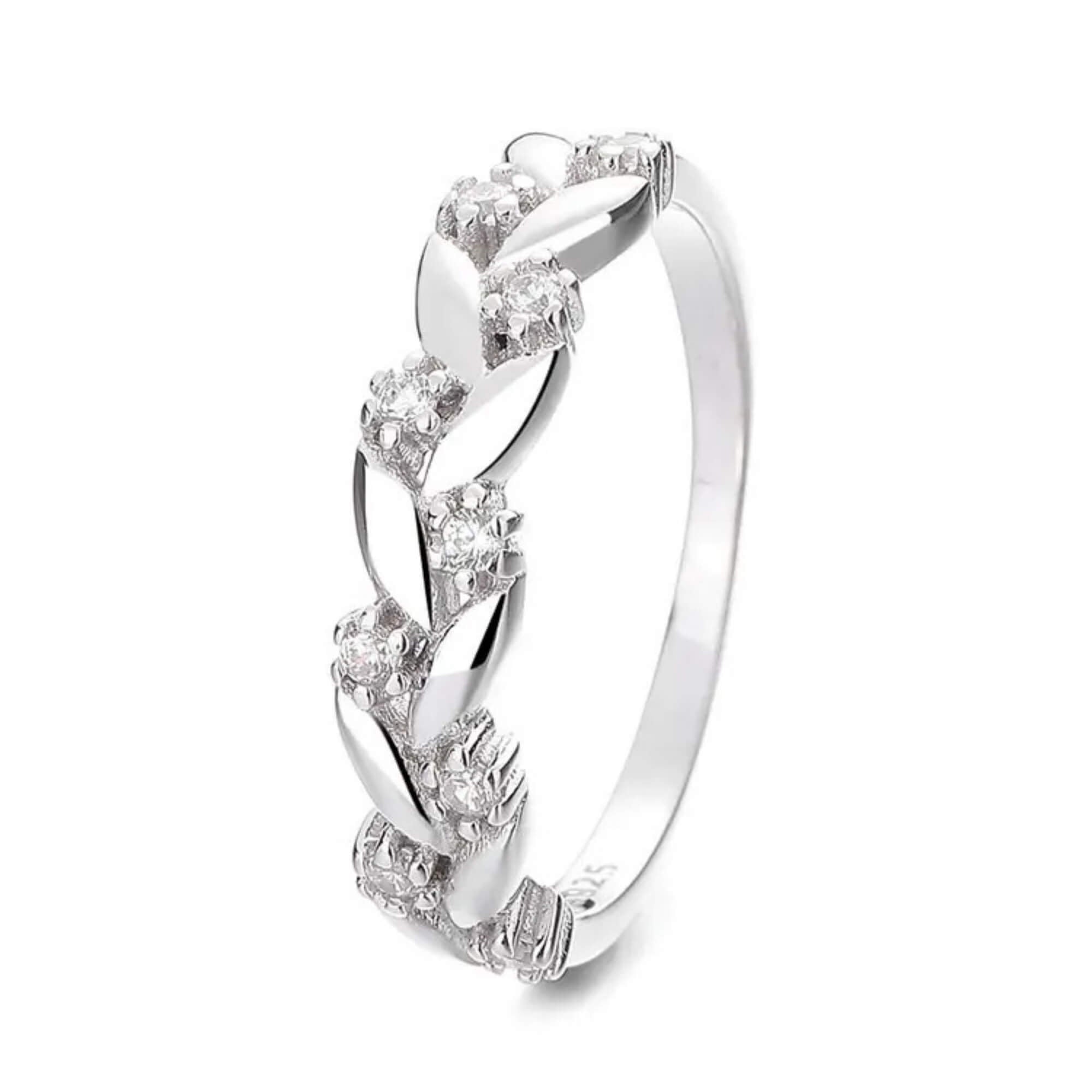 Een zilveren ring in de vorm van een delicate krans, met bladachtige details gecombineerd met glinsterende zirkonia's. Geïnspireerd door de natuur combineert het ontwerp klassieke elementen met een vleugje organische schoonheid. De ring is met uitzonderlijke precisie vervaardigd, vangt prachtig licht en is een perfecte keuze voor elke liefhebber van bloemenmotieven.