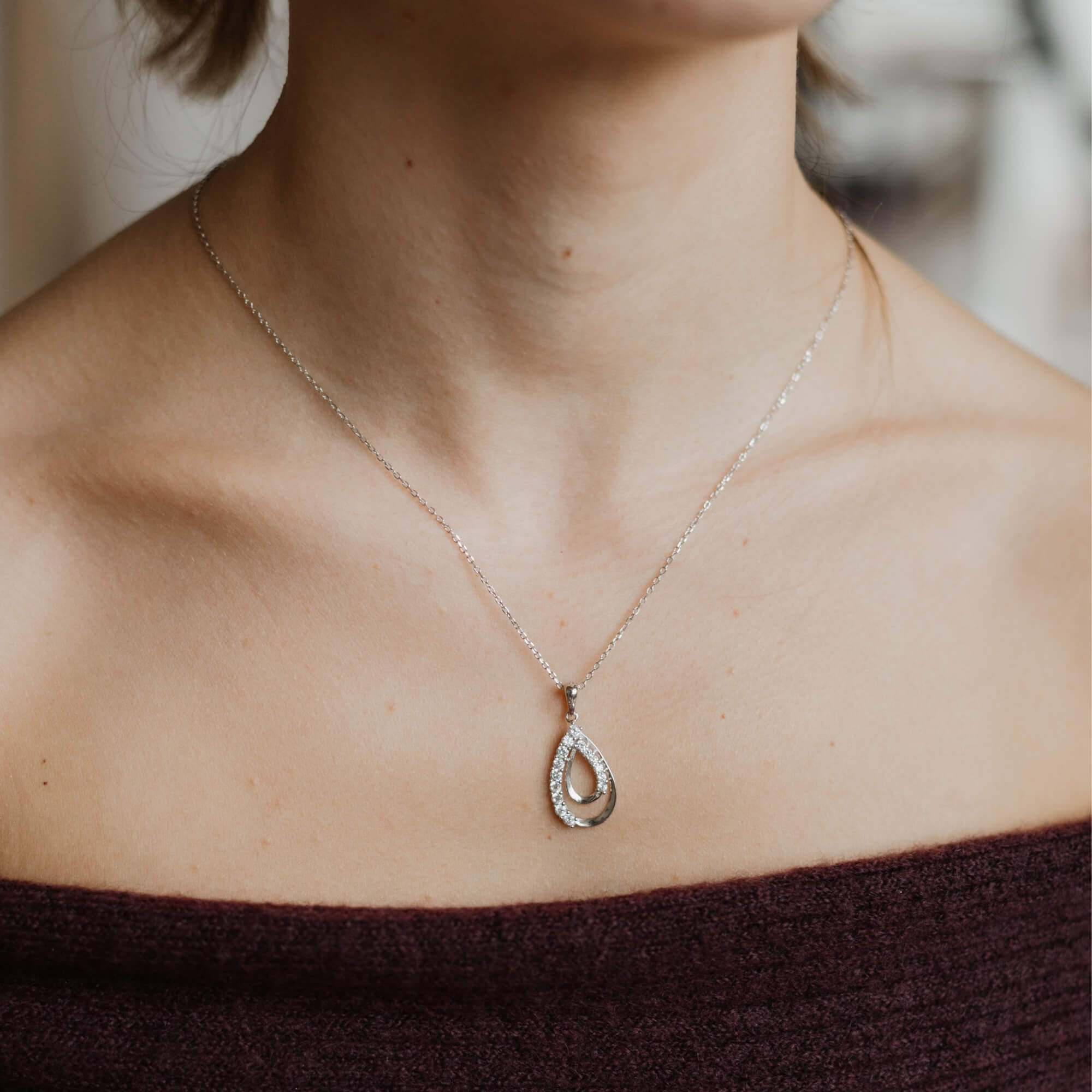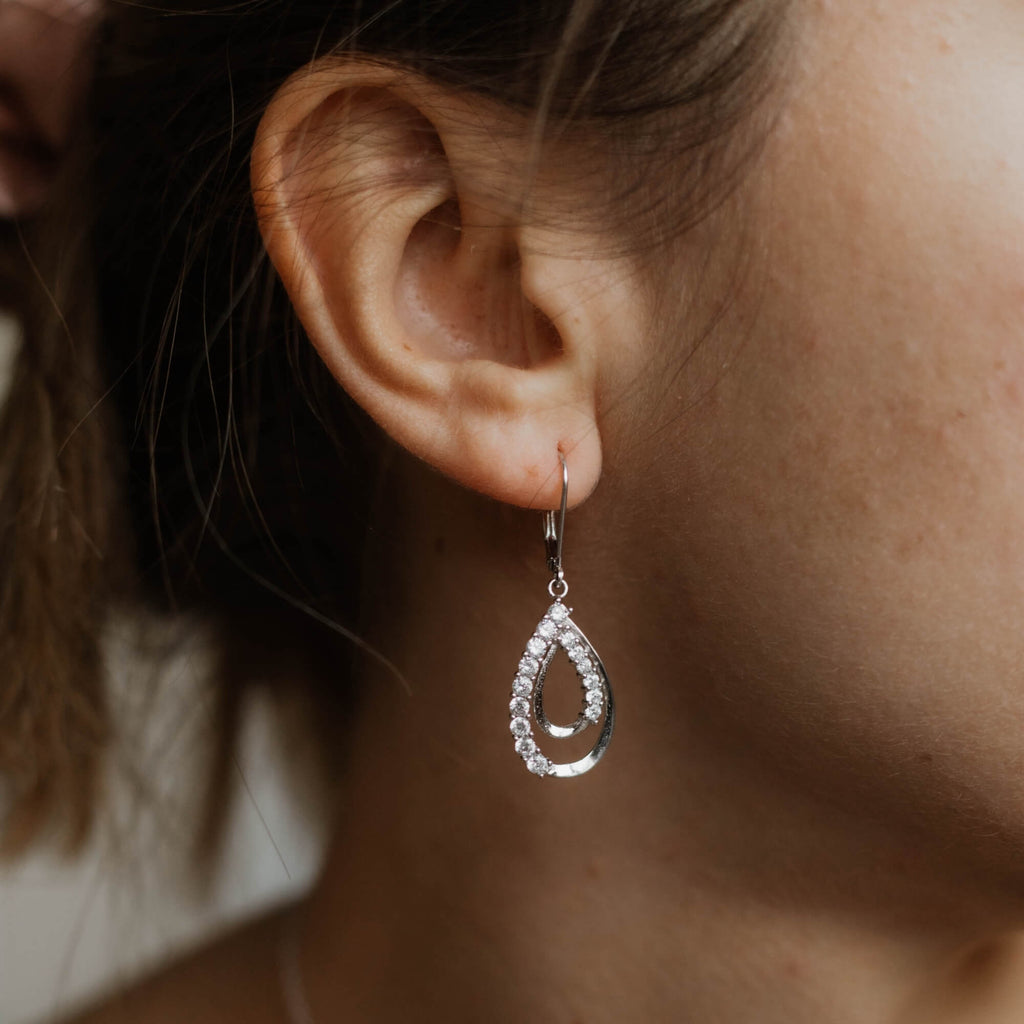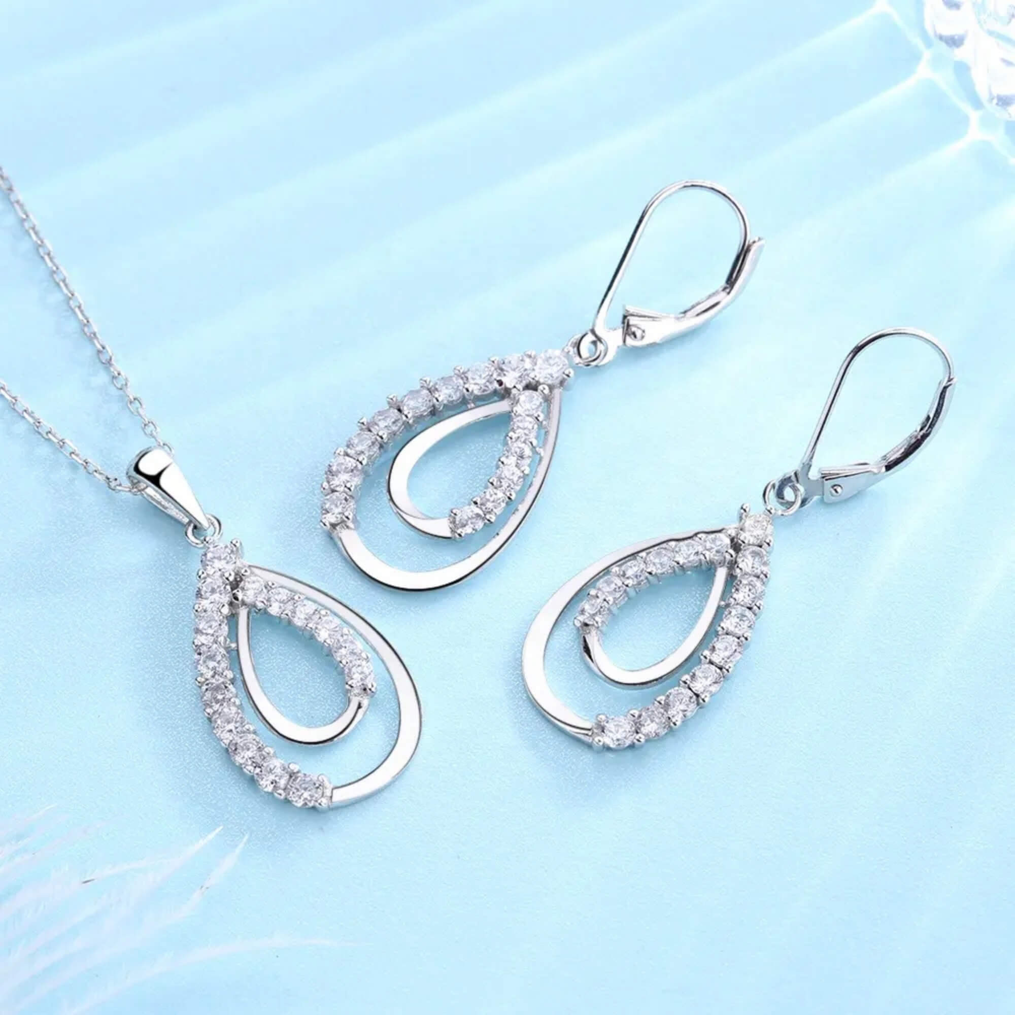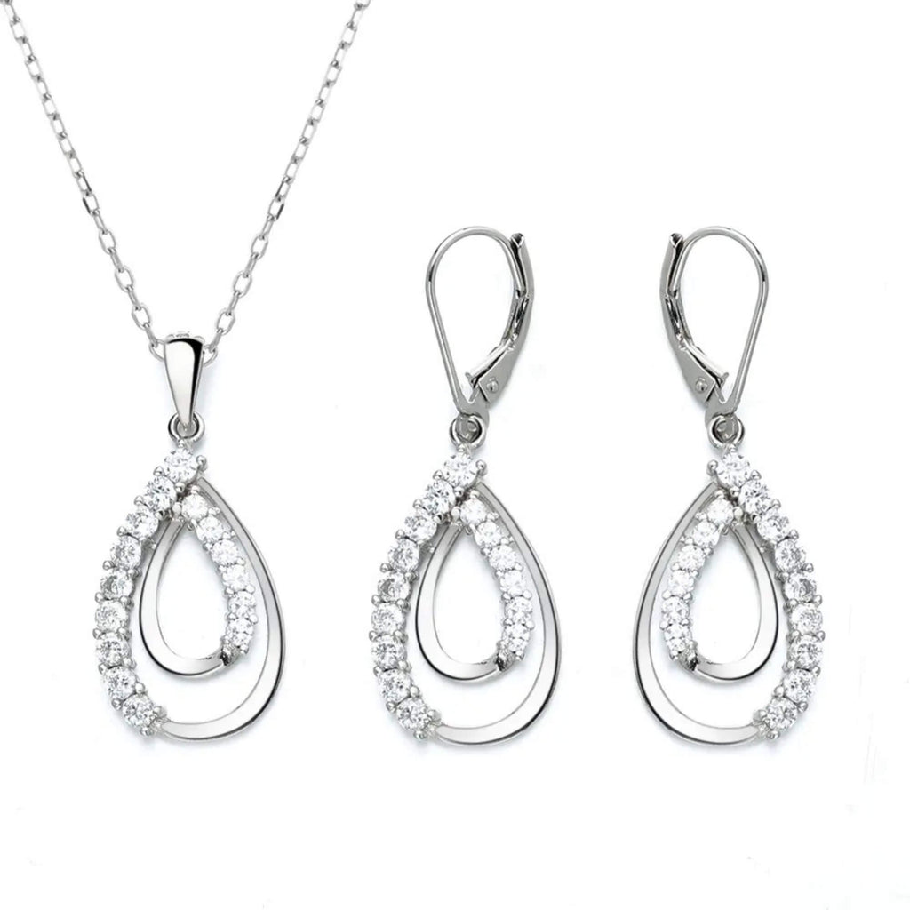 Een zilveren sieradenset bestaande uit een druppelvormige ketting en bijpassende oorbellen. De elegante contouren zijn gedeeltelijk versierd met sprankelende zirkonia's, wat het lichte en luchtige ontwerp versterkt. De oorbellen zijn voorzien van veilige Franse hendelsluitingen, voor optimaal draagcomfort, zelfs bij langdurig dragen. Deze set is ontworpen voor speciale gelegenheden, voegt een vleugje luxe toe en laat een blijvende indruk achter.