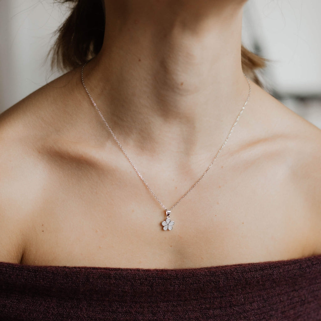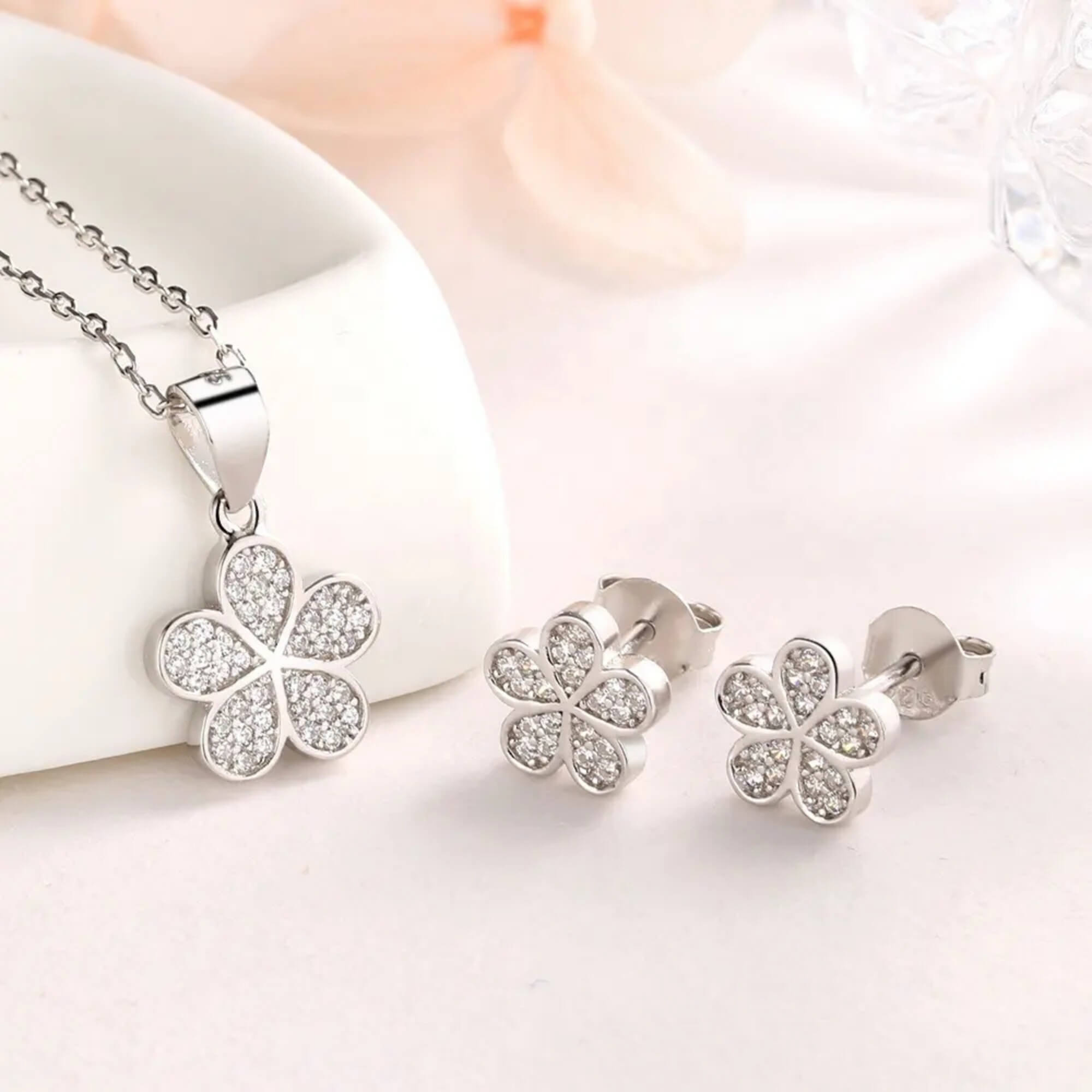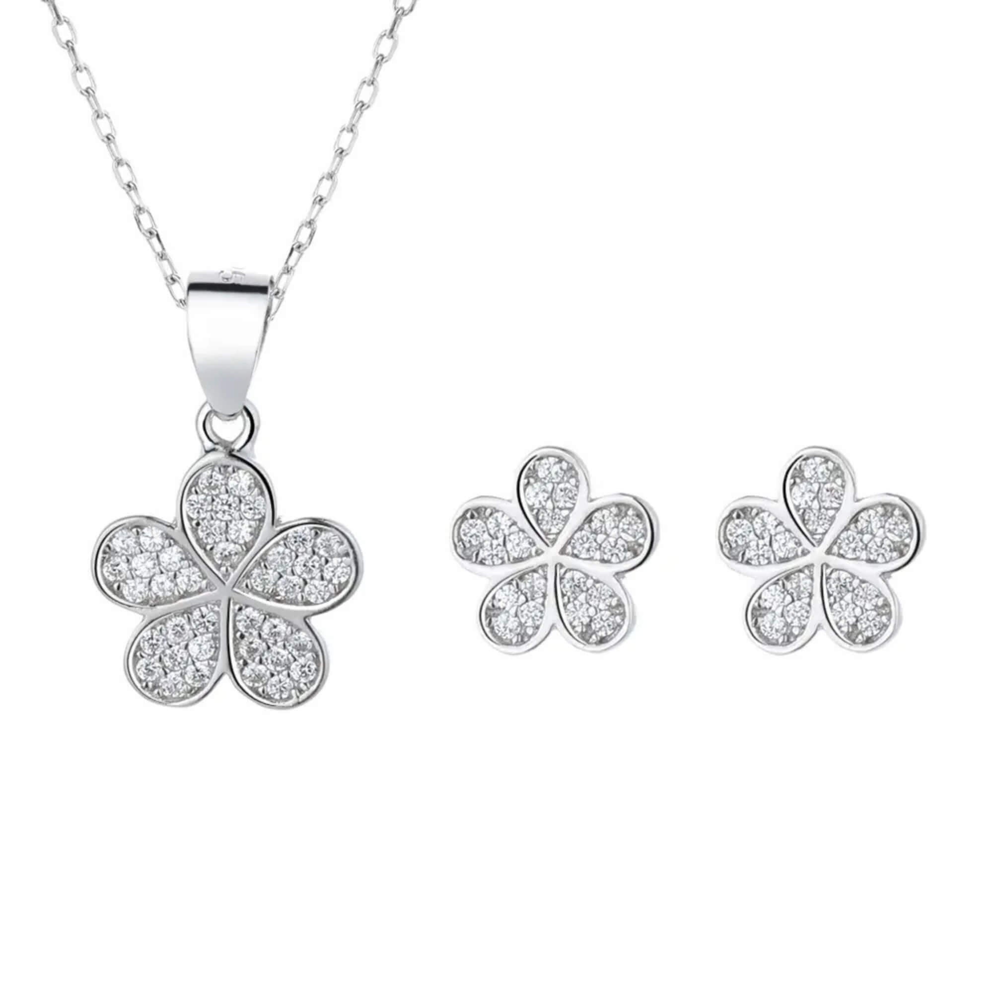 Een zilveren sieradenset met een bloemenketting en bijpassende oorbellen. Geïnspireerd door de tijdloze schoonheid van bloeiende bloemen, is elk sieraad versierd met delicate zirkonia's die frisheid en charme uitstralen. Het complexe bloemblaadjesontwerp roept de essentie van de lente en het ontwaken van de natuur op. De set is een heerlijke keuze voor vrouwen die graag positiviteit en elegantie aan hun dag toevoegen met de magie van bloemmotieven.