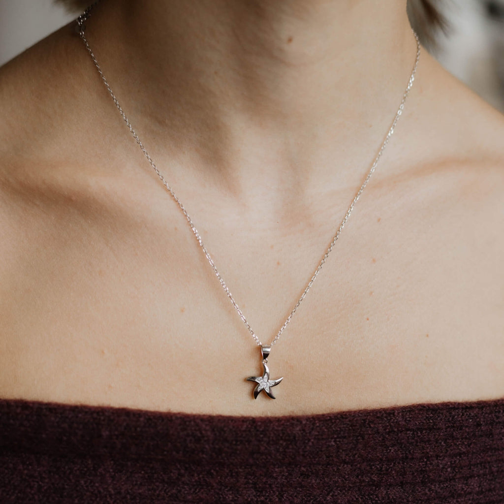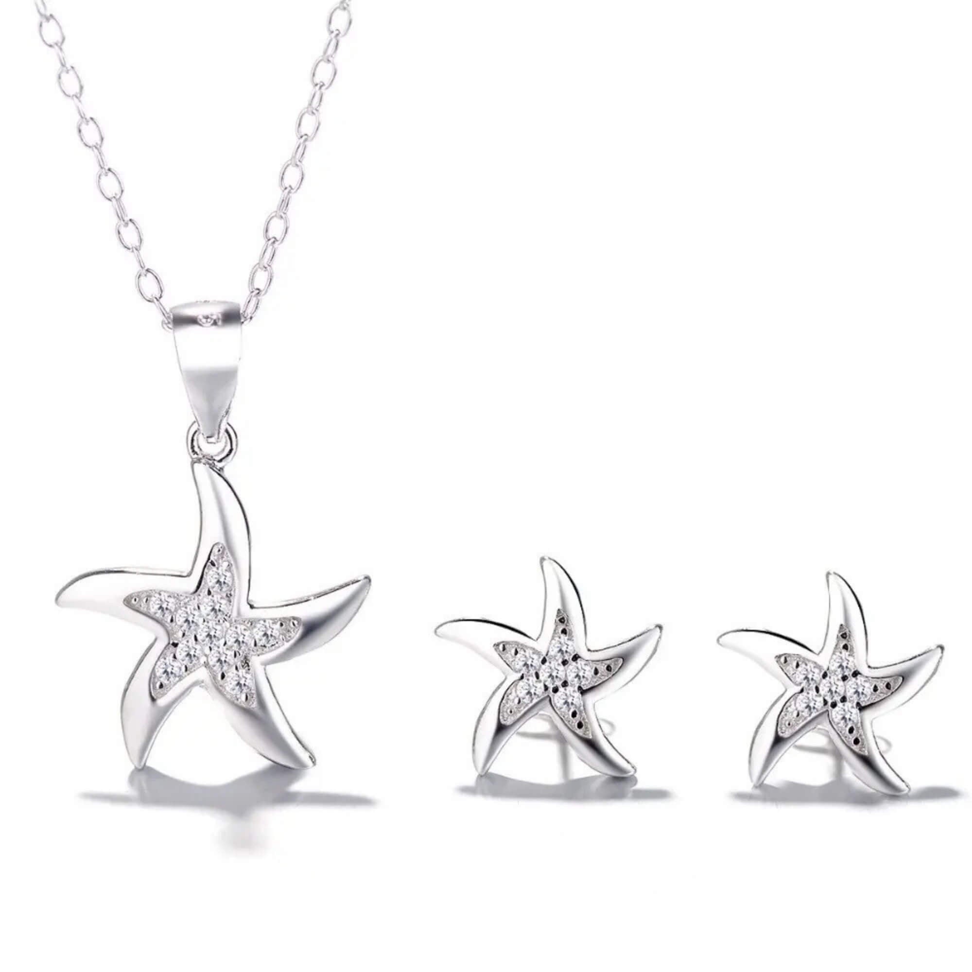 Een zilveren sieradenset met een verfijnde ketting en bijpassende oorbellen, elk in de vorm van een prachtige zeester. Versierd met glinsterende zirkonia's, is dit ontwerp geïnspireerd op de schoonheid van de zee en haar schatten. Deze set legt de magie van zomerdagen en zeebriesjes perfect vast en is ideaal voor vrouwen die hun liefde voor de zee willen vieren of gewoon een herinnering aan hun avonturen aan de kust willen dragen.