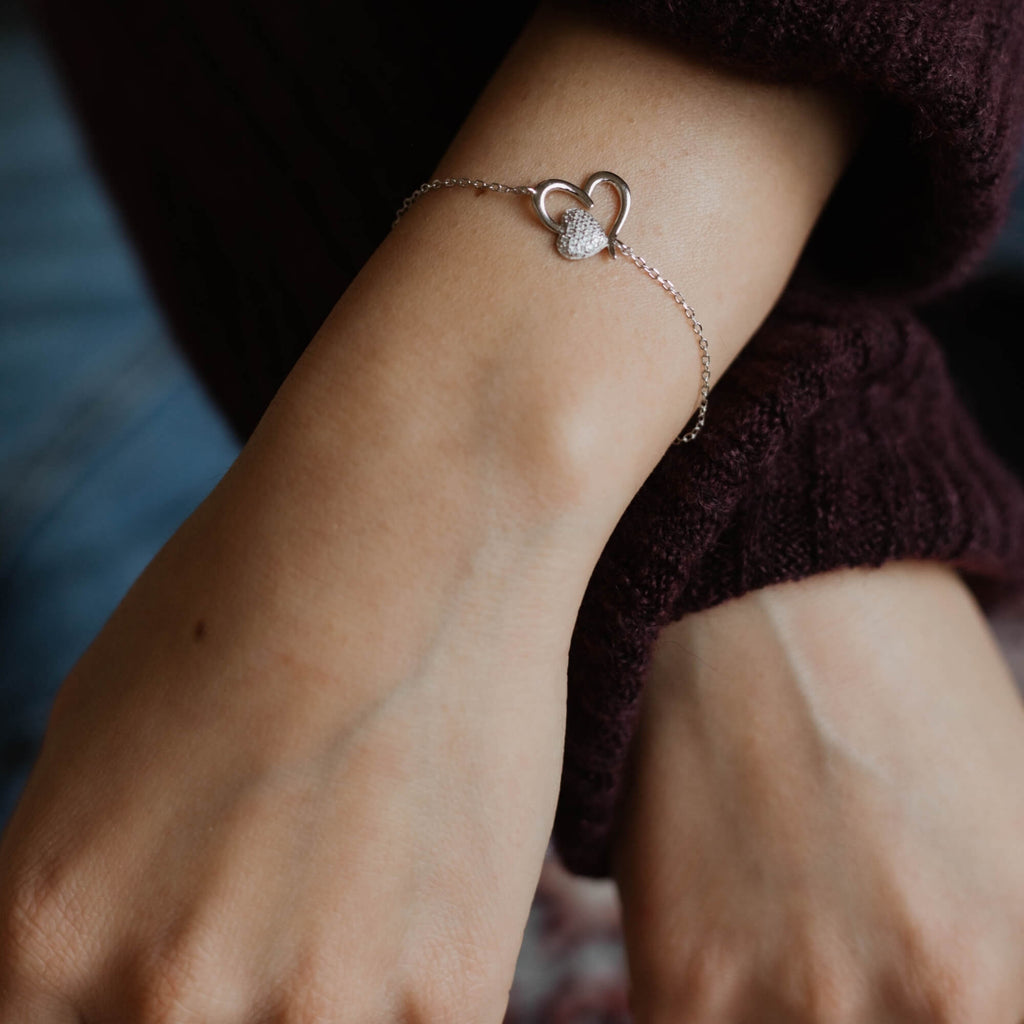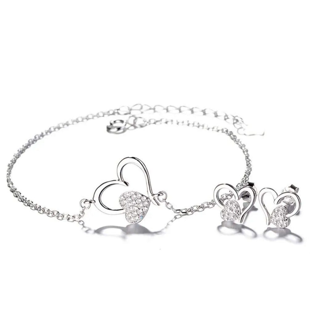 Zilveren sieradenset bestaande uit een armband en oorbellen met een elegant hartontwerp. Delicaat verweven asymmetrische harten worden geaccentueerd door kleinere hartvormige elementen versierd met glinsterende zirkonia's, wat zorgt voor een harmonieuze en romantische look. Het draagt een boodschap vol emoties uit en is daarom de ideale keuze om uw liefde en genegenheid voor iemand speciaal te uiten.