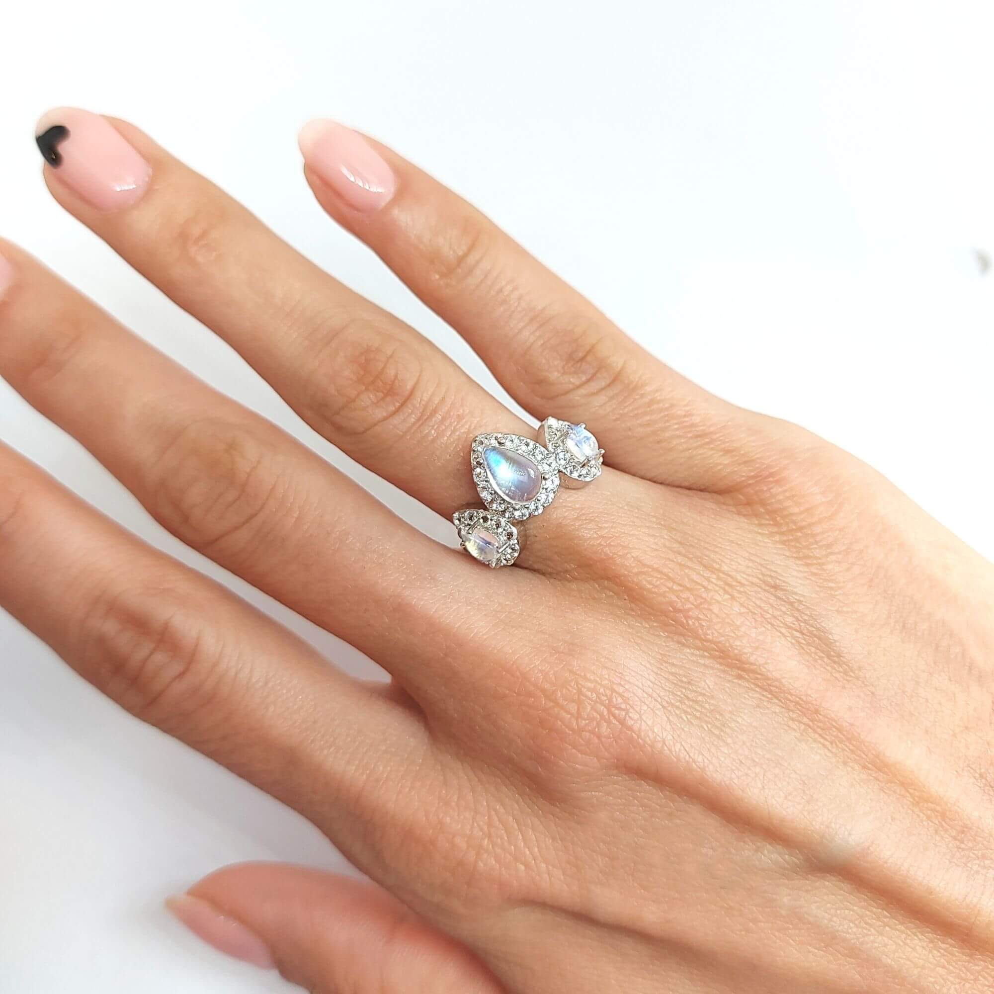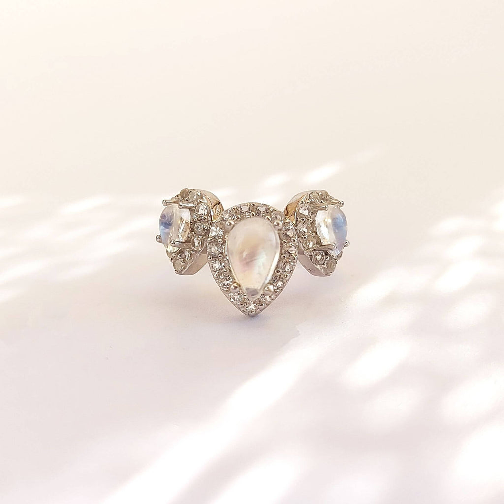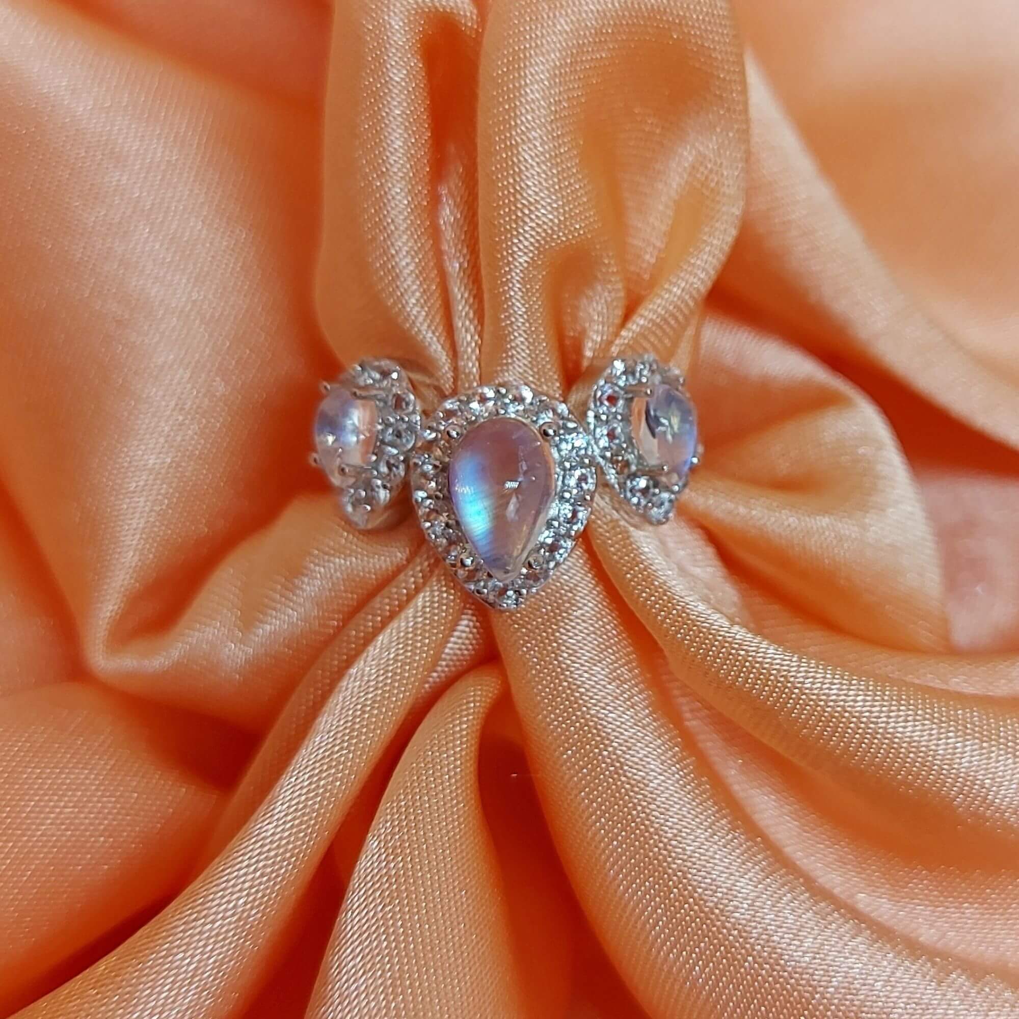 Geniet van de allure van deze fascinerende zilveren ring met natuurlijke regenboogmaanstenen en oogverblindende edelstenen van witte topaas. Het unieke ontwerp toont druppelvormige mineralen met iriserende kleuren die elke dame zeker zullen boeien en een onmiddellijk gevoel van liefde en betovering oproepen. Deze prachtige edelstenen bezitten het opmerkelijke vermogen om van tint te veranderen afhankelijk van het omgevingslicht, waardoor een element van mysterie en onweerstaanbare charme aan de ring wordt toegevoegd.