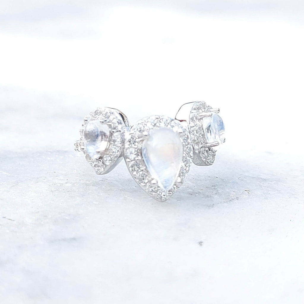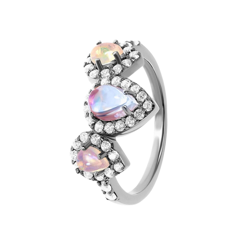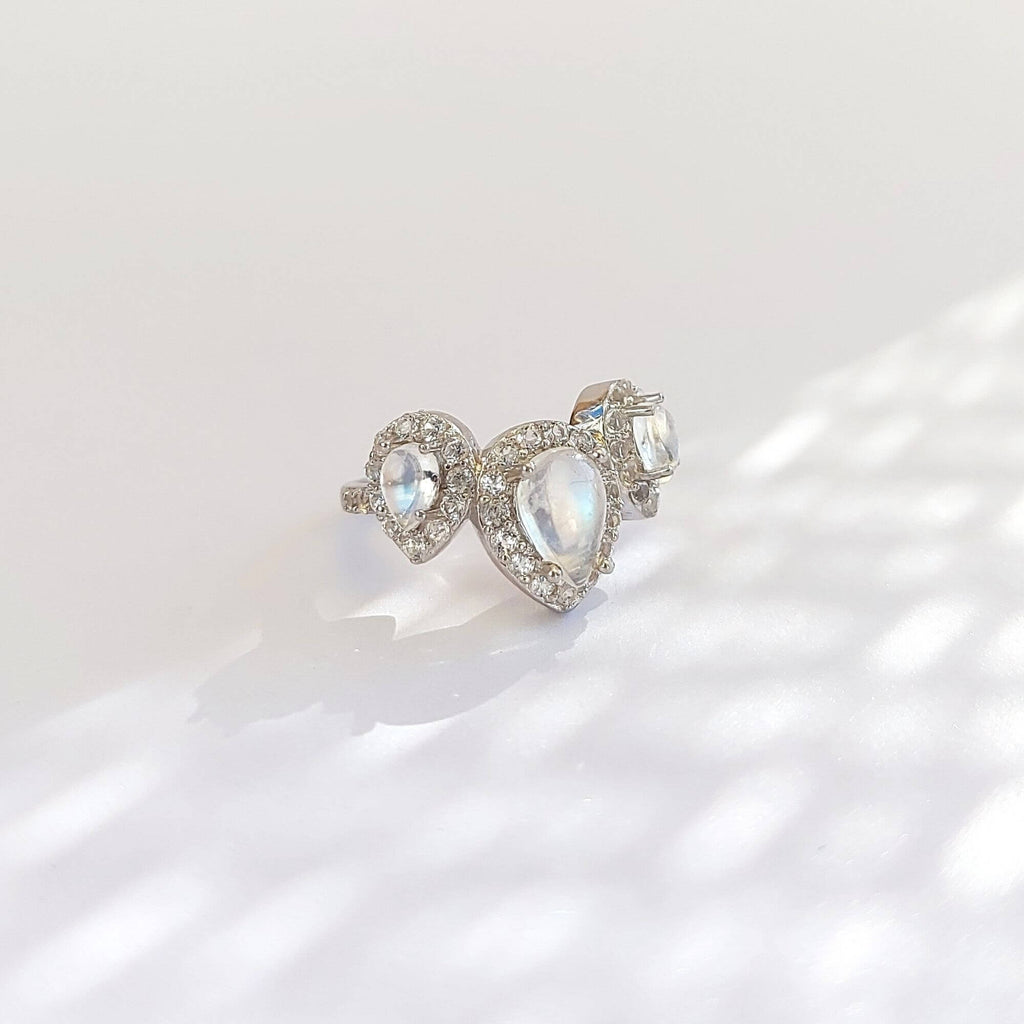 Geniet van de allure van deze fascinerende zilveren ring met natuurlijke regenboogmaanstenen en oogverblindende edelstenen van witte topaas. Het unieke ontwerp toont druppelvormige mineralen met iriserende kleuren die elke dame zeker zullen boeien en een onmiddellijk gevoel van liefde en betovering oproepen. Deze prachtige edelstenen bezitten het opmerkelijke vermogen om van tint te veranderen afhankelijk van het omgevingslicht, waardoor een element van mysterie en onweerstaanbare charme aan de ring wordt toegevoegd.