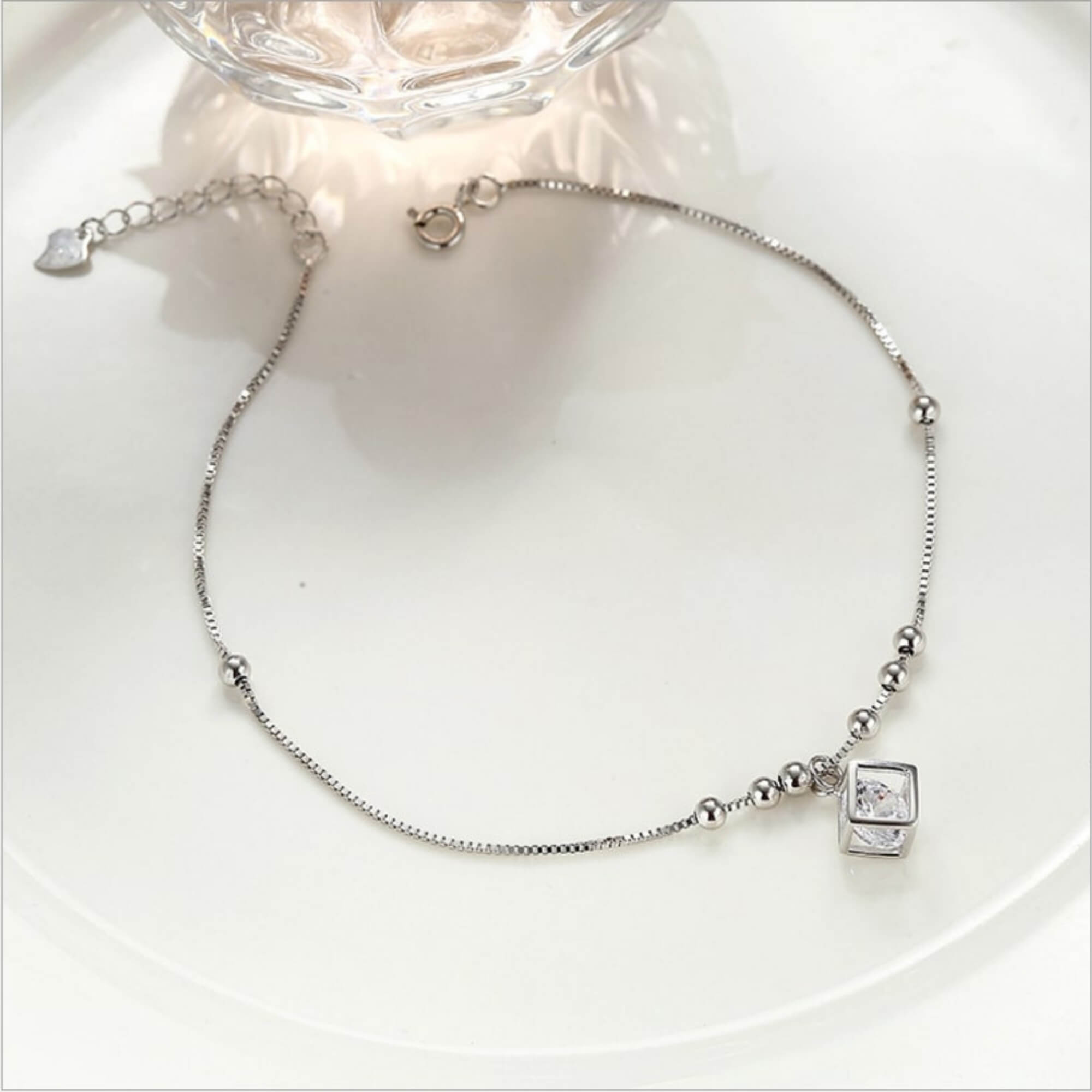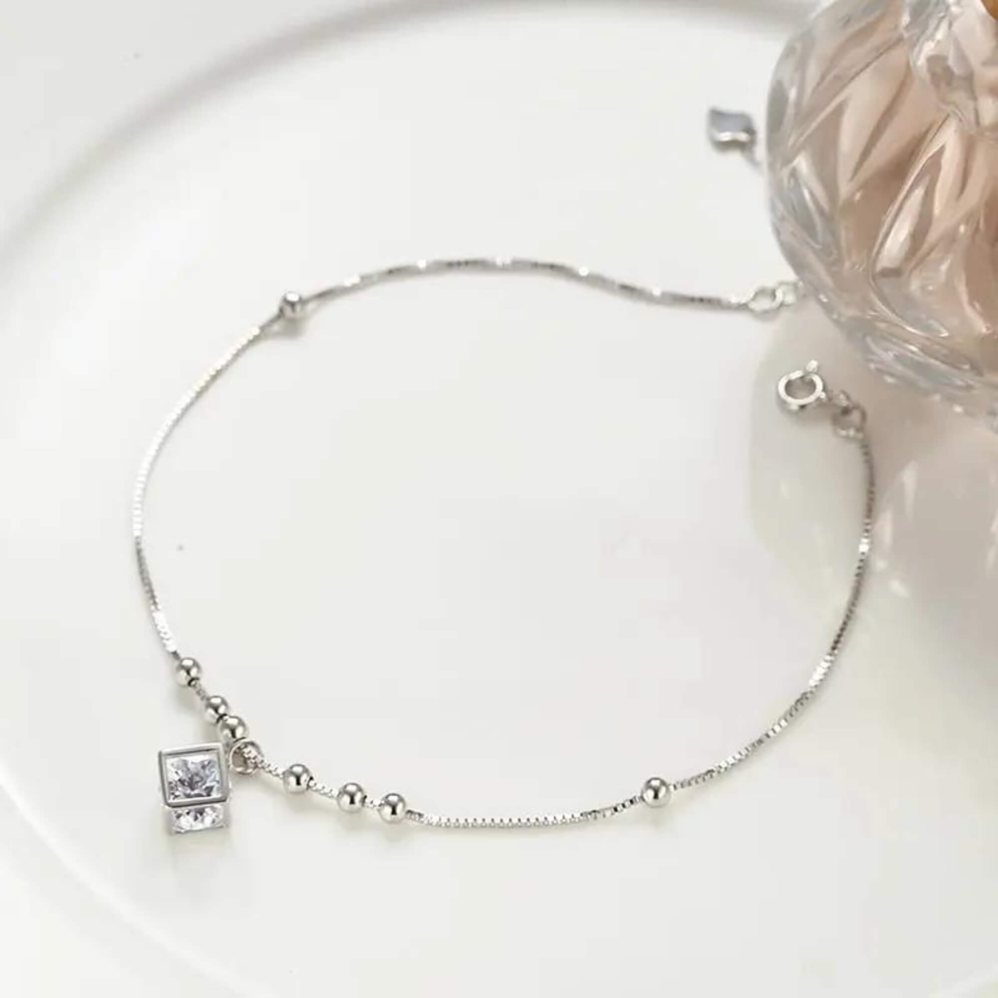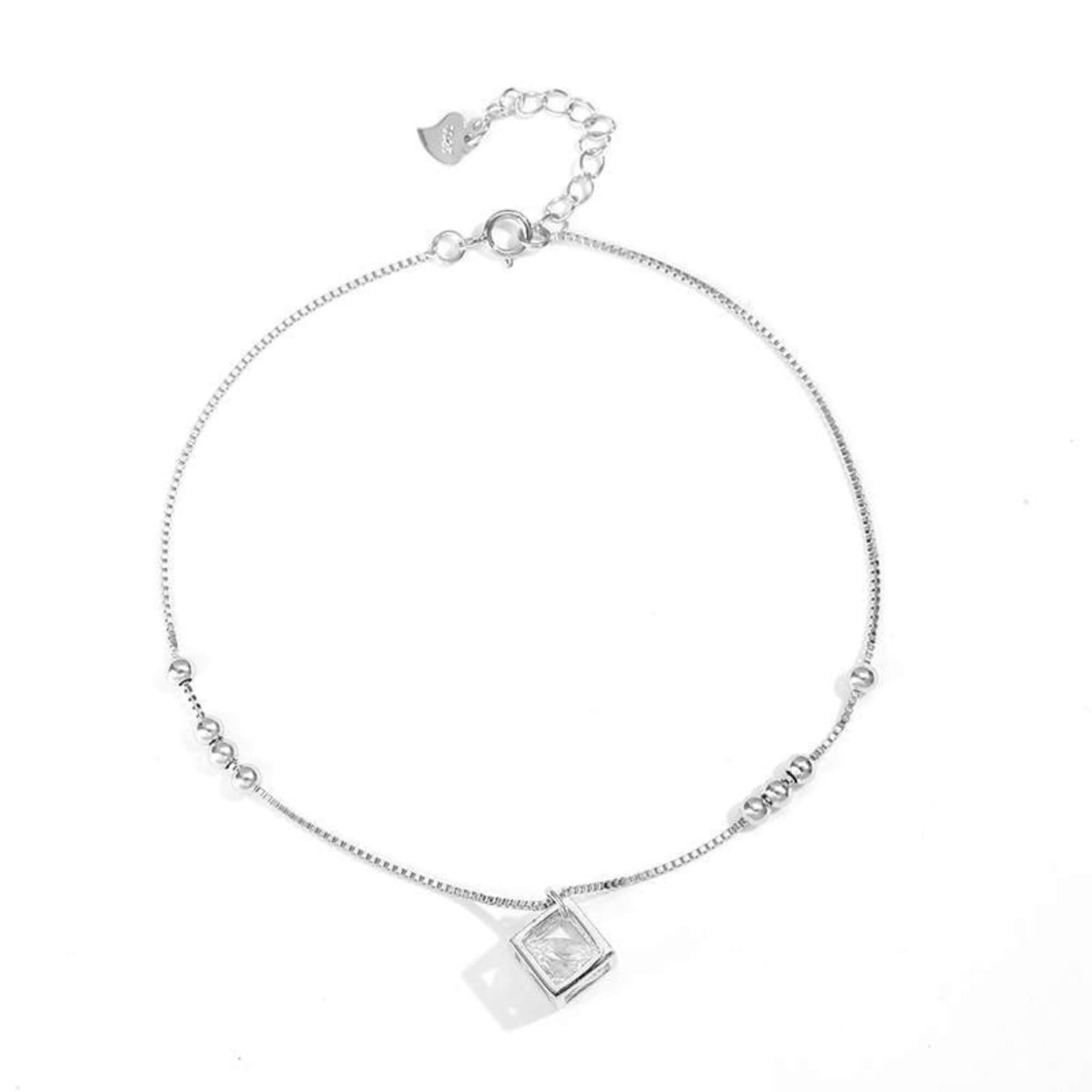 Dit delicate zilveren enkelbandje combineert finesse en comfort, waardoor het perfect is voor ontspannen stranddagen. De ingewikkelde vlecht is een bewijs van deskundig vakmanschap, terwijl de acht kleine kralen en de centrale zirkoniakubus sprankeling en verfijning toevoegen. Dit enkelbandje is ontworpen om je enkel te sieren en is een statement-item dat elke outfit verfraait en een onweerstaanbare charme en stijl belichaamt.