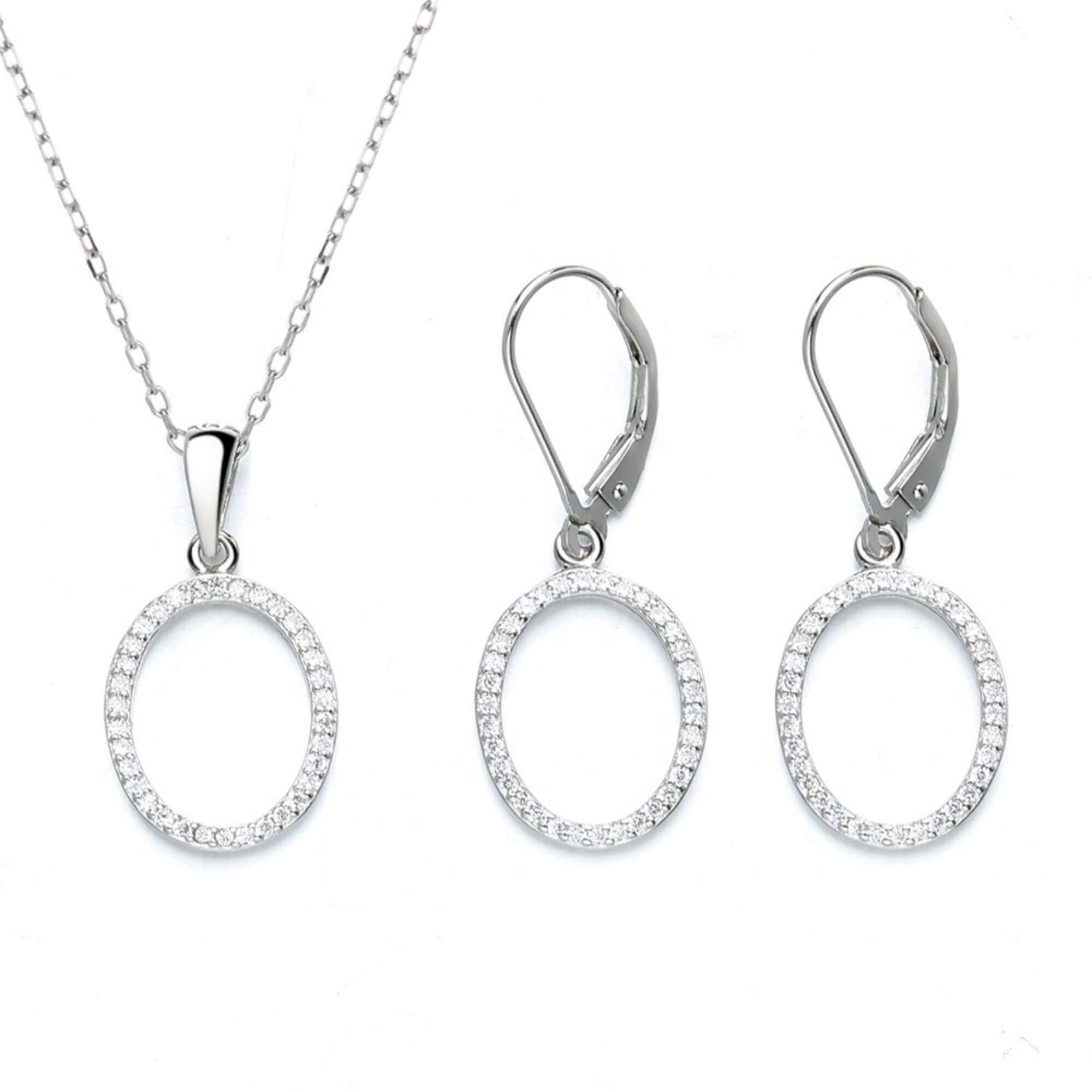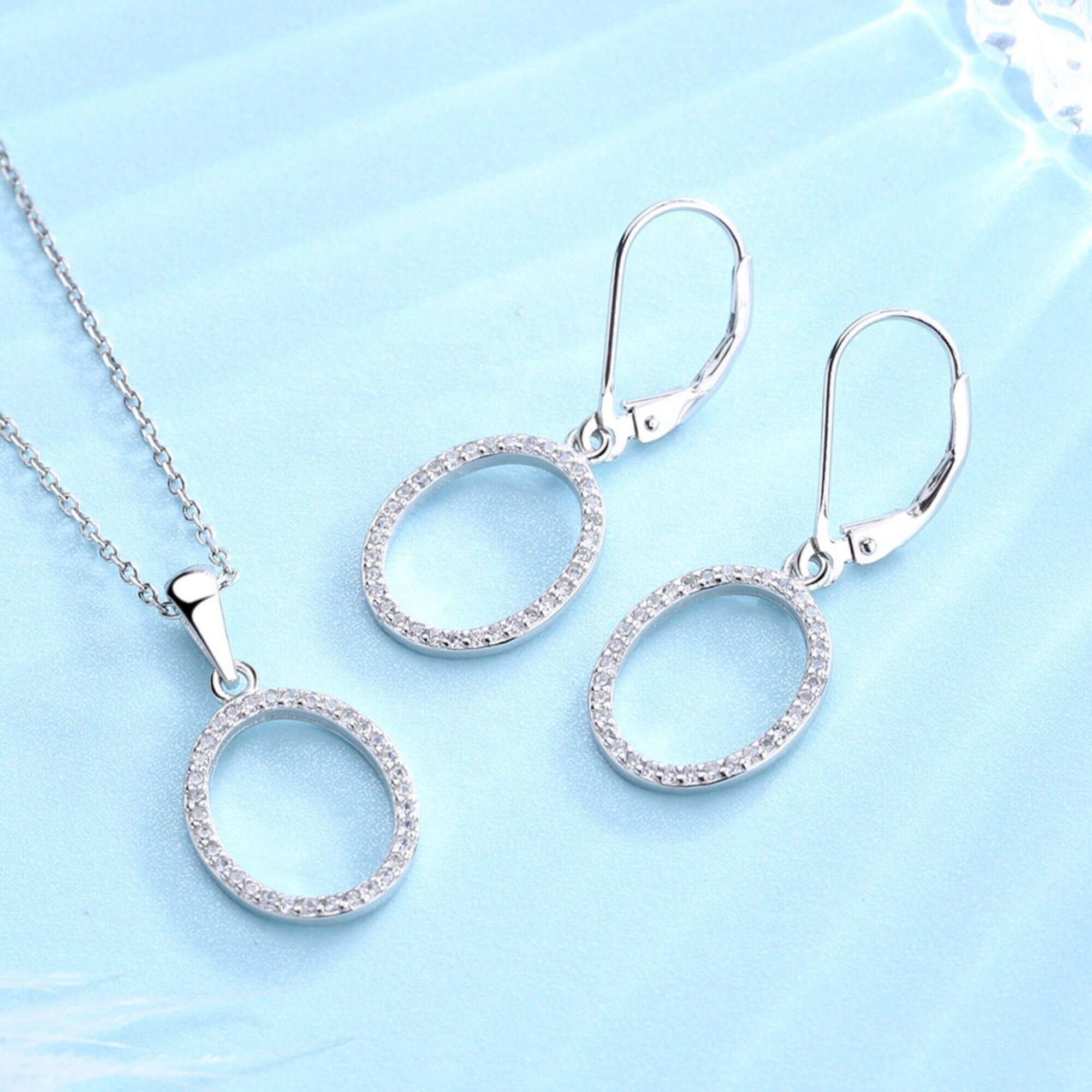Wikkel jezelf in de verfijning van onze zilveren ketting en oorbellenset, met een elegant ontwerp van delicate ovale accenten. De ware schoonheid van deze set ligt in de schitterende schittering van zorgvuldig geplaatste zirkoniastenen, waardoor elk stuk een oogverblindende glans krijgt. Deze set straalt verfijnd vakmanschap en een sfeer van tijdloze elegantie uit en belooft uw look naar een hoger niveau te tillen en een onvergetelijke indruk te creëren.