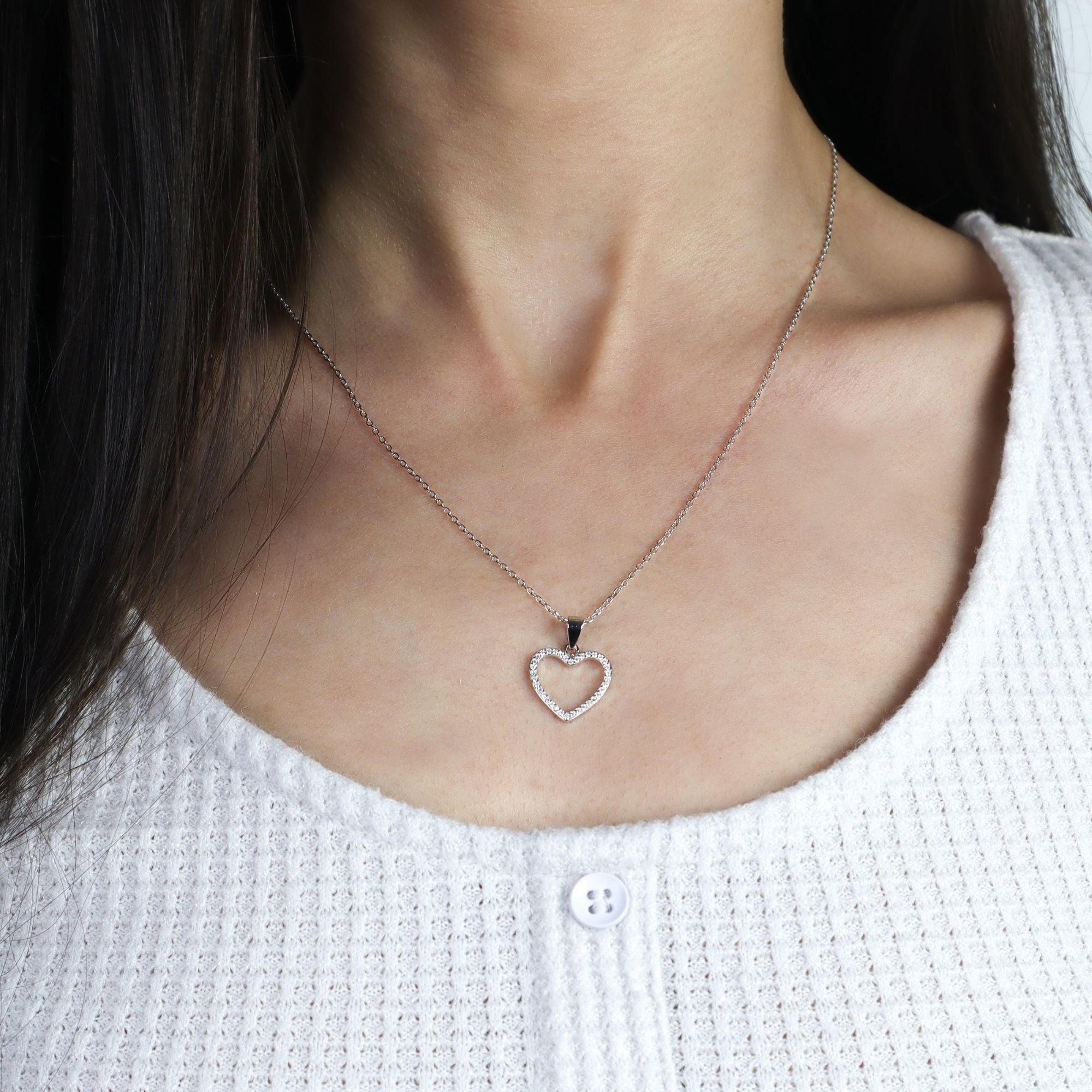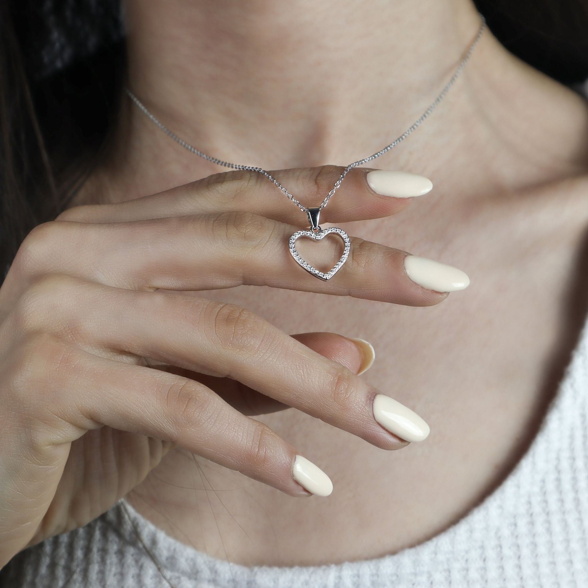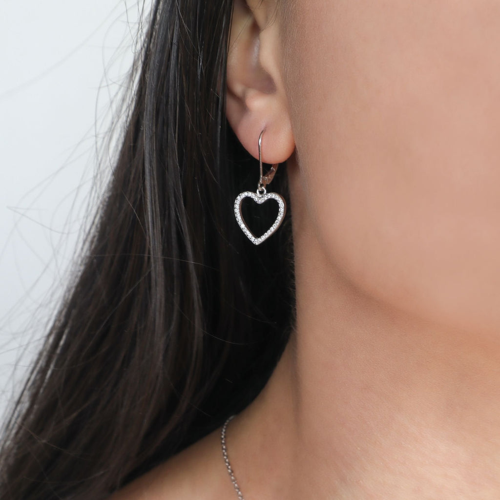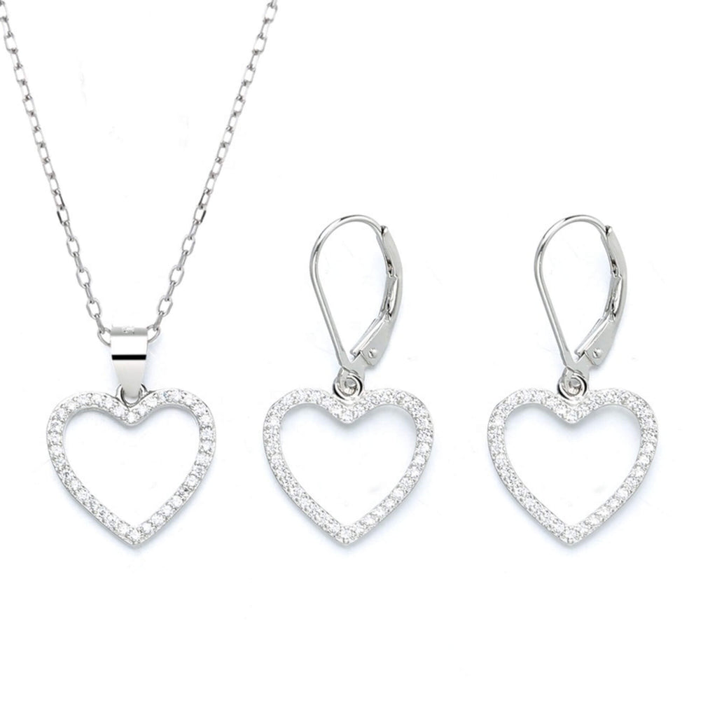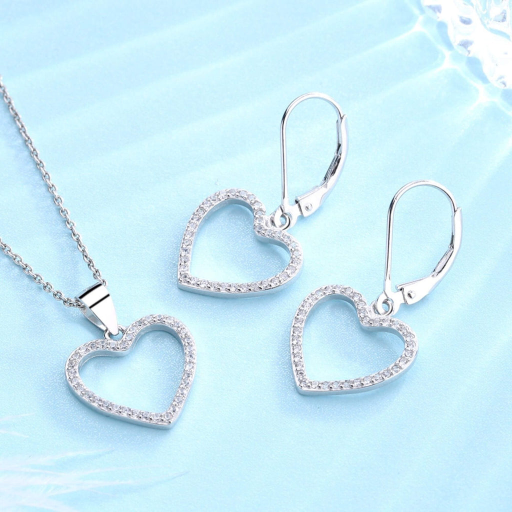 Breng je emoties over met ongeëvenaarde elegantie via onze hartvormige zilveren set. De betoverende ketting en bijpassende oorbellen zijn versierd met lichtgevende zirkoniastenen, die een etherische gloed uitstralen. Deze set is een stralend symbool van liefde en genegenheid, perfect om cadeau te doen aan een speciaal iemand of om te koesteren in je eigen collectie.