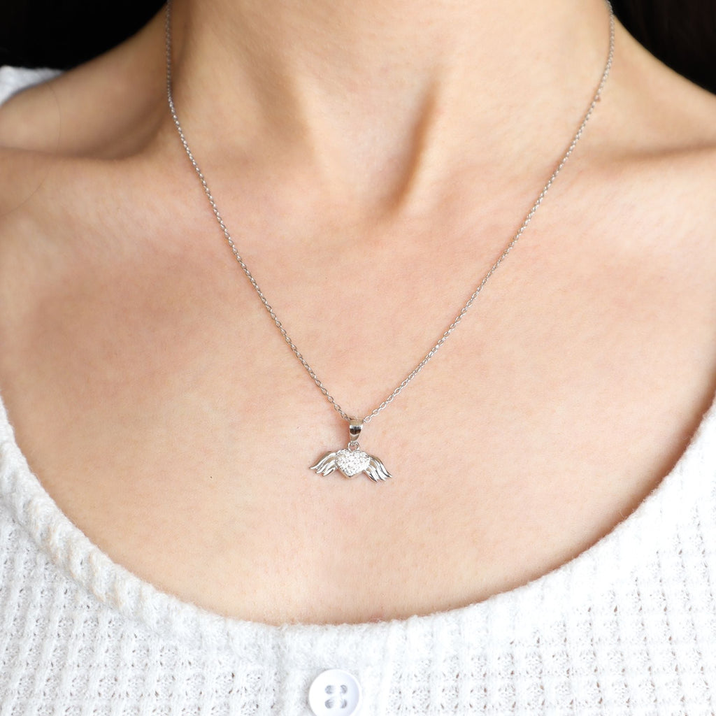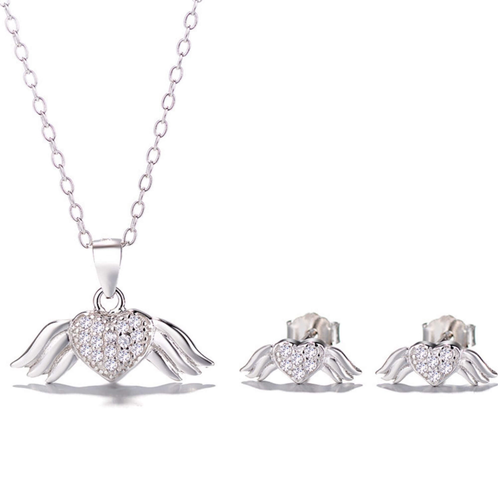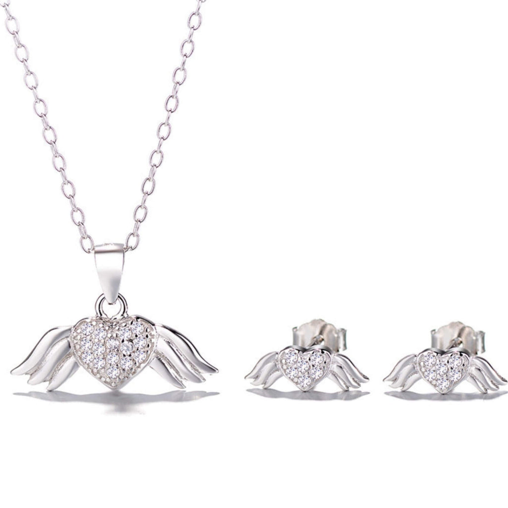 Begin op een betoverende reis met deze stralende zilveren set, bestaande uit een ketting en oorbellen versierd met met zirkonia's bezaaide engelenvleugels. Deze set symboliseert de diepe en eeuwige aard van de liefde, waardoor het perfect is voor het uiten van genegenheid of als een dierbaar geschenk. Elk stuk dient als een bewijs van tijdloze liefde en toewijding.