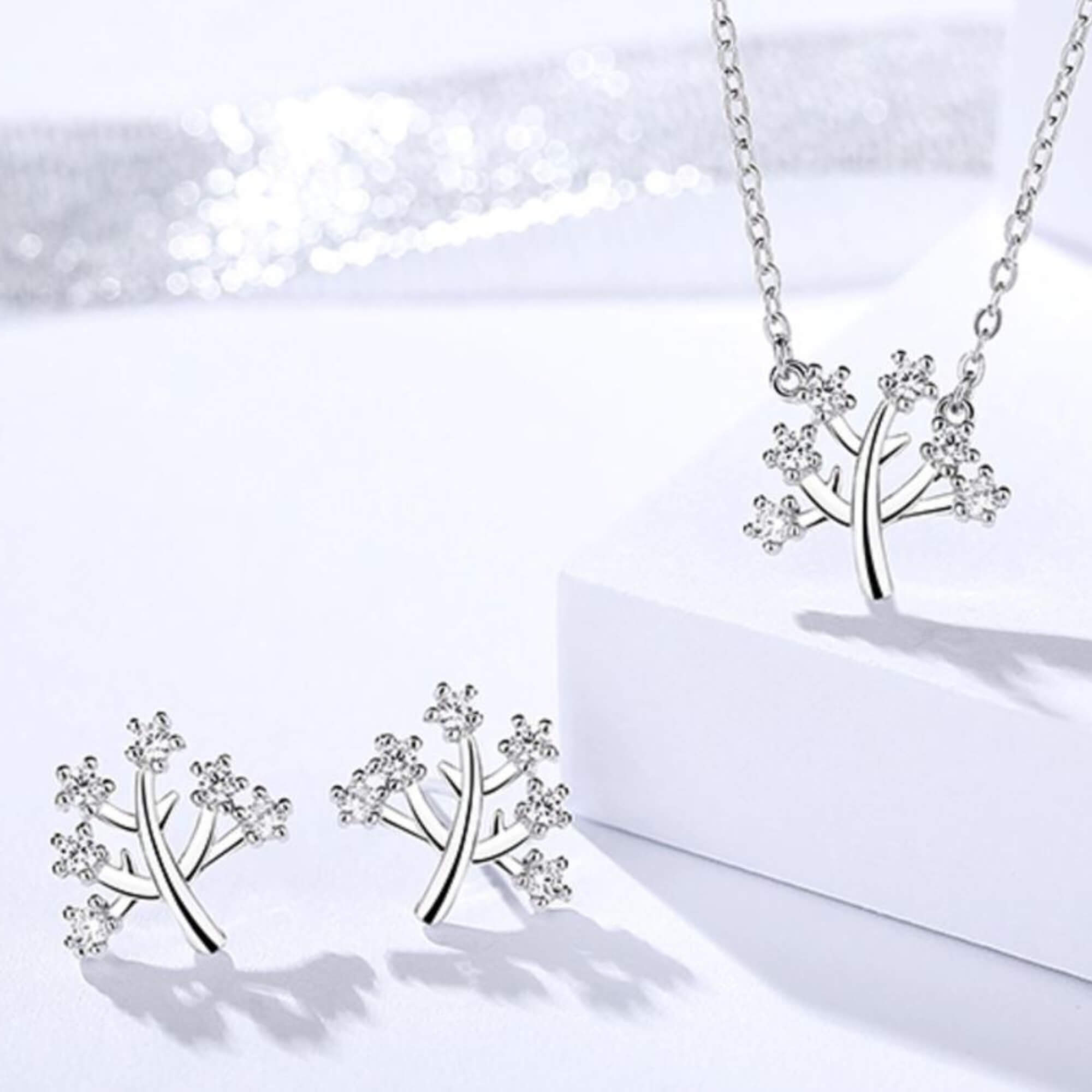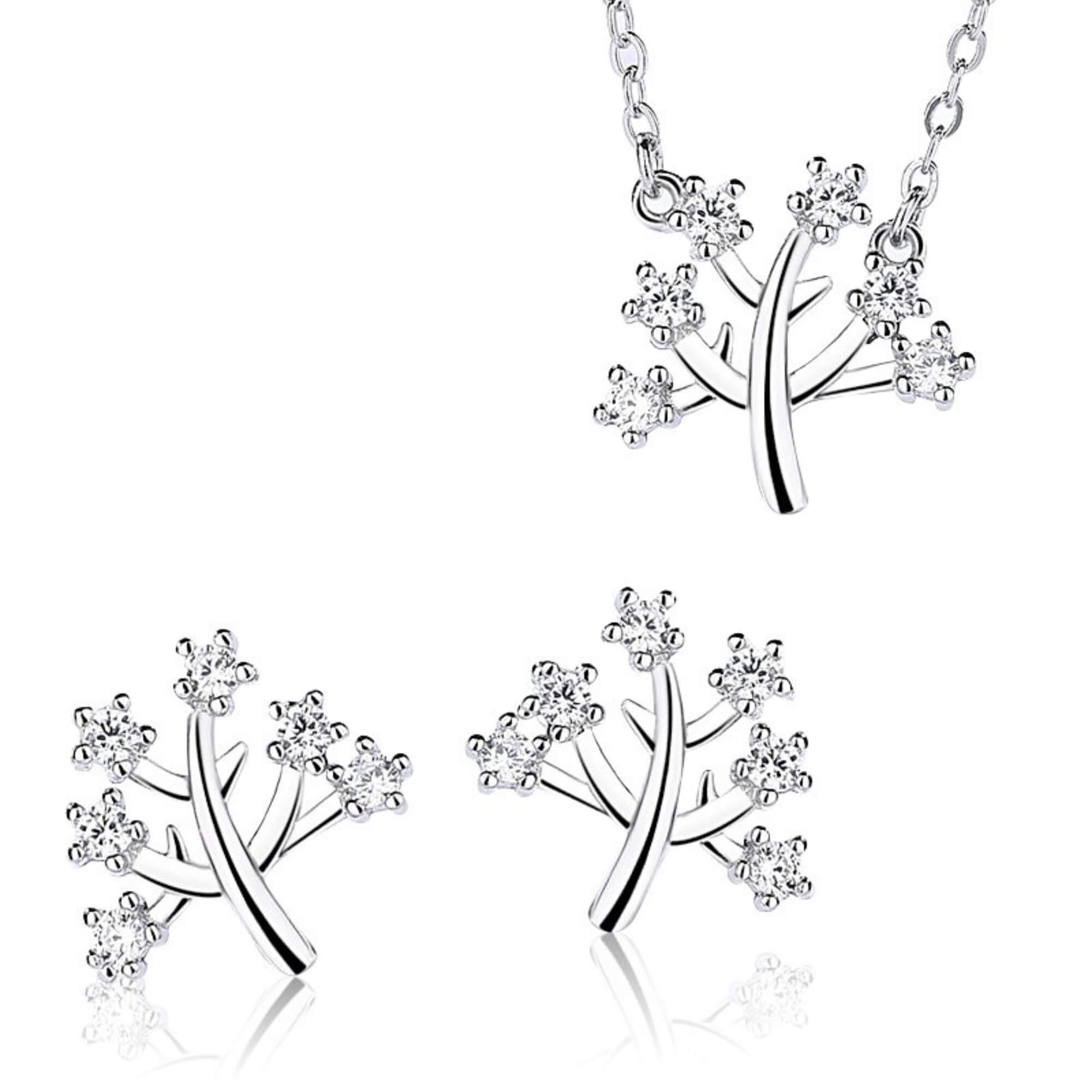 Verbind je met de symboliek van de Boom des Levens via deze sterlingzilveren set. De takken van de boom zijn op ingewikkelde wijze verfraaid met zirkonia, wat een delicate en oprechte toets geeft. Deze set weerspiegelt niet alleen liefde en harmonie, maar ook de onderlinge verbondenheid van het leven, waardoor het een betekenisvol accessoire is voor elke veeleisende vrouw.
