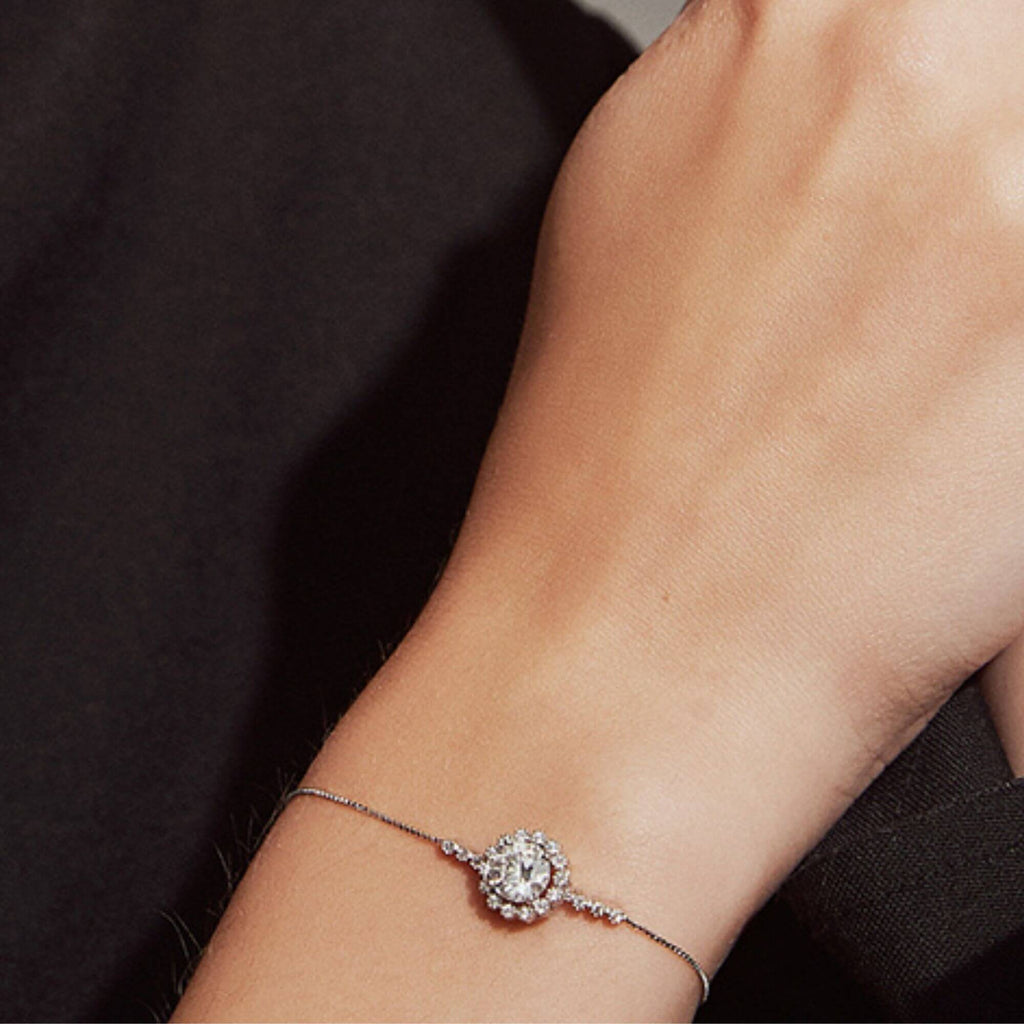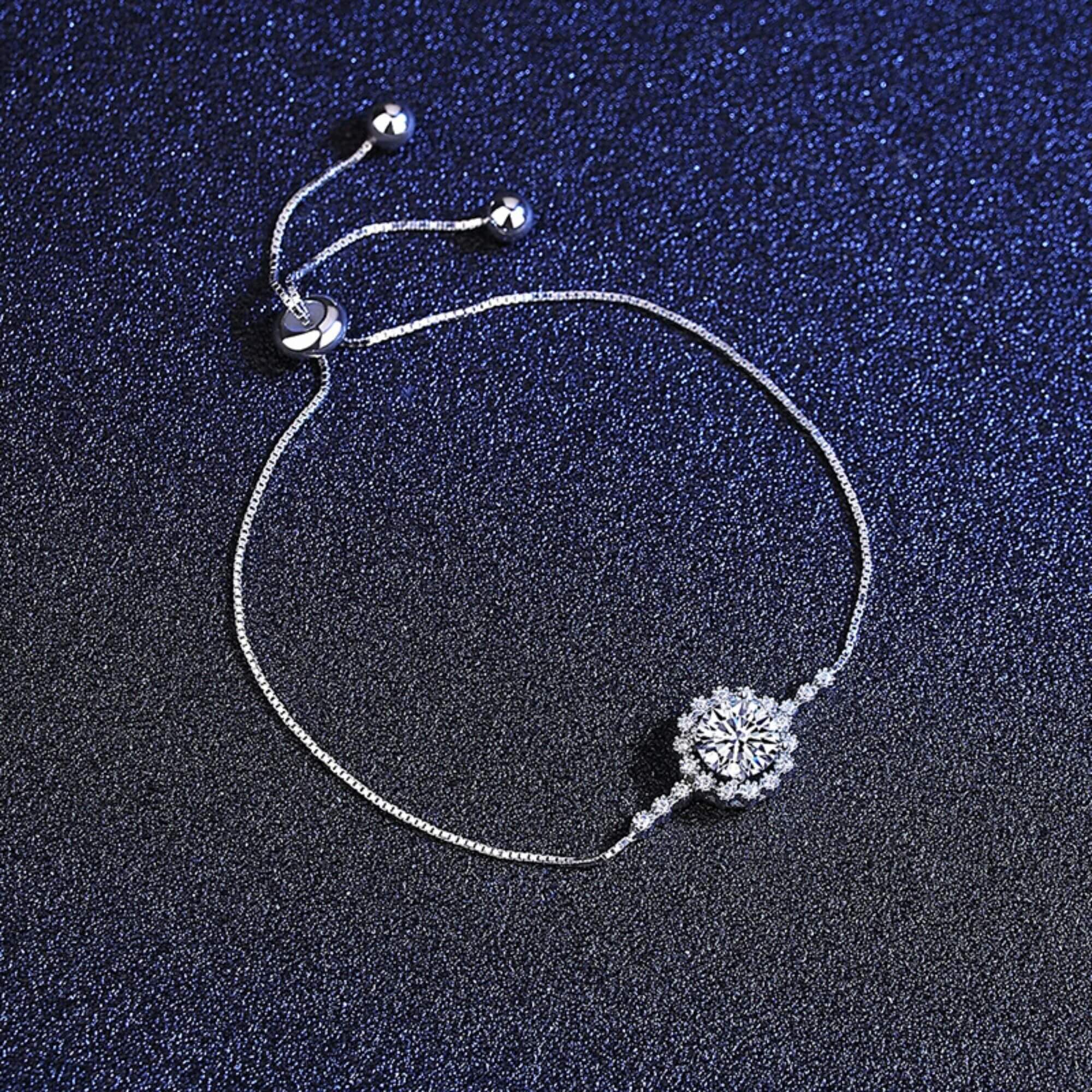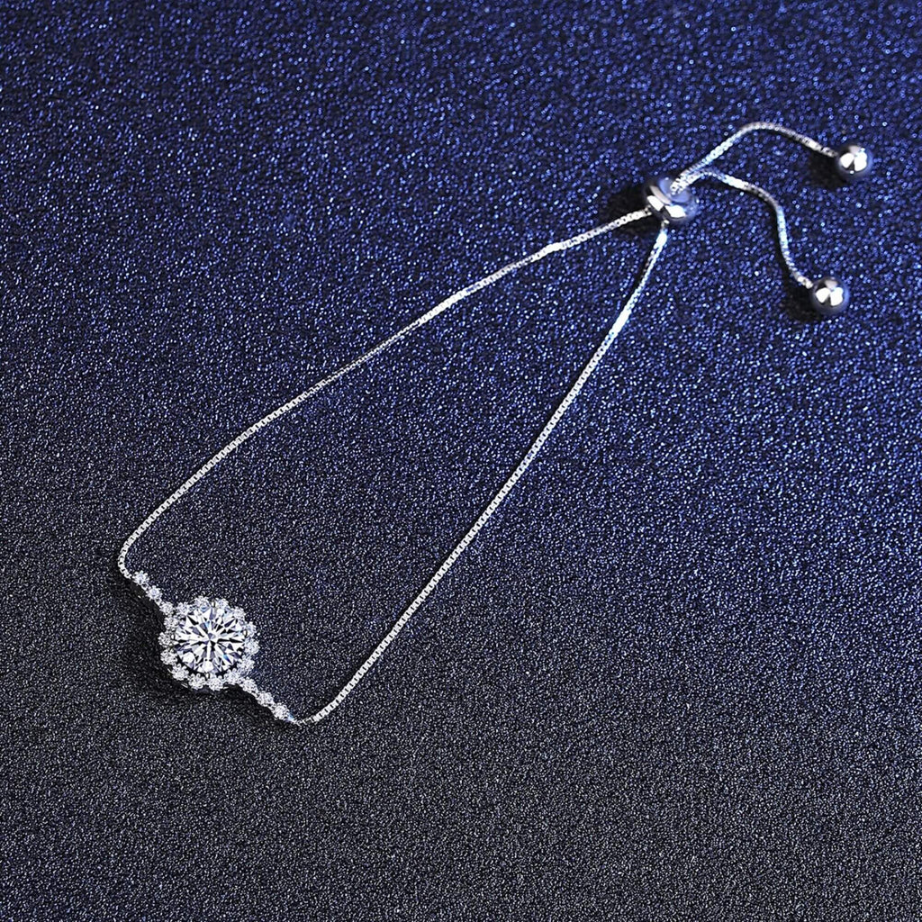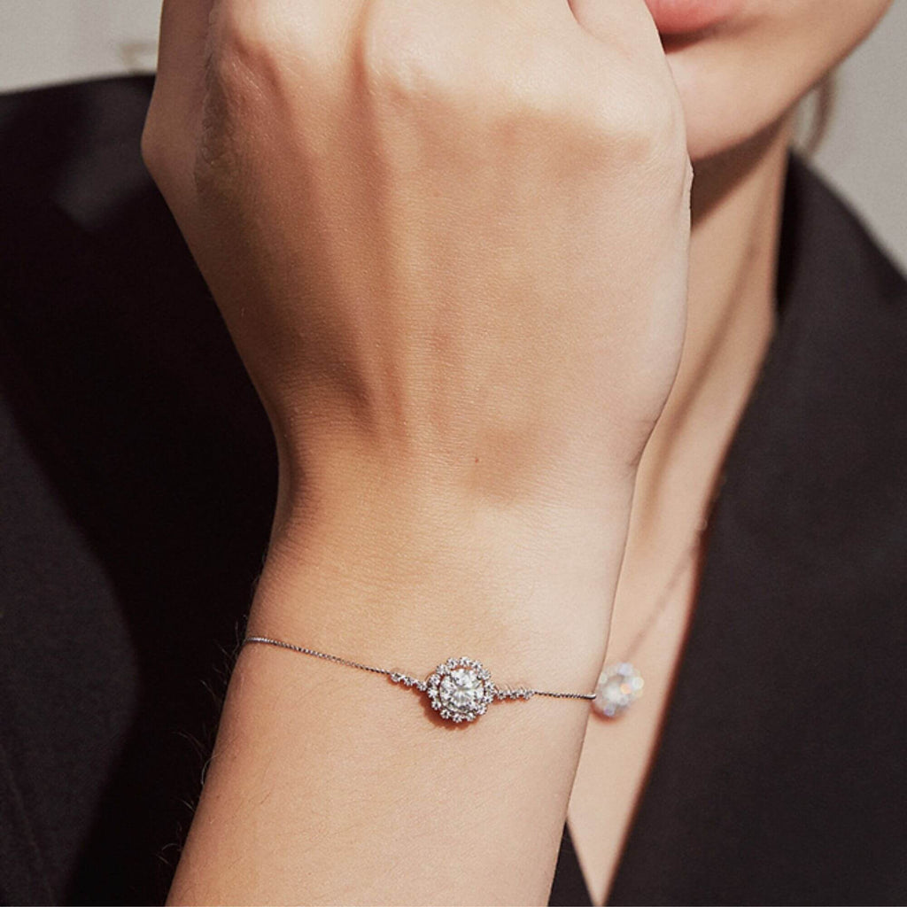 Prachtig zilveren armband met een ovaal element dat doet denken aan een delicate bloem. In het hart vangt een prachtige Moissanite-edelsteen het licht op, waardoor een betoverende schittering ontstaat die werkelijk onweerstaanbaar is. Het ontwerp van deze armband, gecombineerd met zijn uitzonderlijke kwaliteit, maakt het een winnende keuze voor diegenen die zowel elegantie als vakmanschap waarderen.