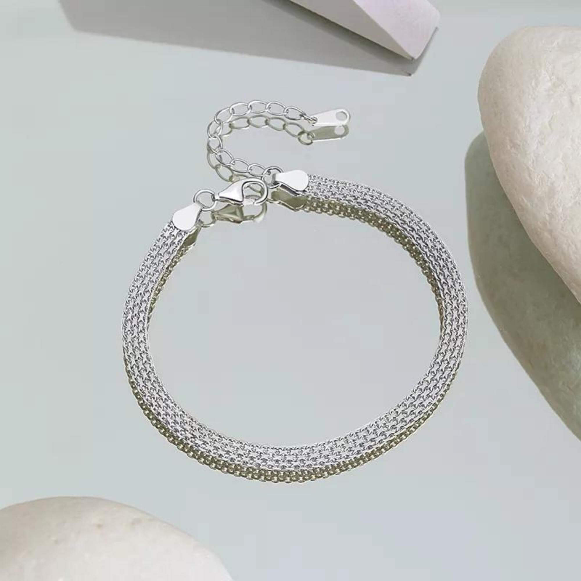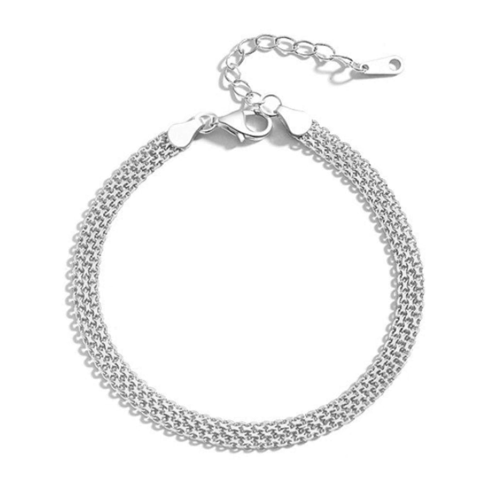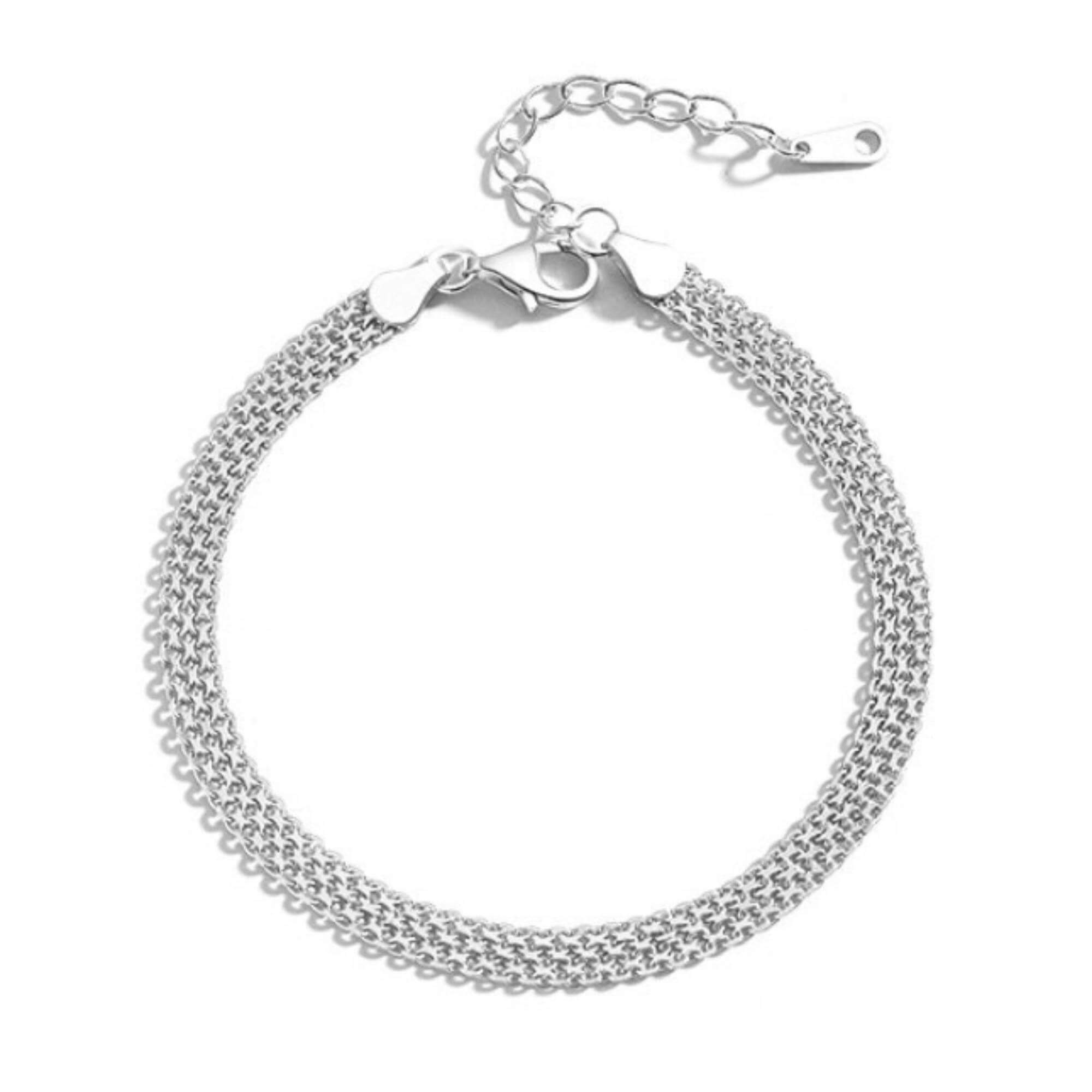 Betreed het rijk van strakke elegantie met onze zilveren armband, met een minimalistisch plat gevlochten ontwerp. Dit veelzijdige kledingstuk is een naadloze aanvulling op zowel formele als casual looks en tilt je stijl naar een hoger niveau met zijn eenvoudige maar opvallende schoonheid.