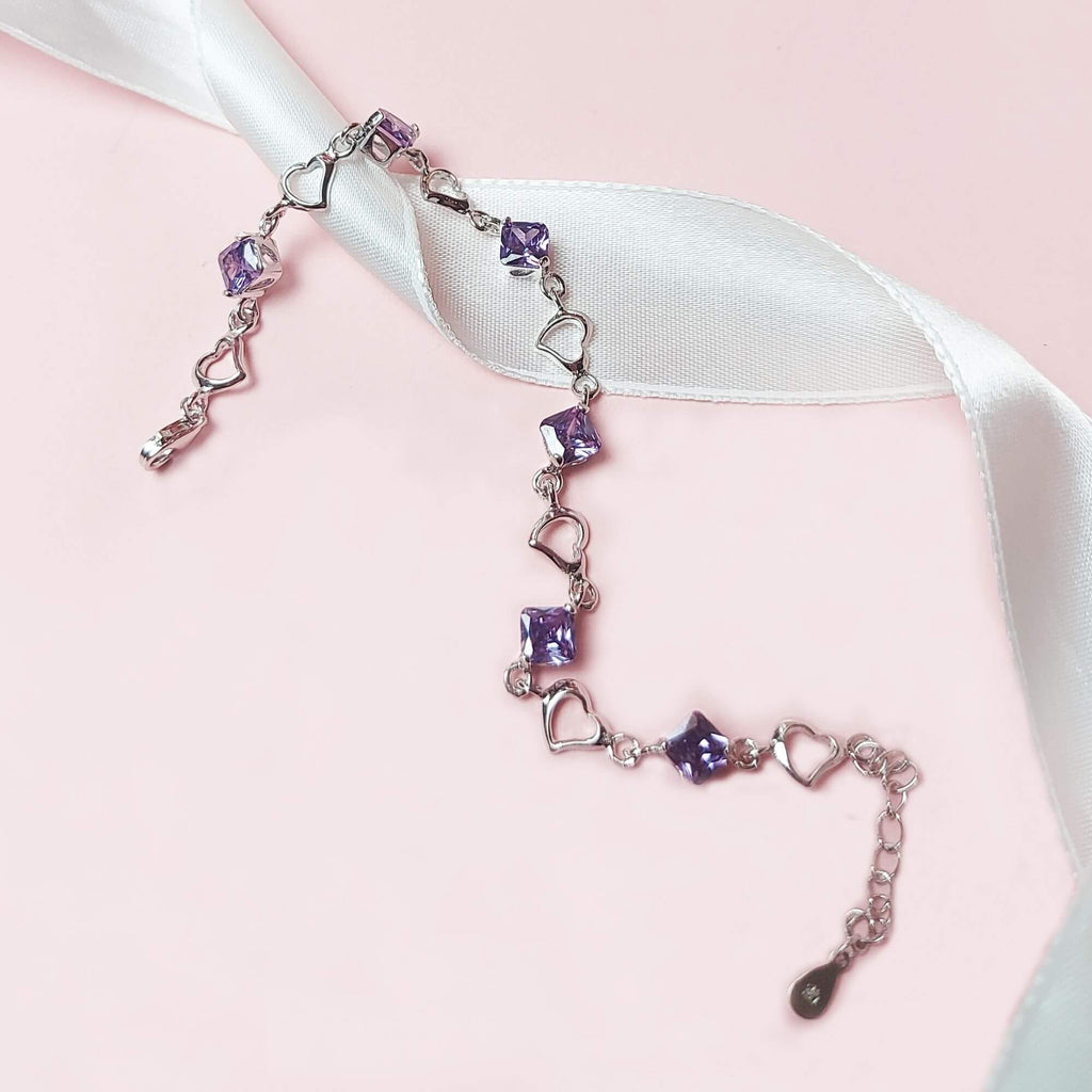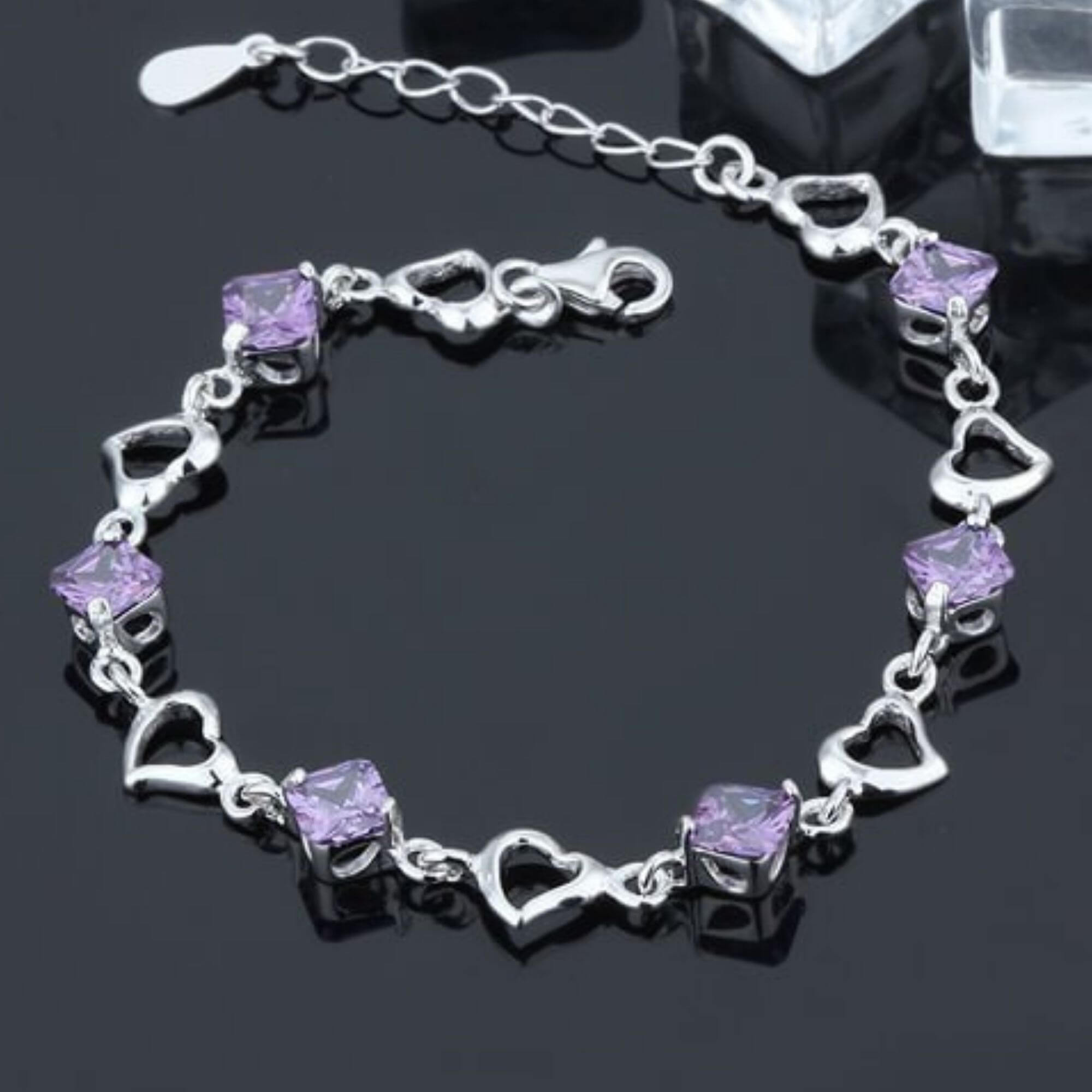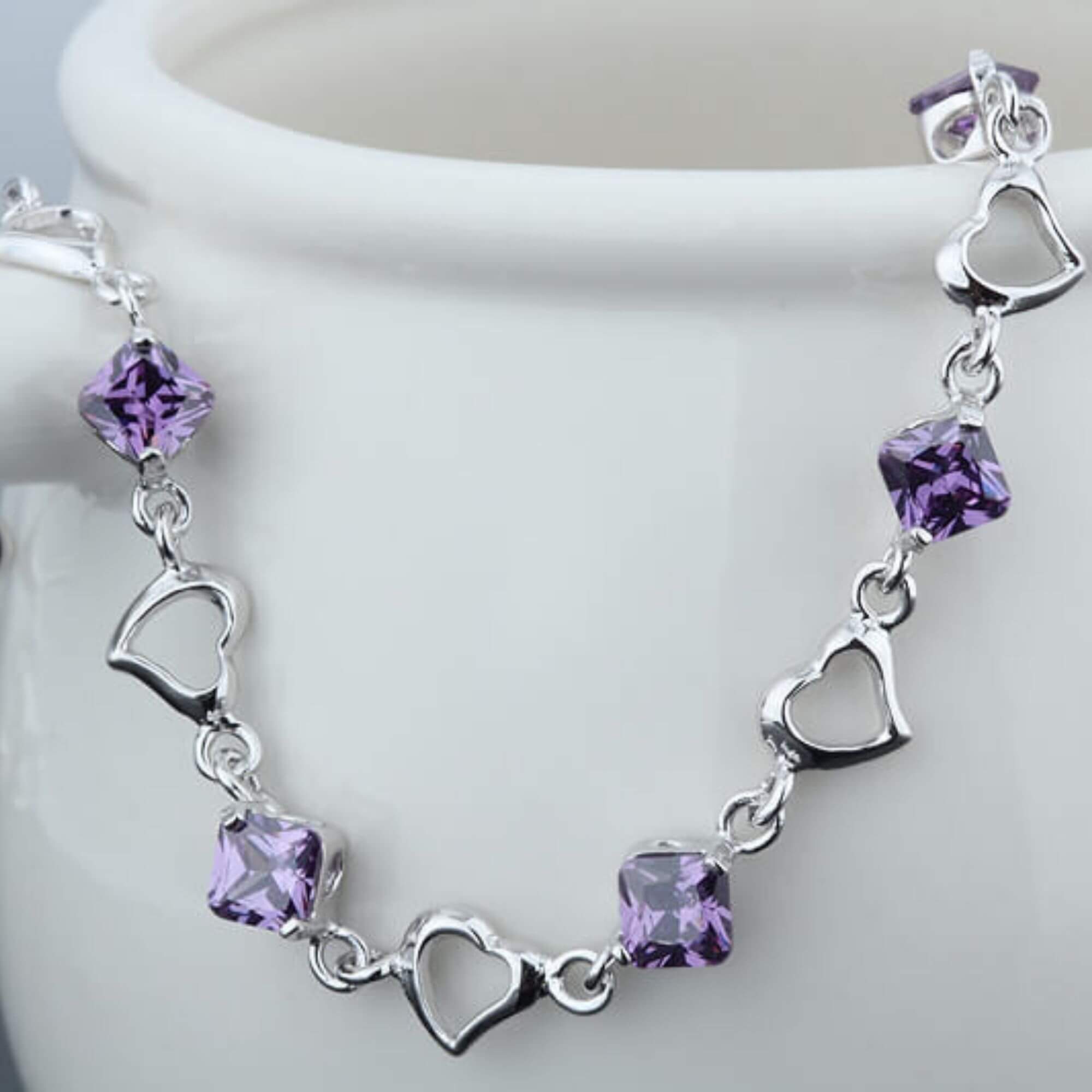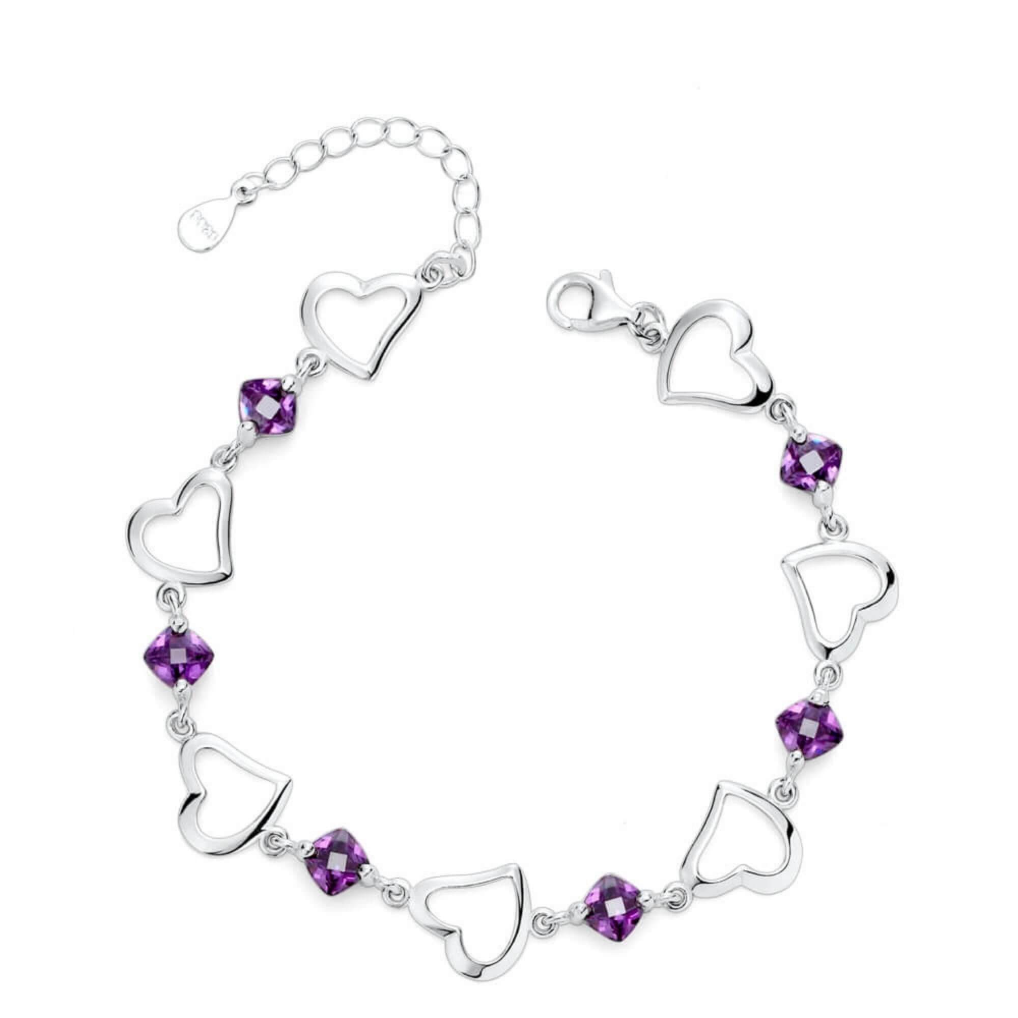 Word verliefd op de romantische charme van deze zilveren armband. Het beschikt over een uniek patroon van dertien afwisselende elementen, waaronder zeven zilveren harten en zes paarse kristallen. Deze samensmelting van romantiek en stijl creëert een tijdloos stuk, voorbestemd om een geliefd onderdeel van je collectie te worden.