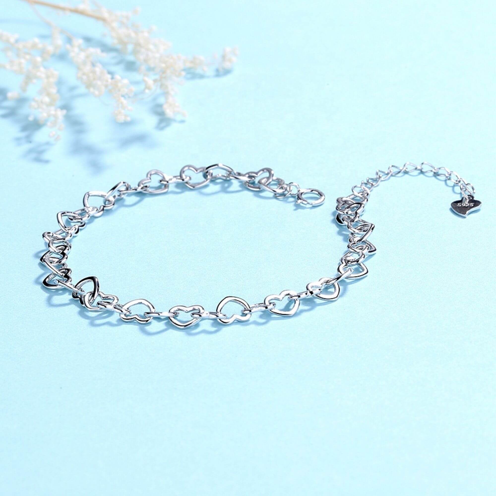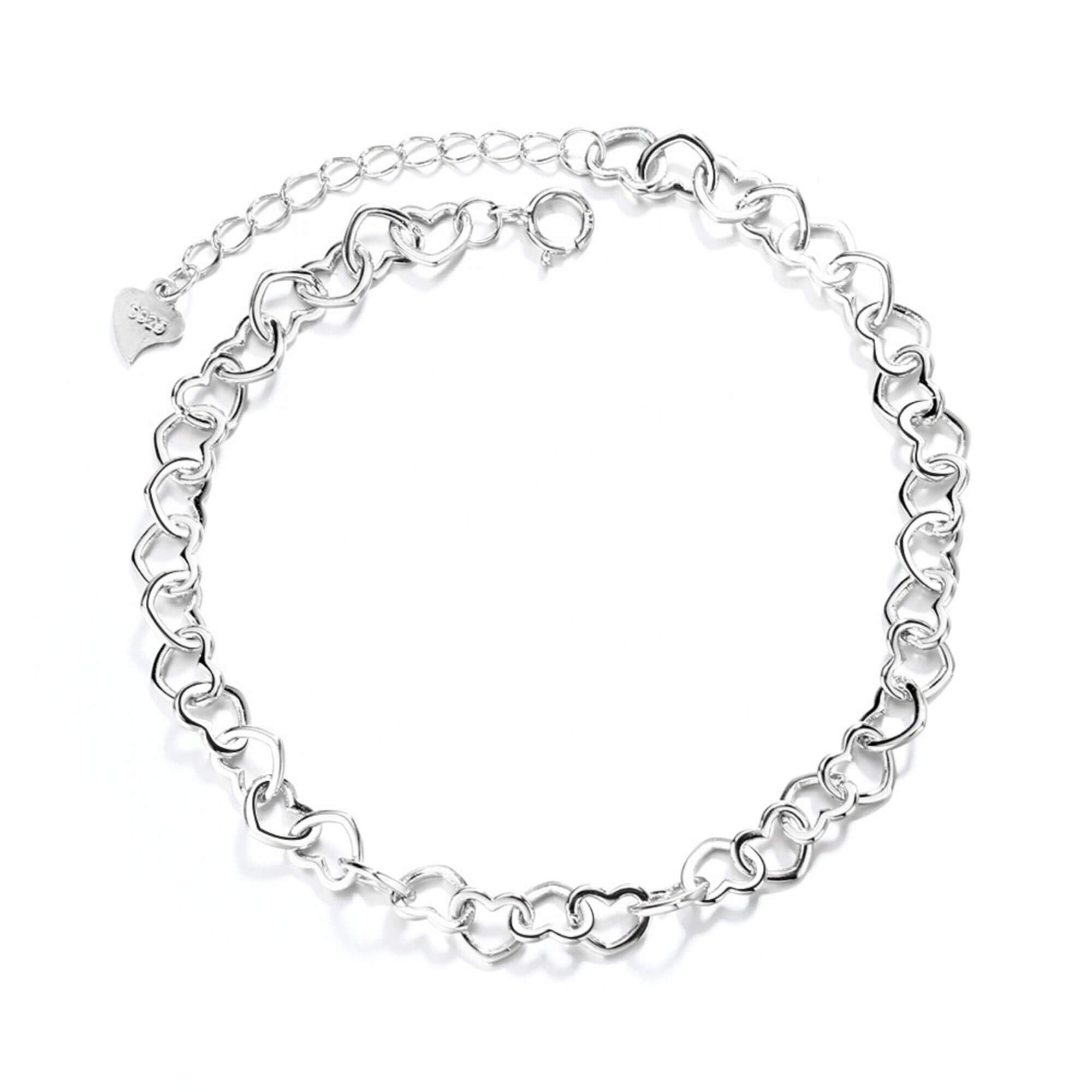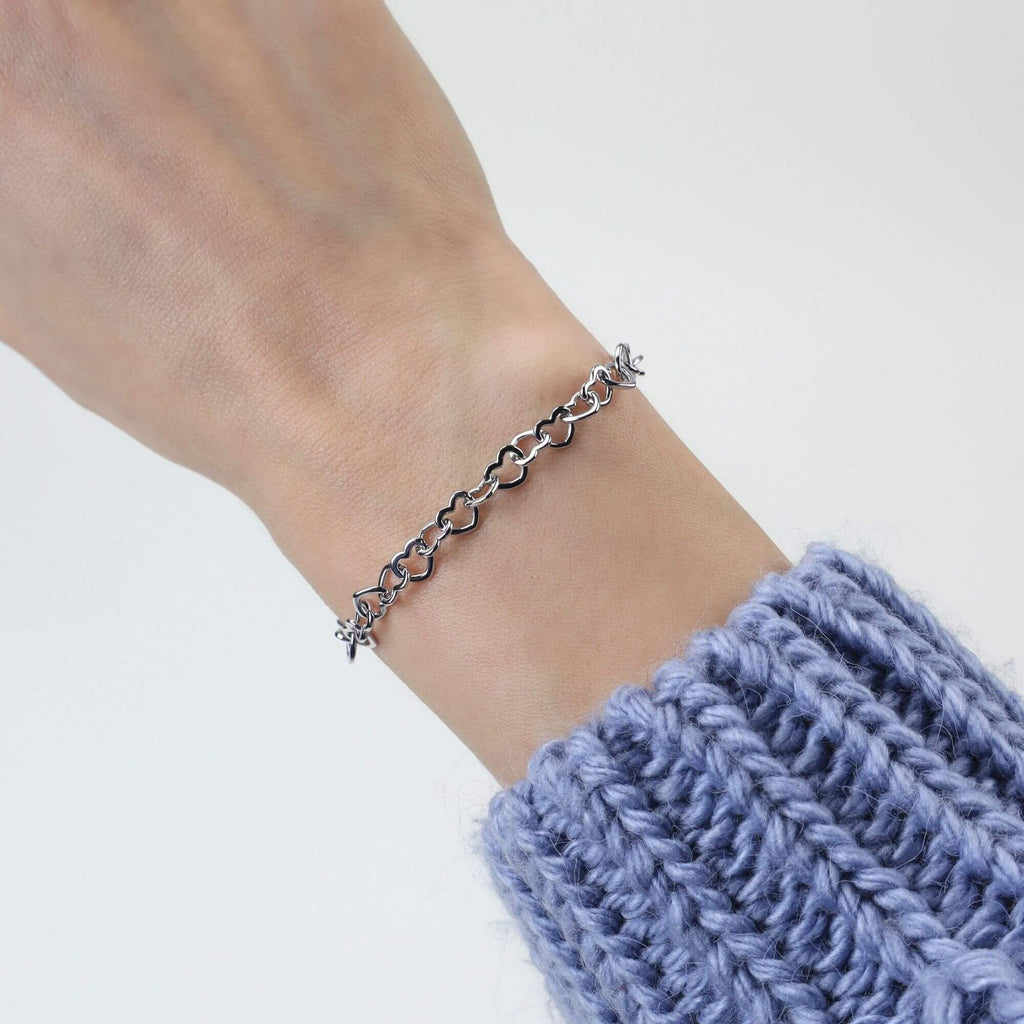 Voeg een vleugje romantiek toe aan je kleding met deze zilveren armband, met een ketting van onderling verbonden harten. Het delicate en charmante ontwerp geeft een zacht, romantisch accent aan elke outfit en belichaamt tijdloze elegantie en stijl in zijn voortreffelijke vakmanschap.