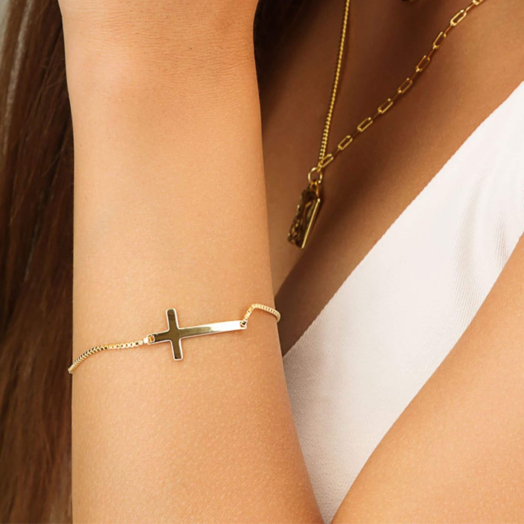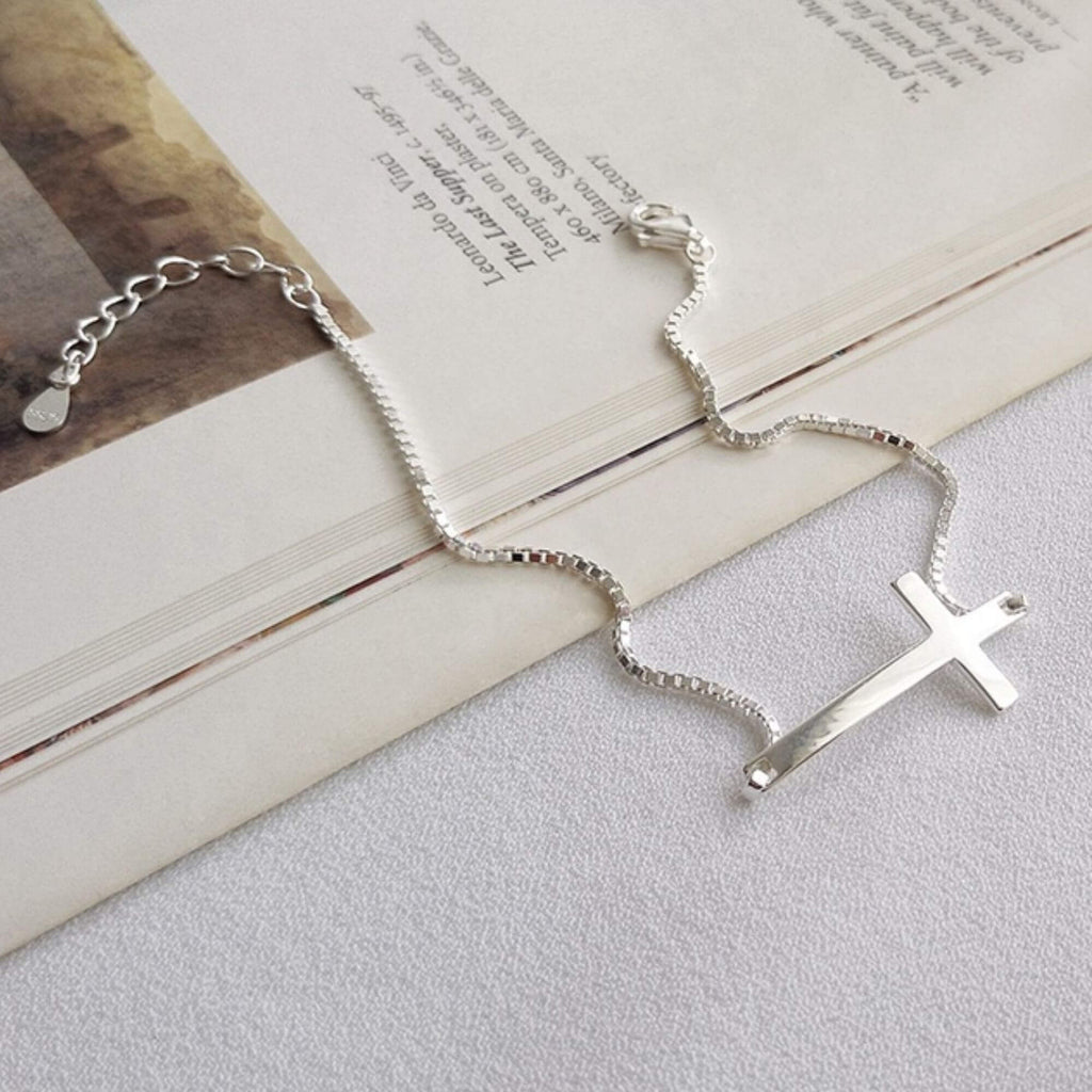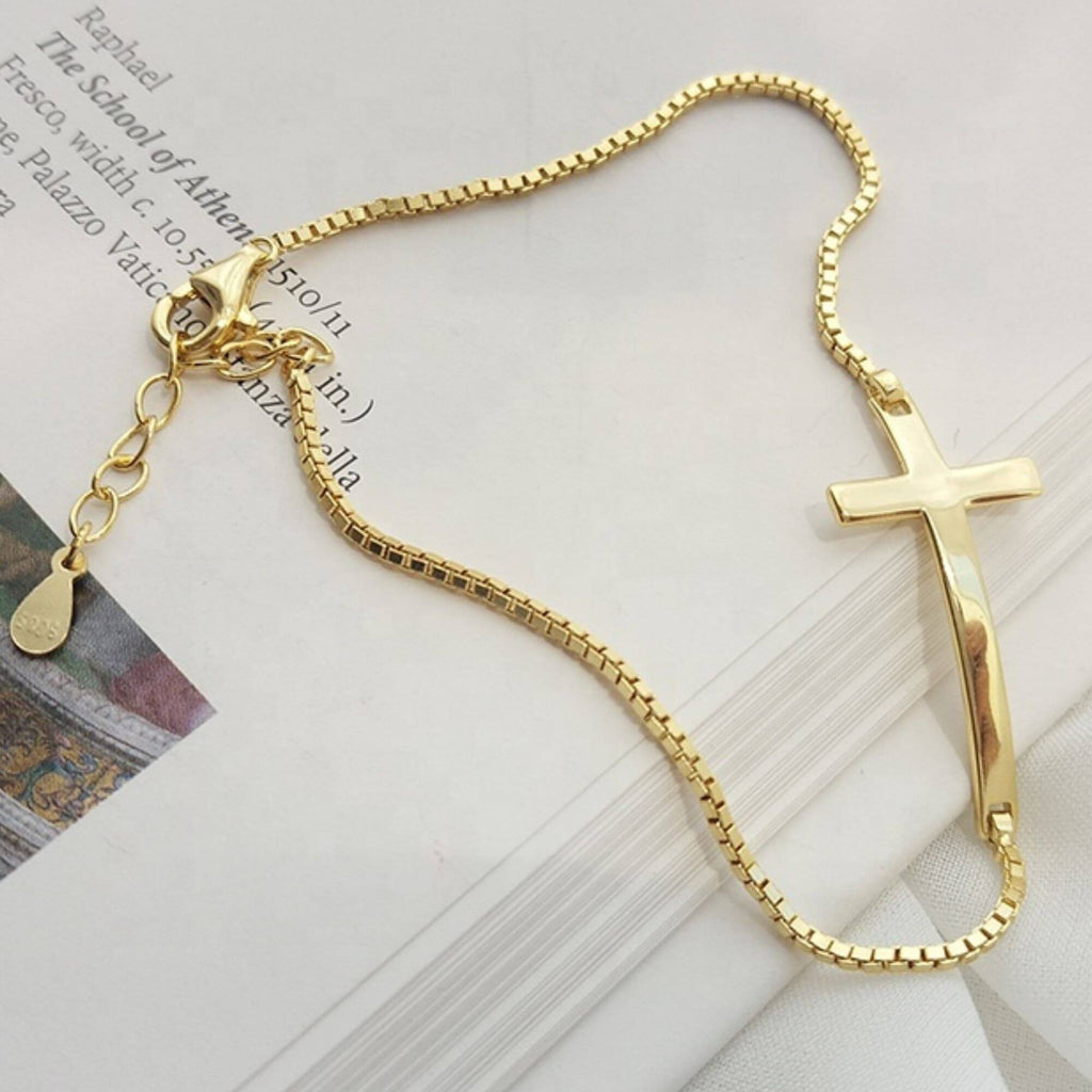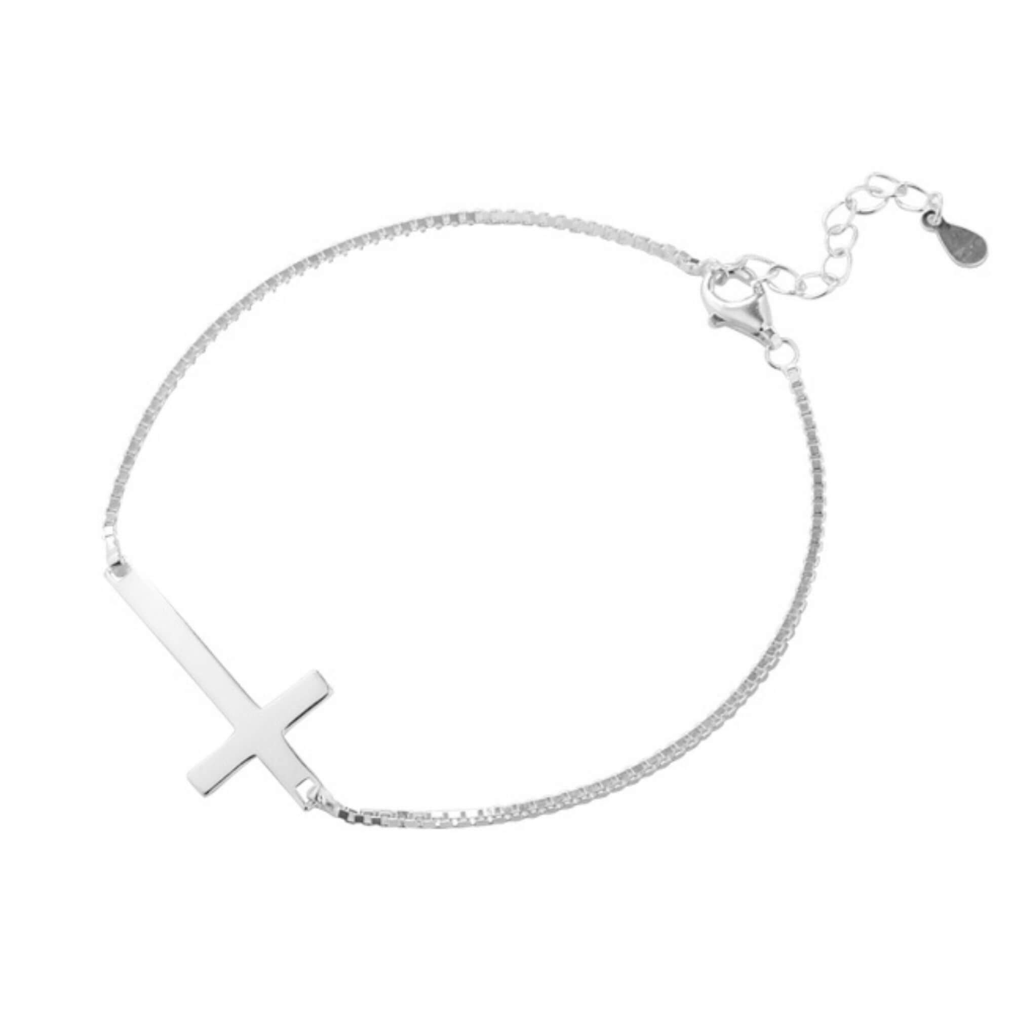 Ontdek elegantie in eenvoud met deze zilveren armband met een gevlochten ketting en een kruishanger, verkrijgbaar in twee boeiende varianten: sterling zilver en 18k verguld sterling zilver. Dit accessoire zal ongetwijfeld een vleugje schoonheid toevoegen aan de pols van een verfijnde en stijlvolle dame.