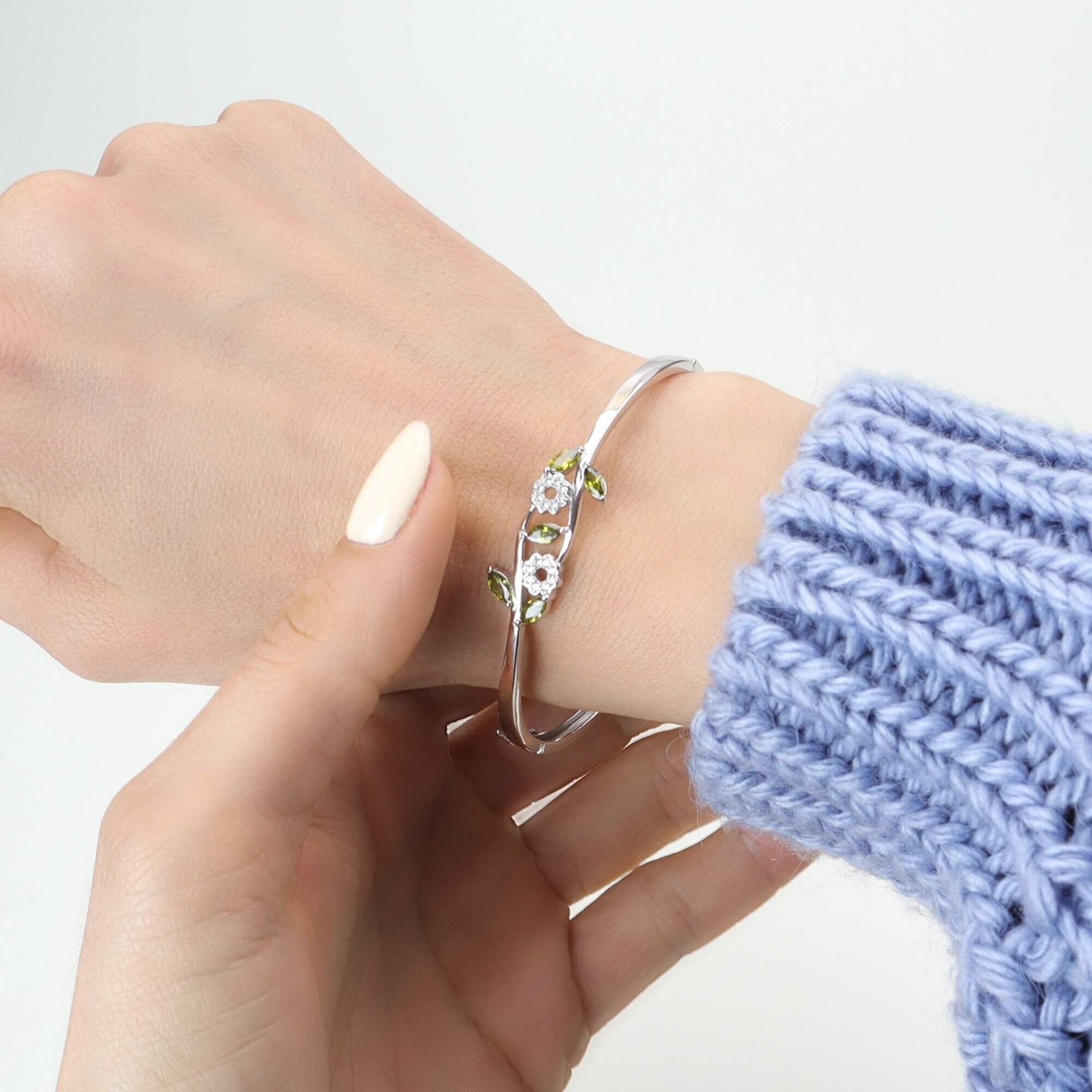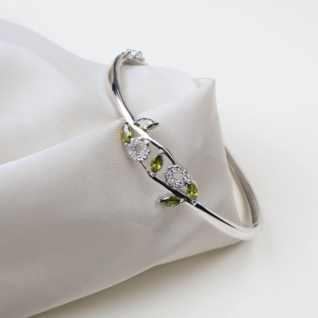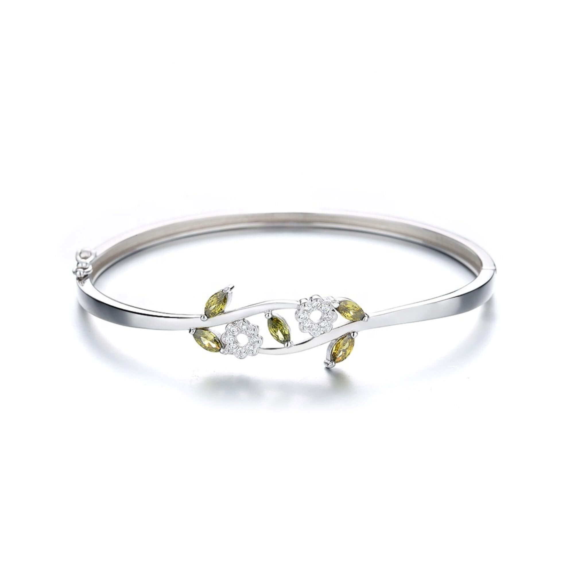 Wikkel je pols in de subtiele glans van onze sterlingzilveren armband, een sieraad waarin de tijdloze schoonheid van de natuur wordt gevangen in zilver en licht. Elk bloemblaadje en blad, getint met de warme tint van amber, is een delicate herinnering aan de zachte bloei van de lente. Deze armband, met zijn dans van glinsterende bloemen, is niet alleen ontworpen om te versieren maar ook om te betoveren - perfect om een vleugje verfijning toe te voegen aan je dag of een vleugje sprankeling aan je avond.