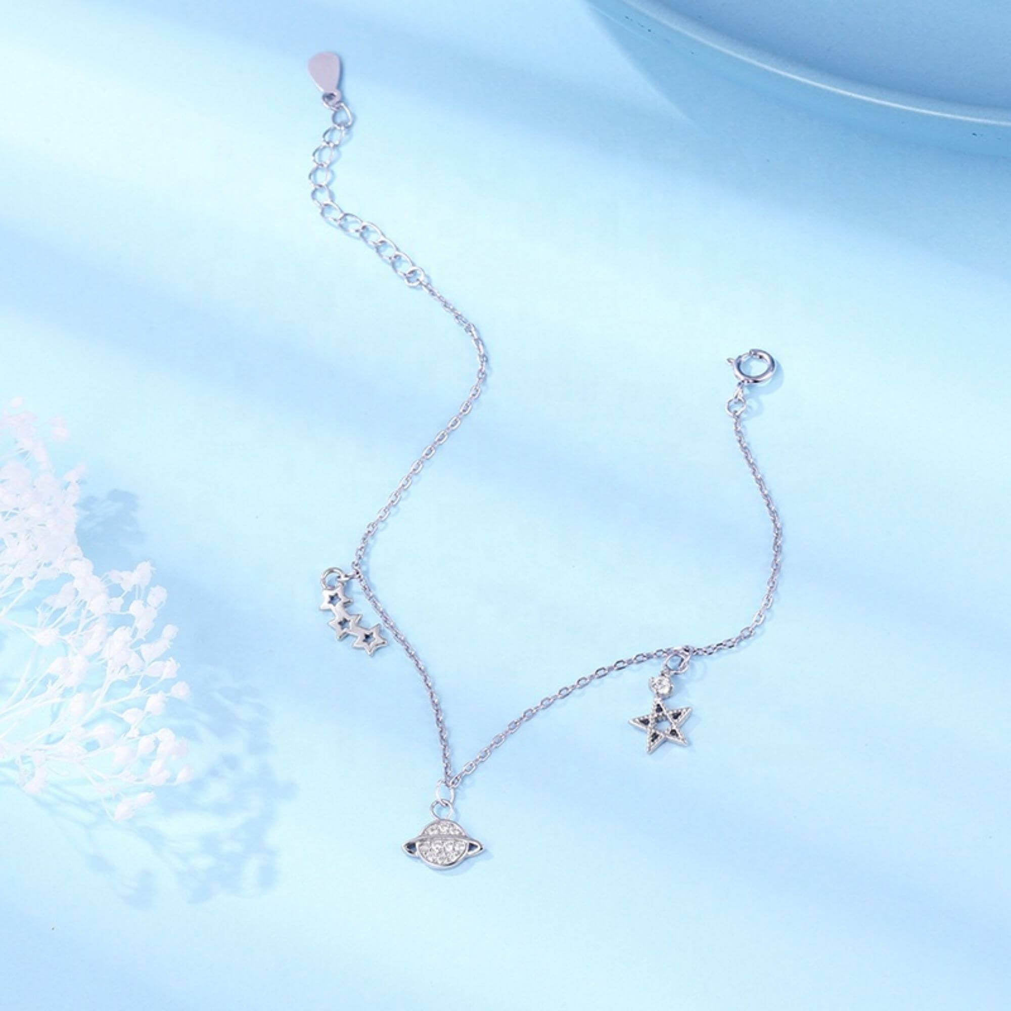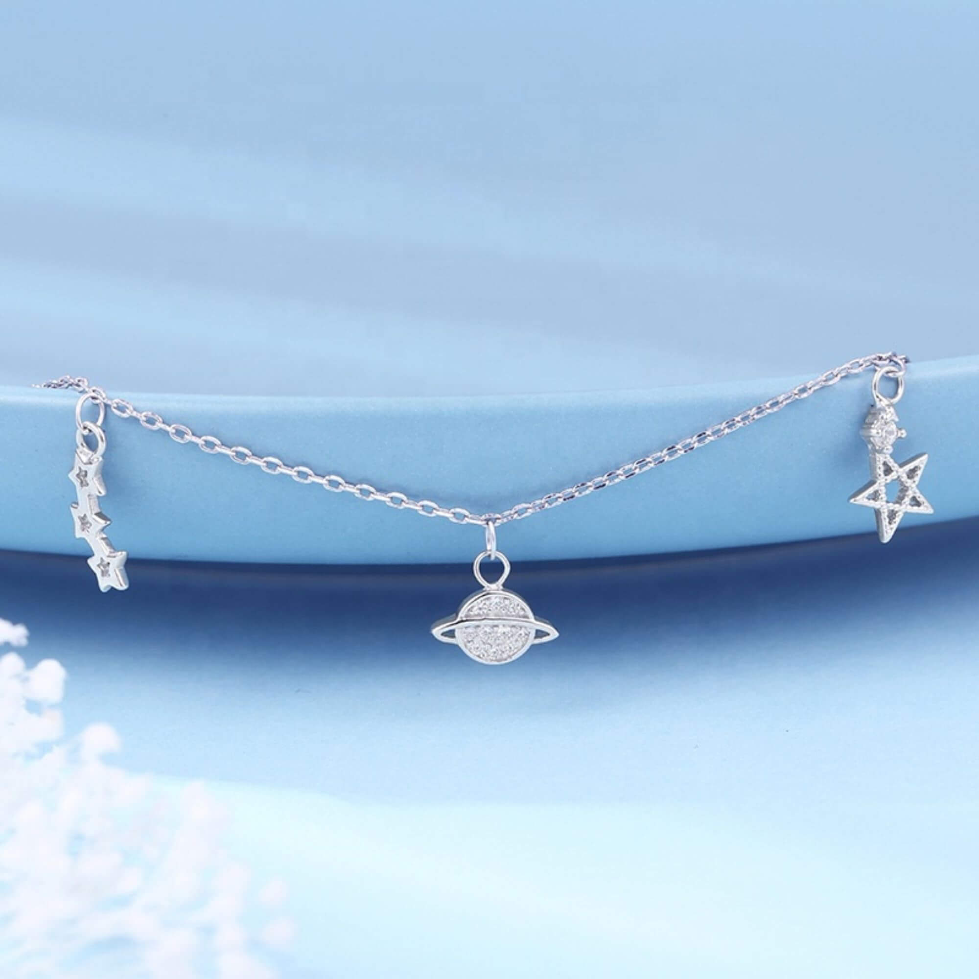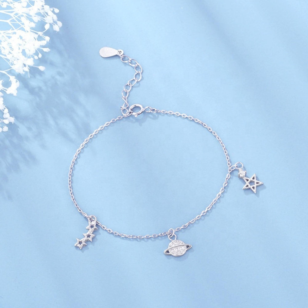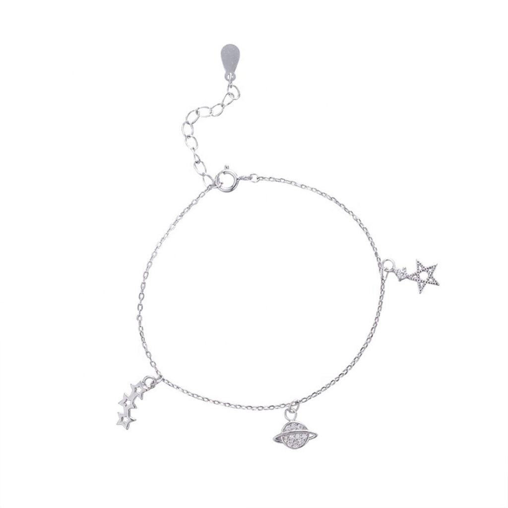 Stap in een universum van verwondering met deze uitzonderlijke zilveren armband. Het ontwerp vangt de kosmische schoonheid op, geschikt voor elke gelegenheid, van informele bijeenkomsten tot formele evenementen. Deze armband is niet zomaar een accessoire, maar eerder een hemelse reis om je pols.