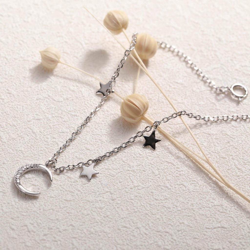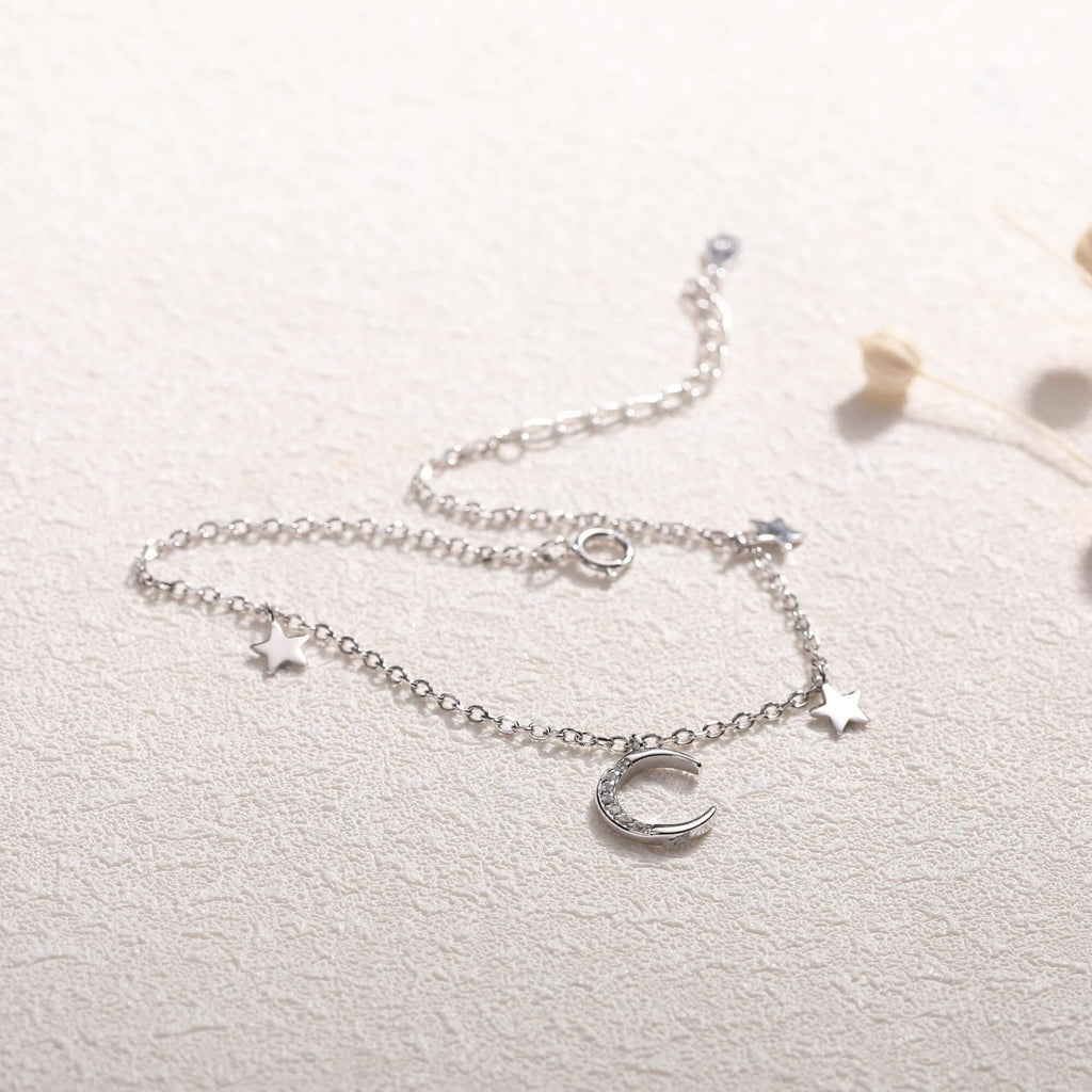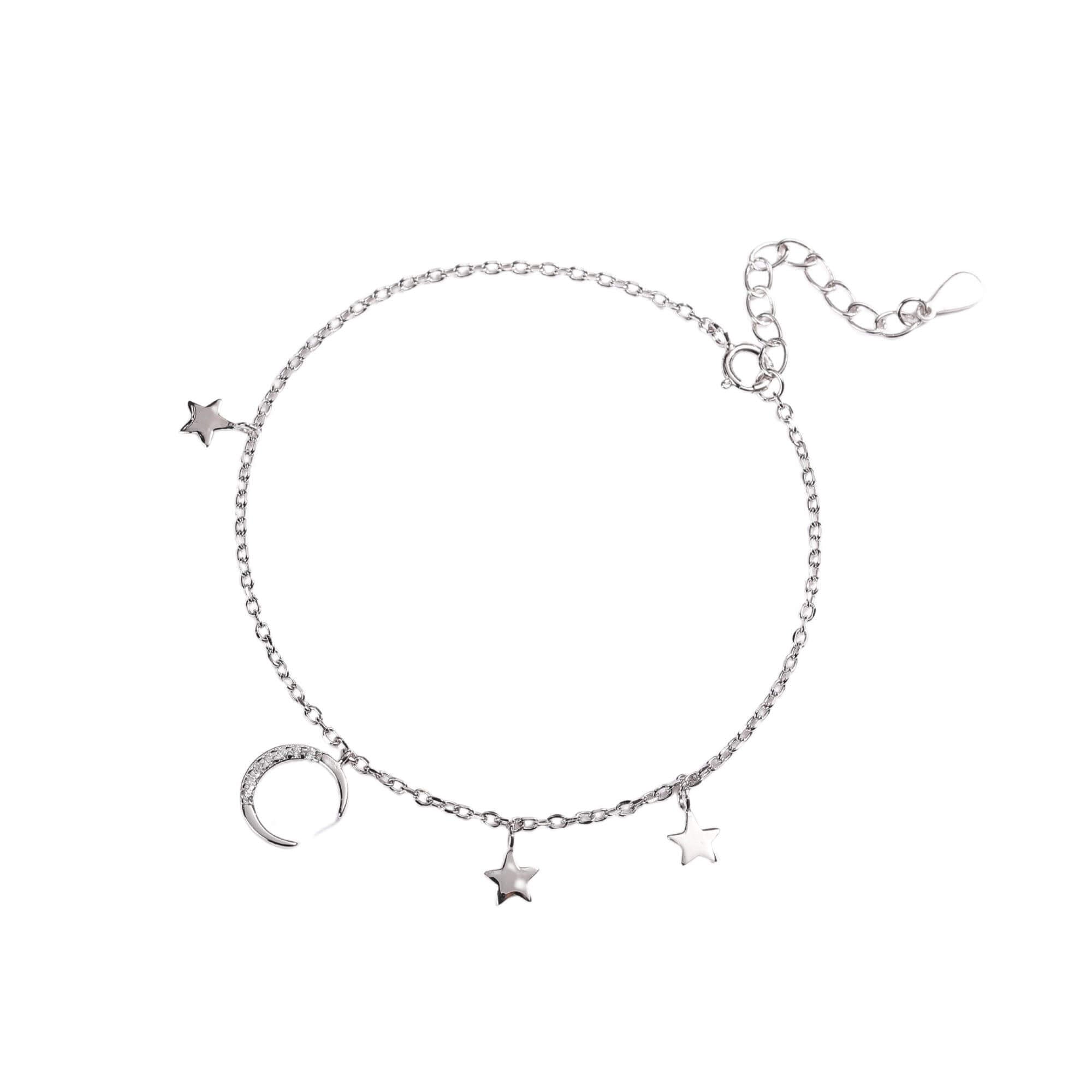 Daal het hemelse rijk binnen met onze zilveren armband, een hemels meesterwerk voor liefhebbers van astrologie. De sierlijke maansikkel en drie stralende sterren weven een kosmische dans om je pols en vangen de magie van het universum op. Perfect voor sterrenkijkers en degenen die schoonheid vinden in de kosmos. Deze armband is een symbool van jouw hemelse verbinding.