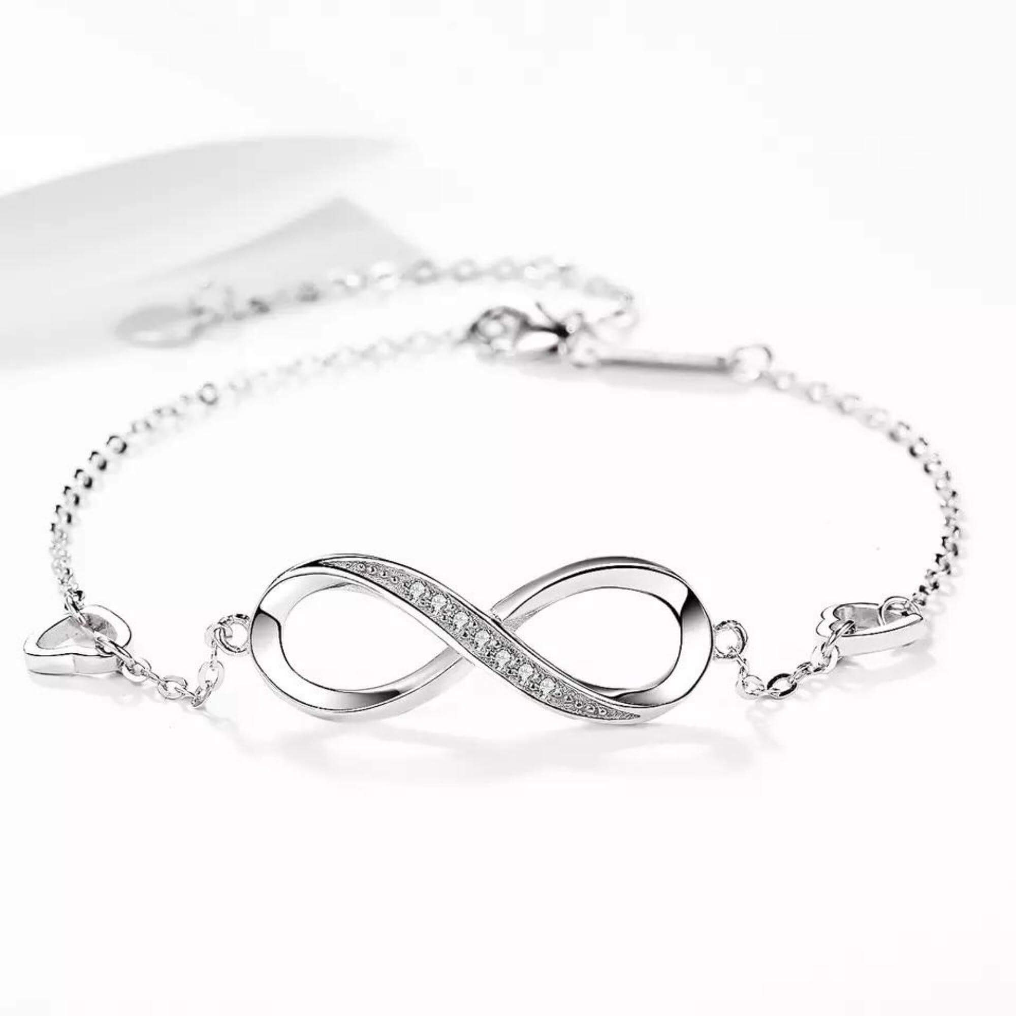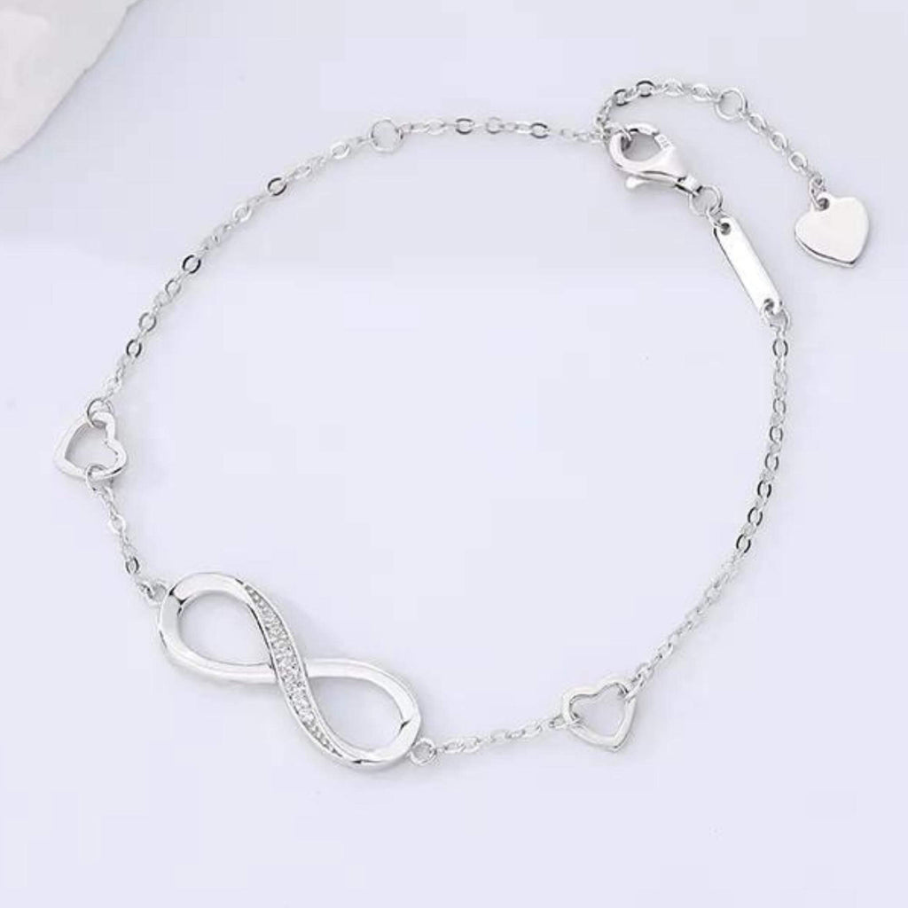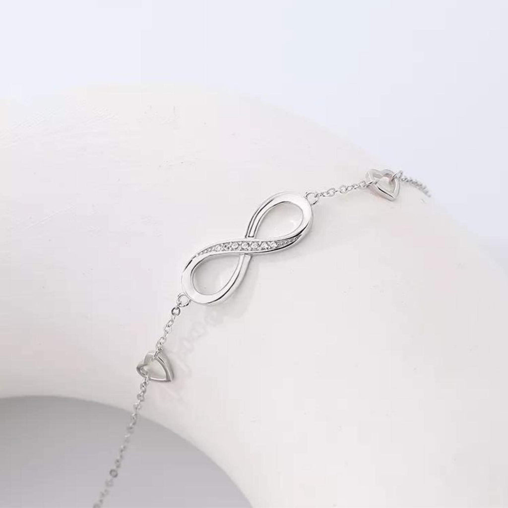 Omarm het tijdloze symbool van eeuwige liefde met deze unieke zilveren armband met een oneindigheidsontwerp. De in elkaar grijpende lussen vertegenwoordigen prachtig de onbreekbare band tussen twee personen. Vervaardigd met oog voor detail, is deze armband de perfecte keuze om je diepe genegenheid en toewijding aan een geliefde te uiten. Het elegante en sentimentele ontwerp maakt het een romantisch geschenk dat jarenlang gekoesterd zal worden.